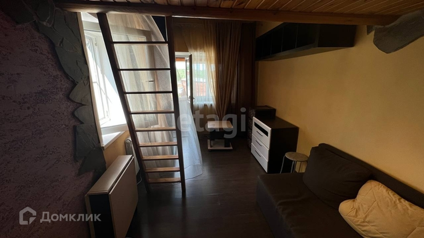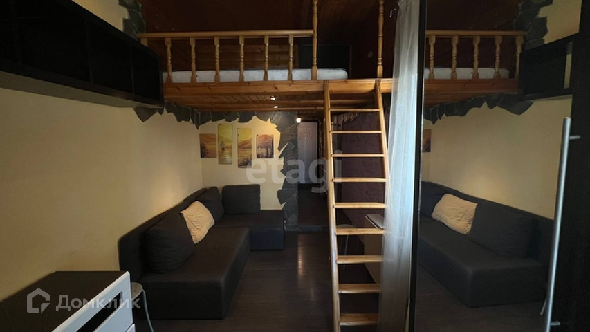 Двухъярусная основная комната: на втором ярусе расположено спальное место и вместительная антресоль.