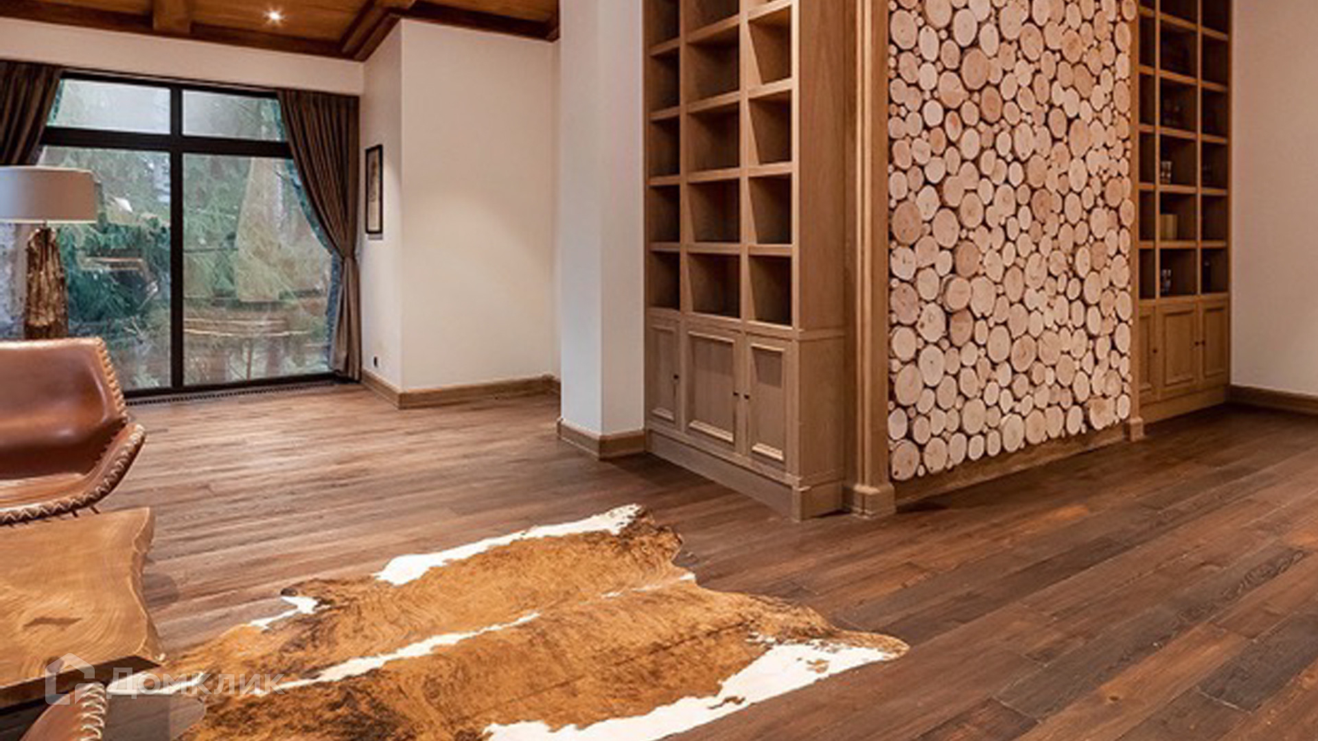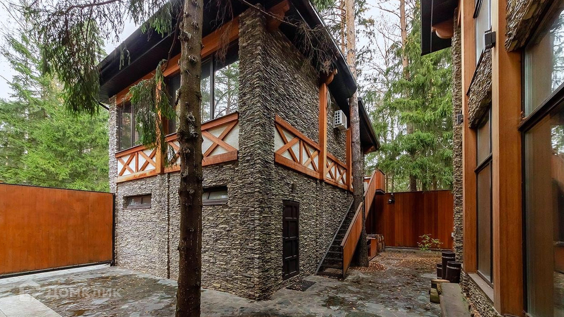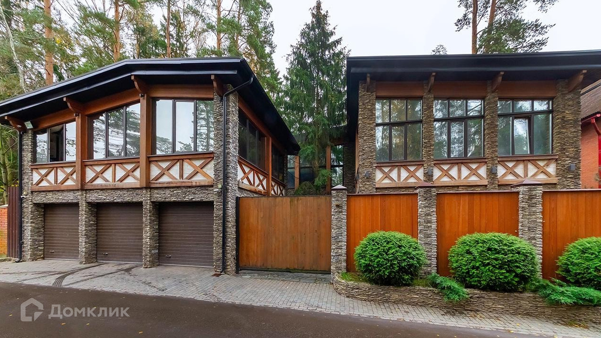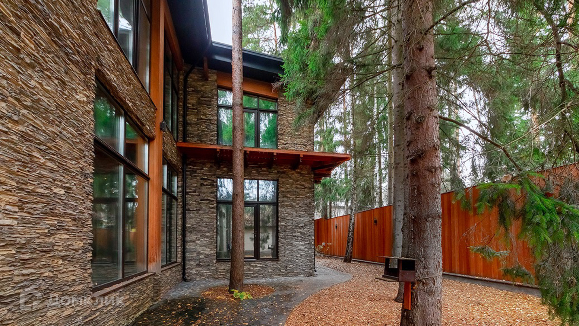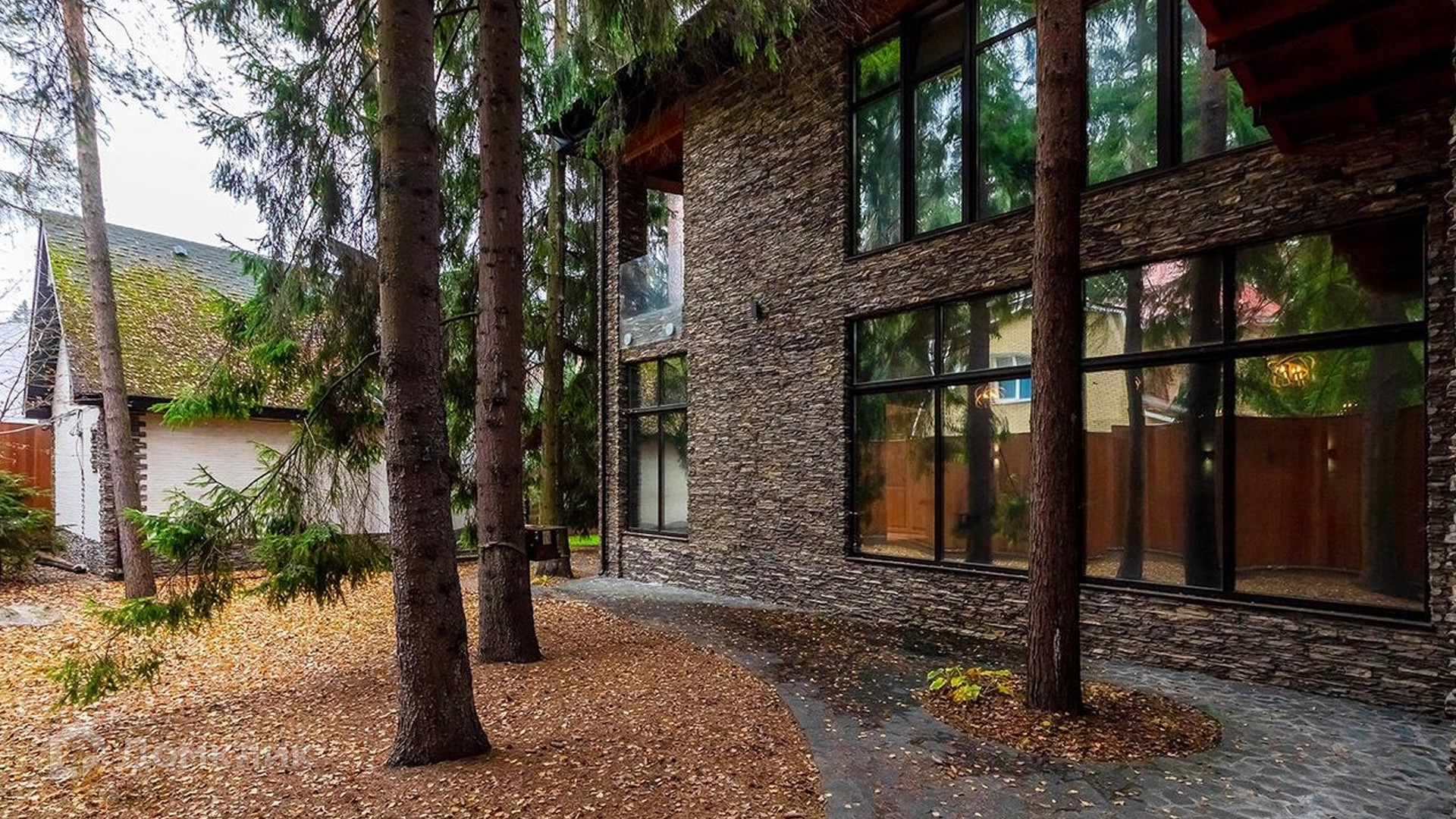 ID 9 168. Липка СПК. Резиденция в стиле «эко», дом для персонала и гараж для 3 машин расположены на лесном участке 15 соток. Фасад главного дома 900 м² в райтовском стиле облицован натуральным камнем. Внутри выполнена отделка из натуральных материалов и полная меблировка. На первом этаже в гостиной дровяной камин облицован натуральным мрамором, кожаный диван и кресла Ralf Lauren. В итальянскую кухню Scavolini встроили технику Kupperbuch. В столовой стулья из массива дуба и нубука, люстры испанского бренда Loft it. В доме разведена акустика. Бассейн декорирован натуральным камнем и оборудован системой внутренней очистки, озонирования и подогрева.
