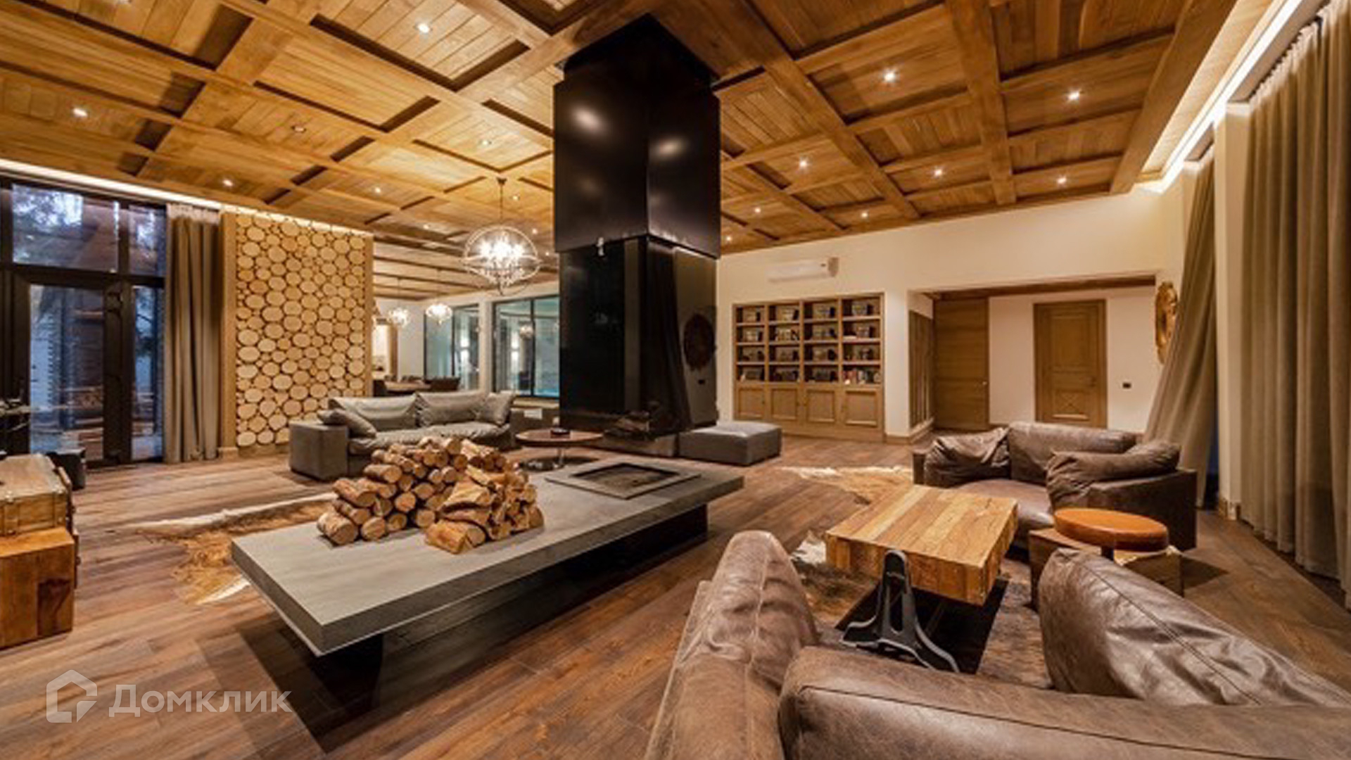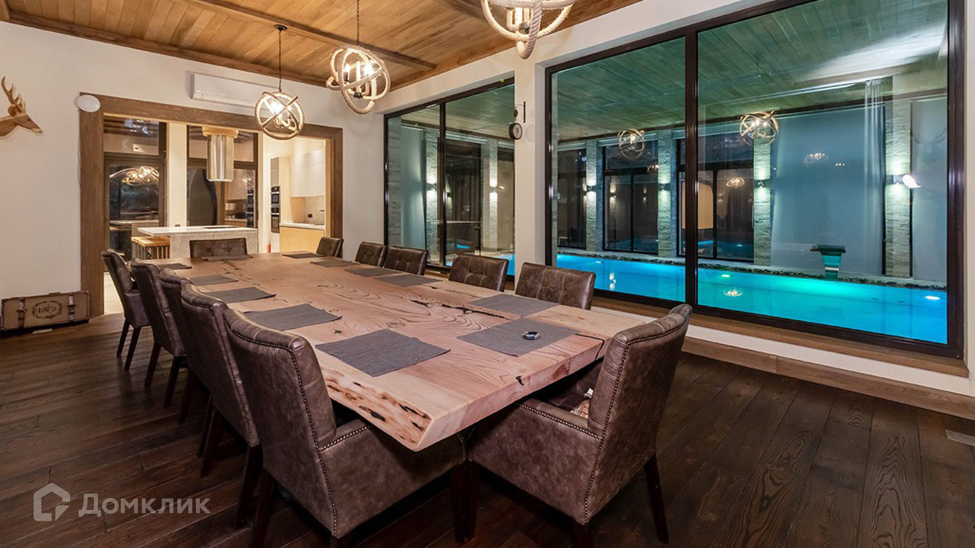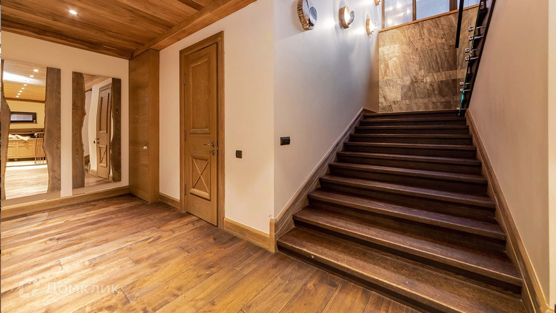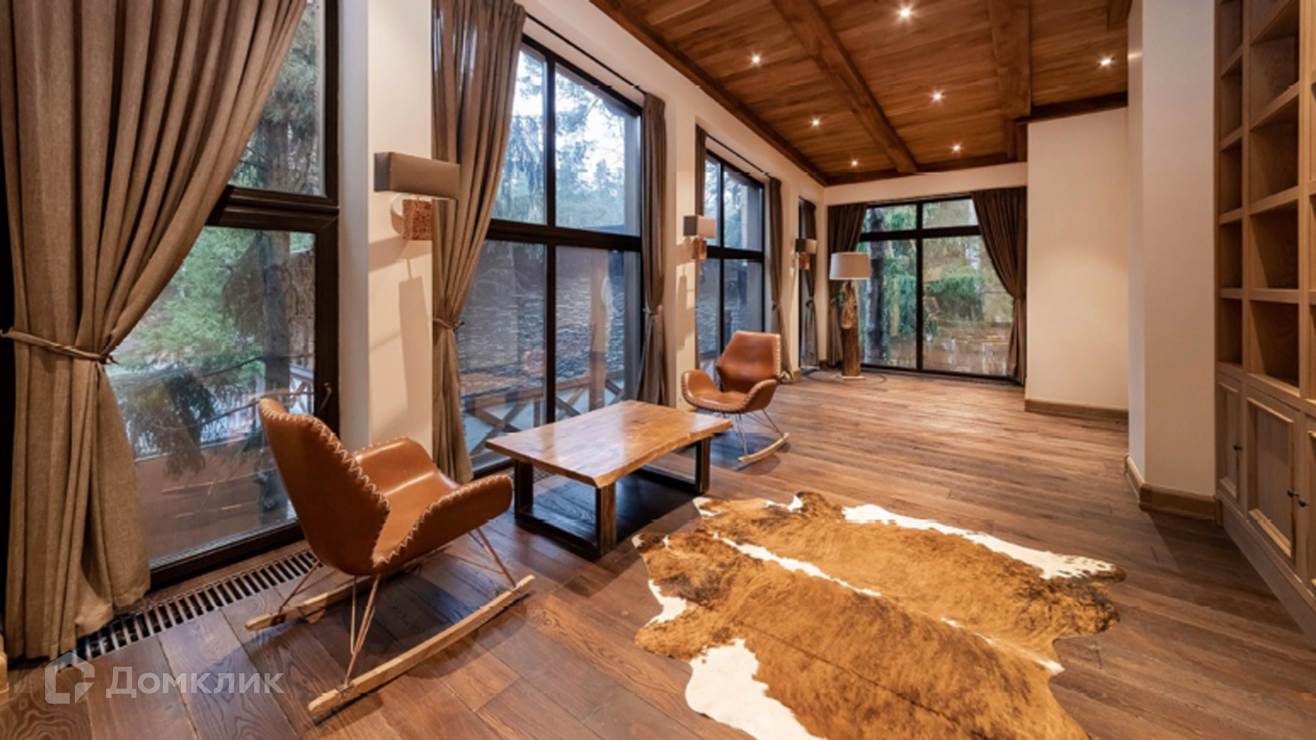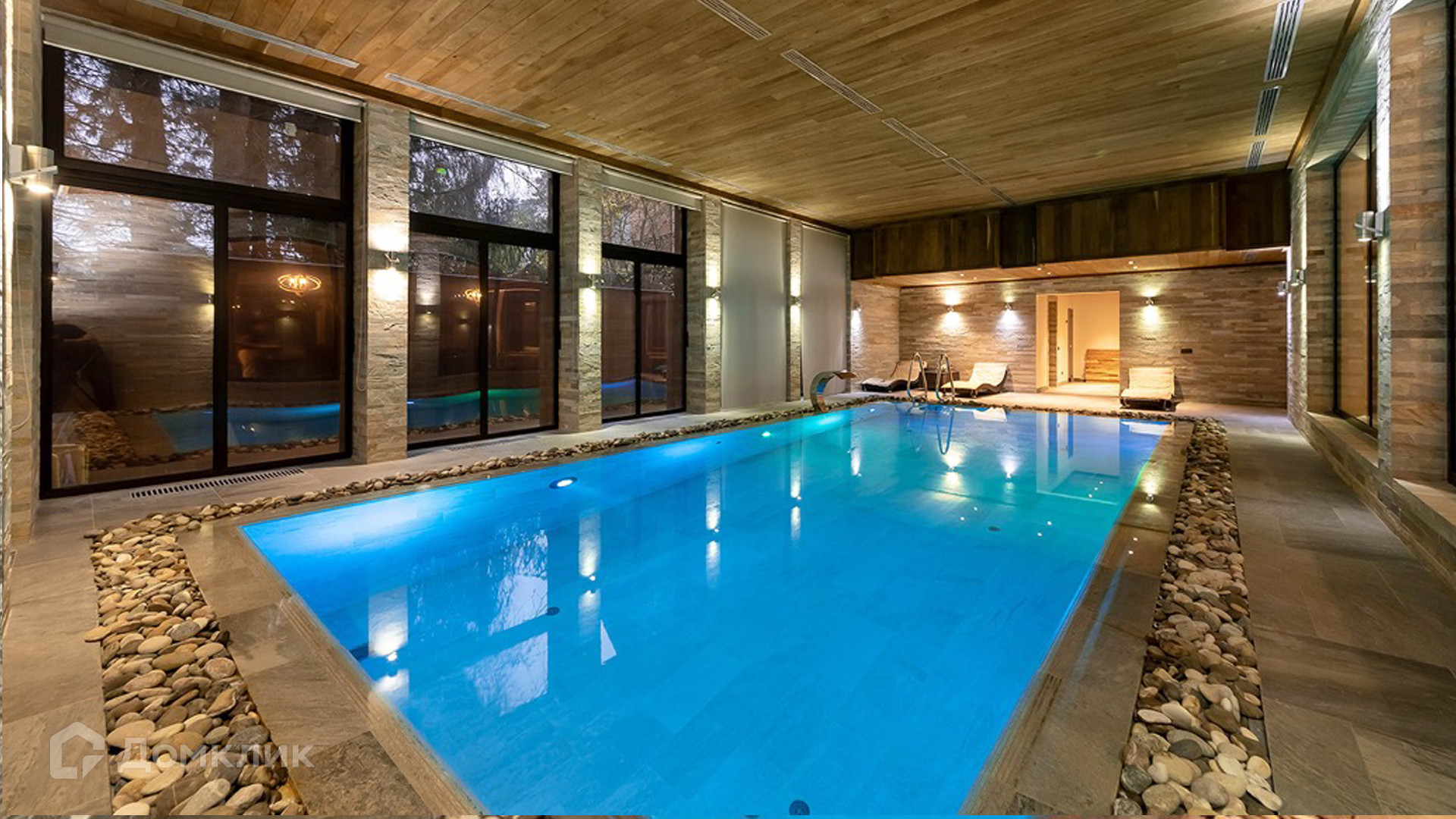 ID 9 168. Липка СПК. Резиденция в стиле «эко», дом для персонала и гараж для 3 машин расположены на лесном участке 15 соток. Фасад главного дома 900 м² в райтовском стиле облицован натуральным камнем. Внутри выполнена отделка из натуральных материалов и полная меблировка. На первом этаже в гостиной дровяной камин облицован натуральным мрамором, кожаный диван и кресла Ralf Lauren. В итальянскую кухню Scavolini встроили технику Kupperbuch. В столовой стулья из массива дуба и нубука, люстры испанского бренда Loft it. В доме разведена акустика. Бассейн декорирован натуральным камнем и оборудован системой внутренней очистки, озонирования и подогрева.