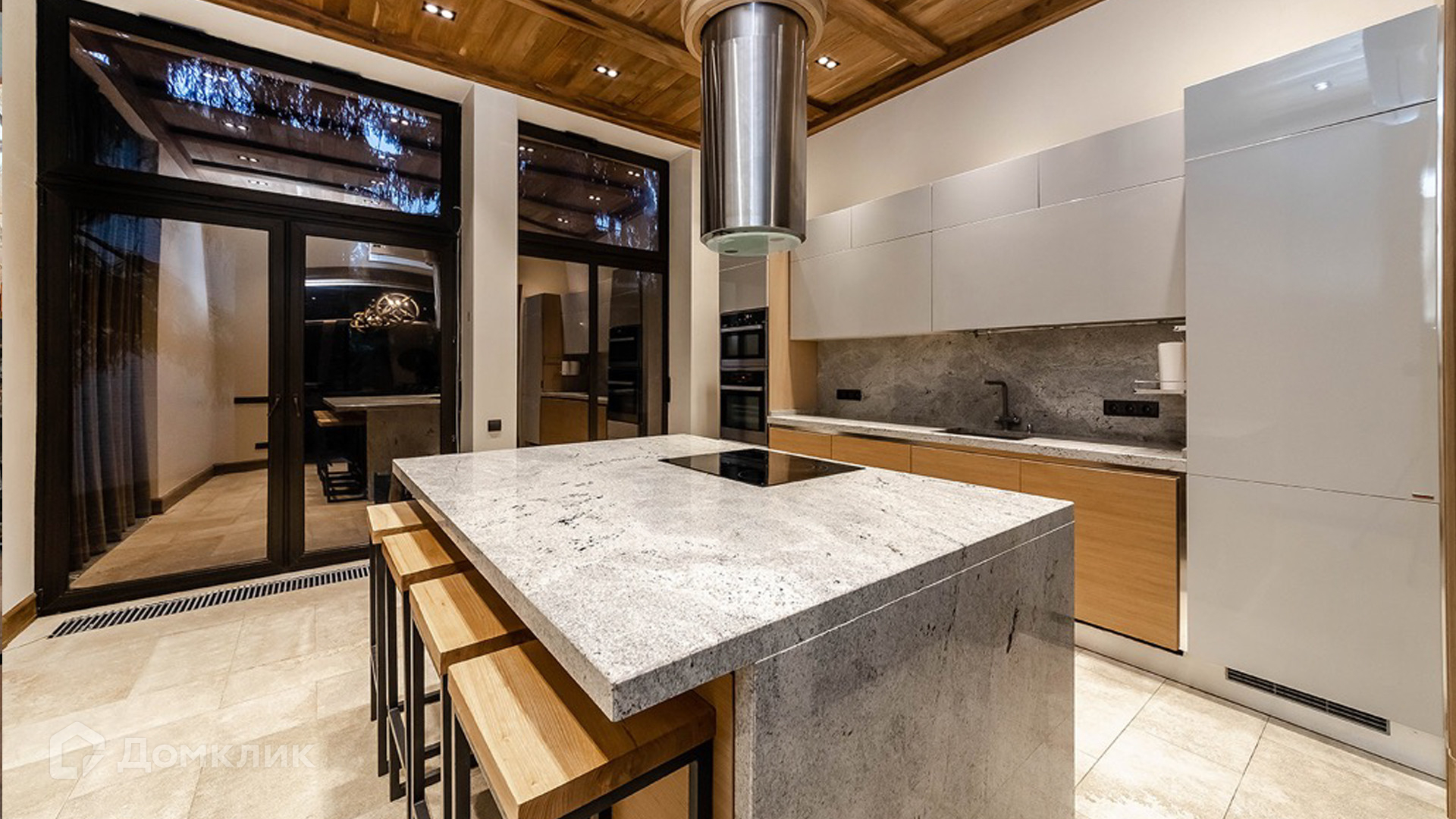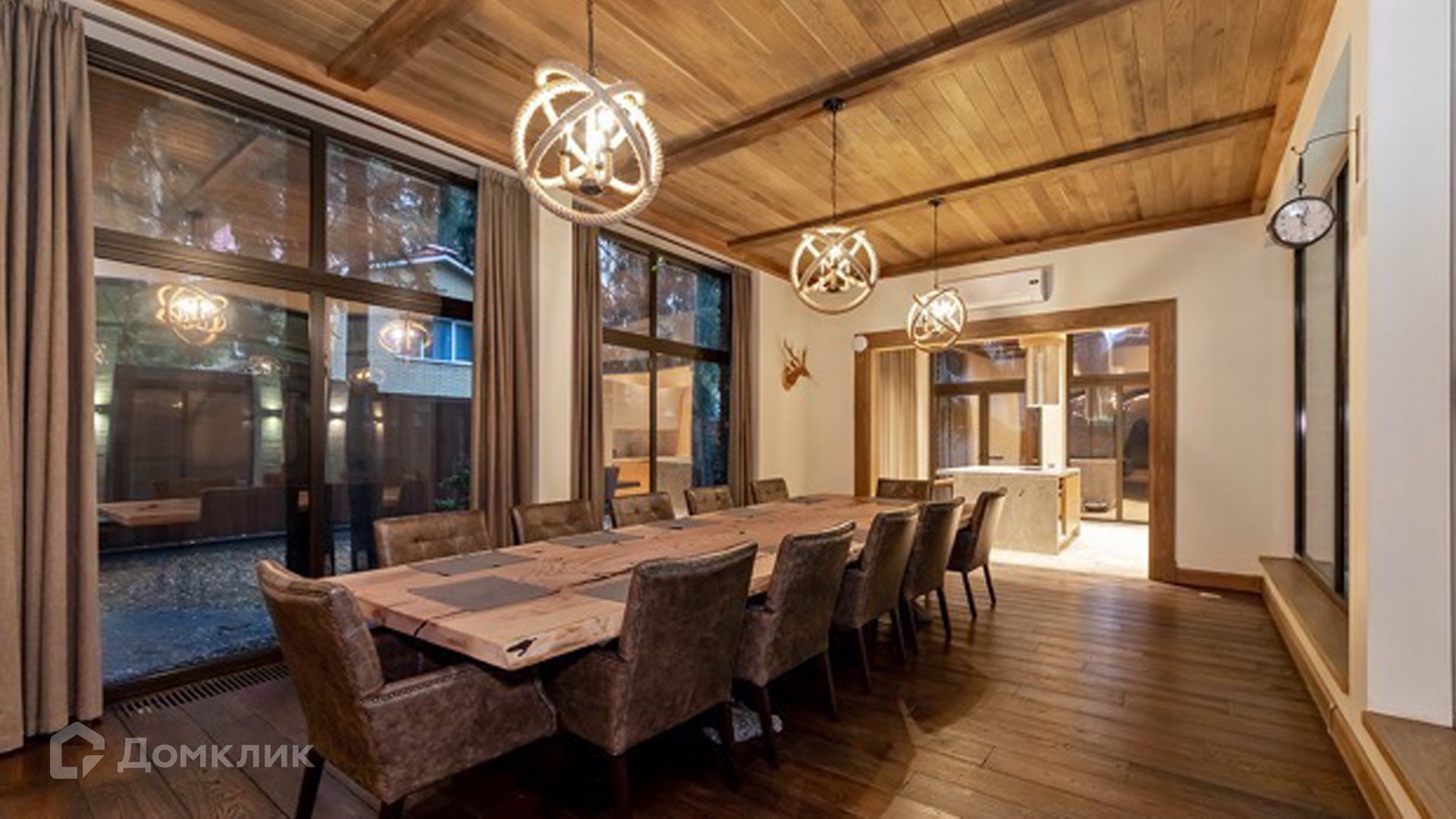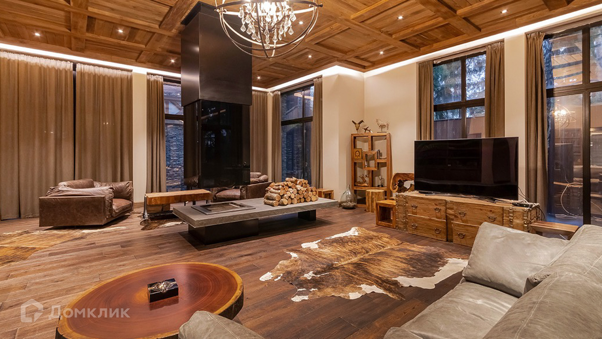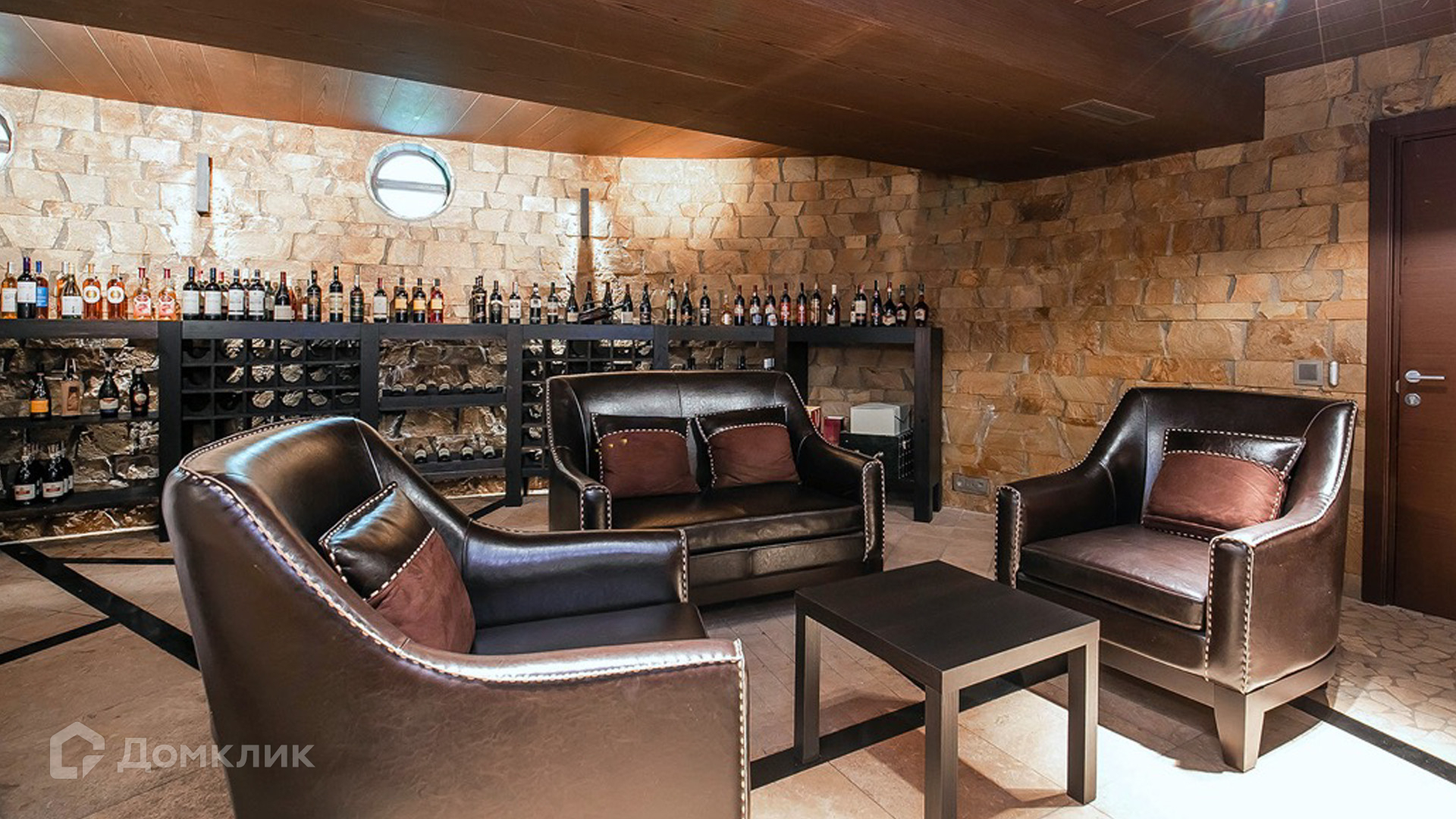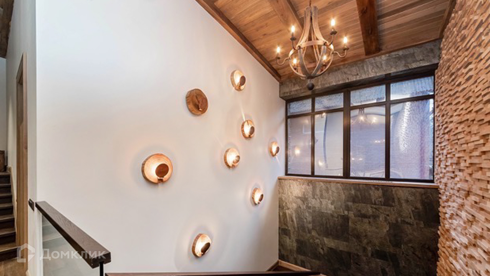 ID 9 168. Липка СПК. Резиденция в стиле «эко», дом для персонала и гараж для 3 машин расположены на лесном участке 15 соток. Фасад главного дома 900 м² в райтовском стиле облицован натуральным камнем. Внутри выполнена отделка из натуральных материалов и полная меблировка. На первом этаже в гостиной дровяной камин облицован натуральным мрамором, кожаный диван и кресла Ralf Lauren. В итальянскую кухню Scavolini встроили технику Kupperbuch. В столовой стулья из массива дуба и нубука, люстры испанского бренда Loft it. В доме разведена акустика. Бассейн декорирован натуральным камнем и оборудован системой внутренней очистки, озонирования и подогрева.