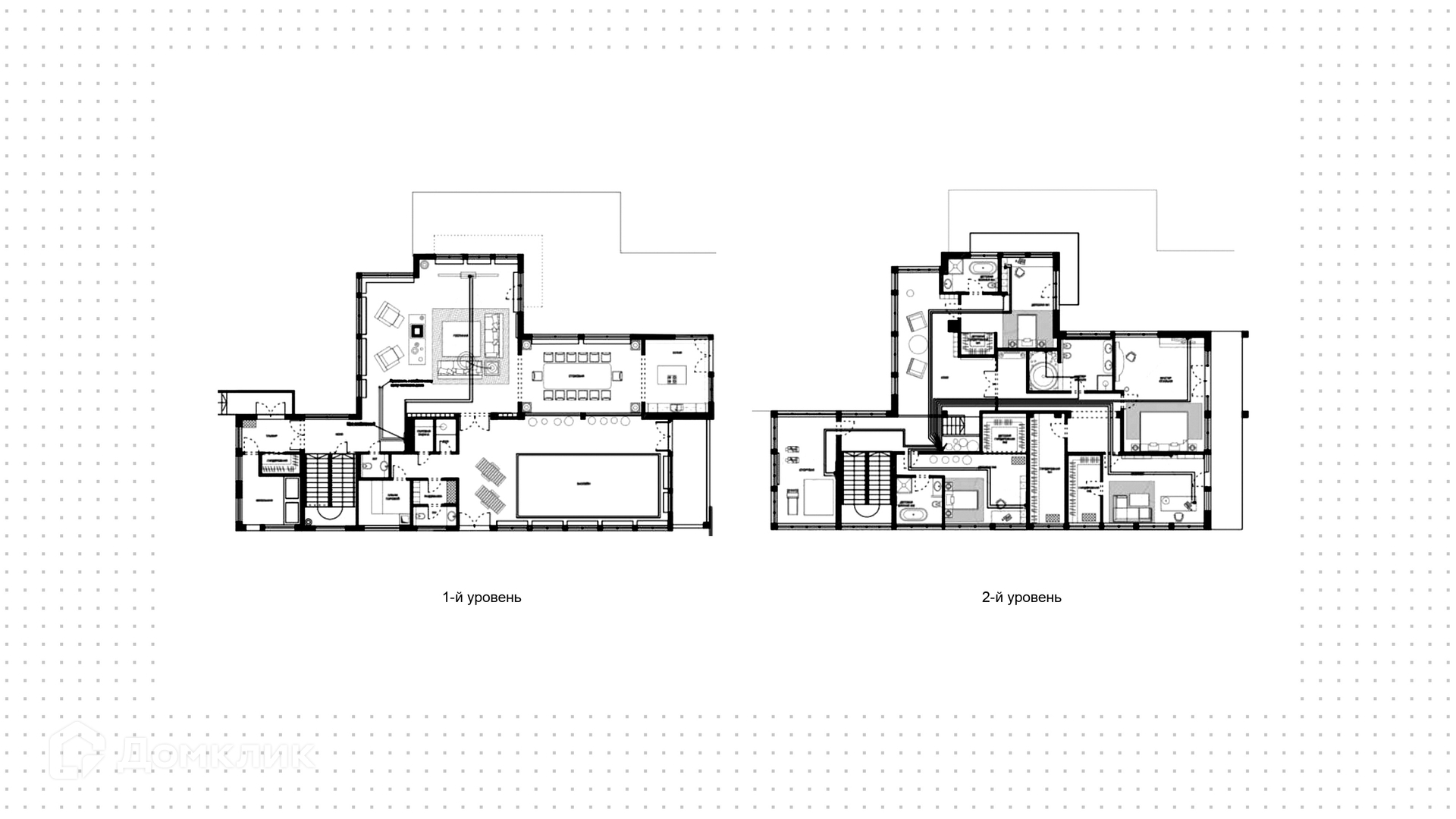 1-й уровень: кухня, гостиная, столовая, терраса, бассейн, финская сауна, хамам, душевая.