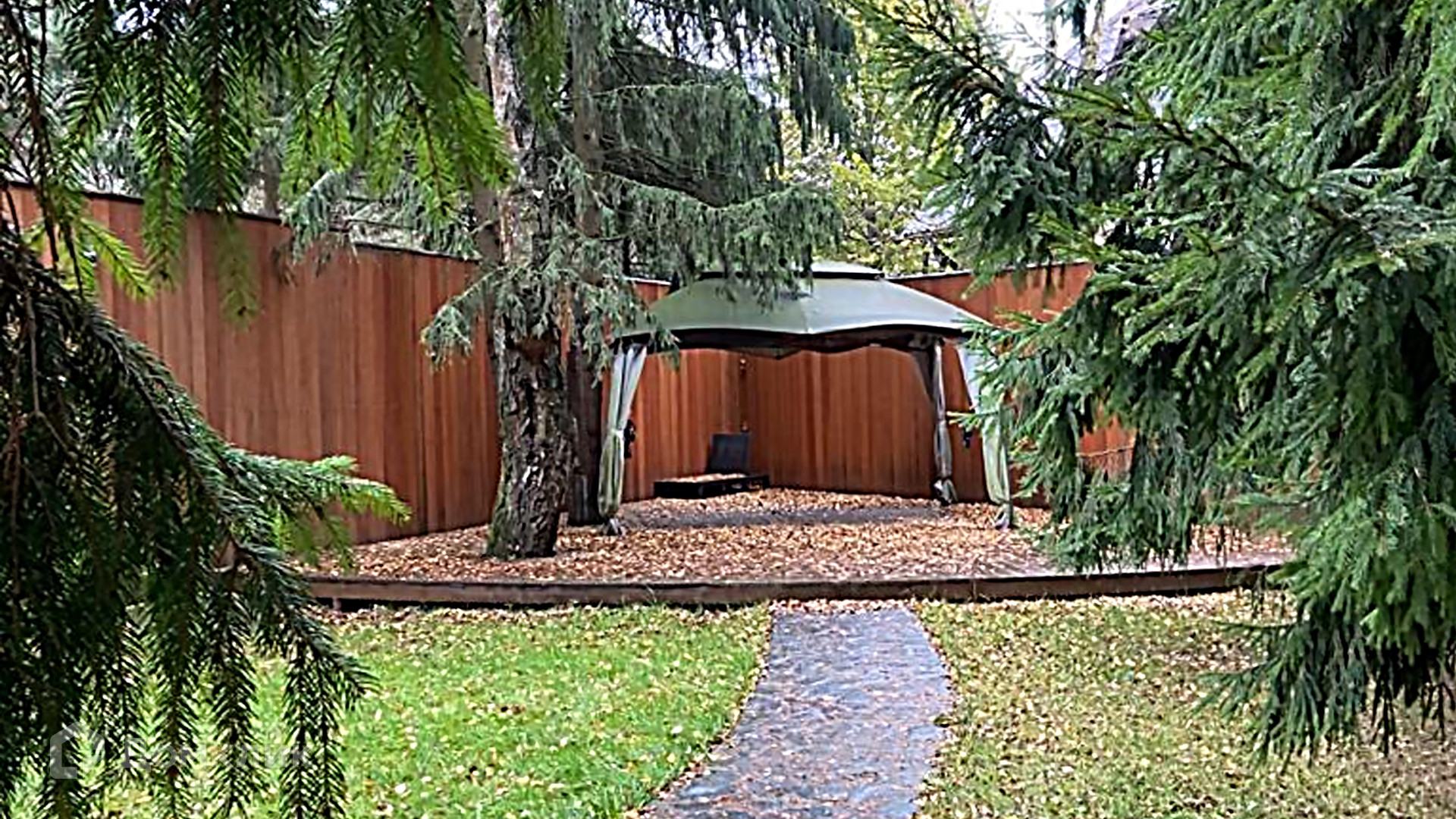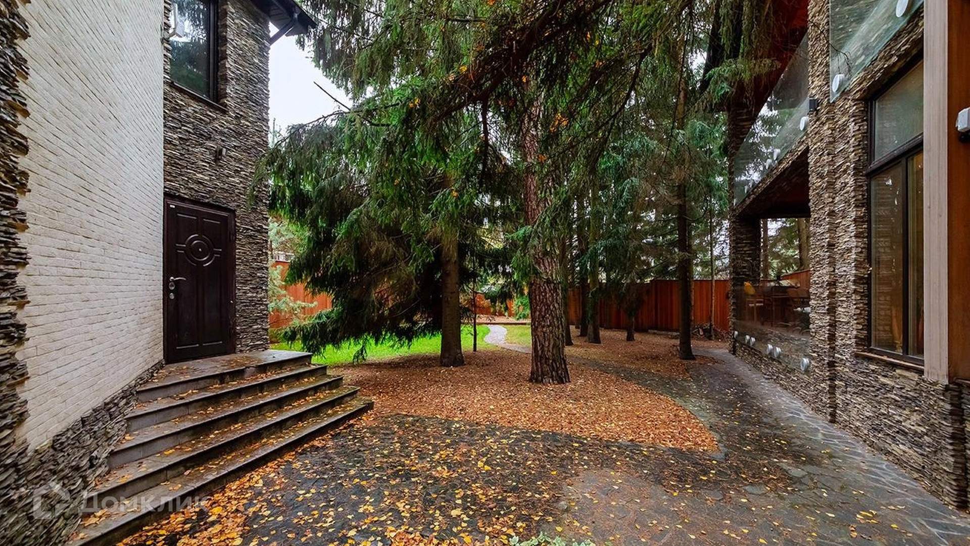 Территория участка ровная, с дренажем, ливневой канализацией и автополивом. Около дома проложены дорожки, растут ели, туи, сосны и березы. Забор построили из дуба и камня, ворота подключили к дистанционному управлению.
