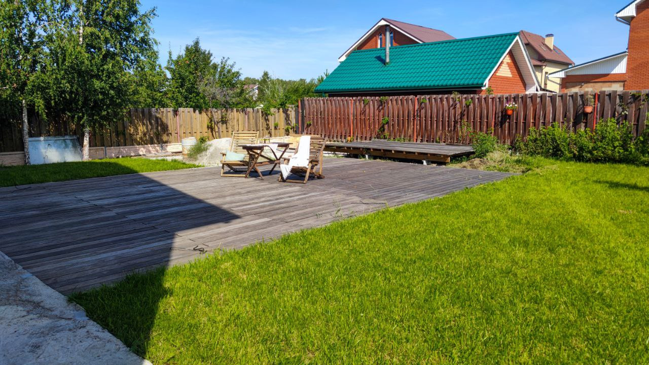 Сам участок просторный, облагороженный. На участке есть груши, яблони, черешня, черная смородина, крыжовник, ирга. Выведена система полива, роскошный газон будет легок в уходе