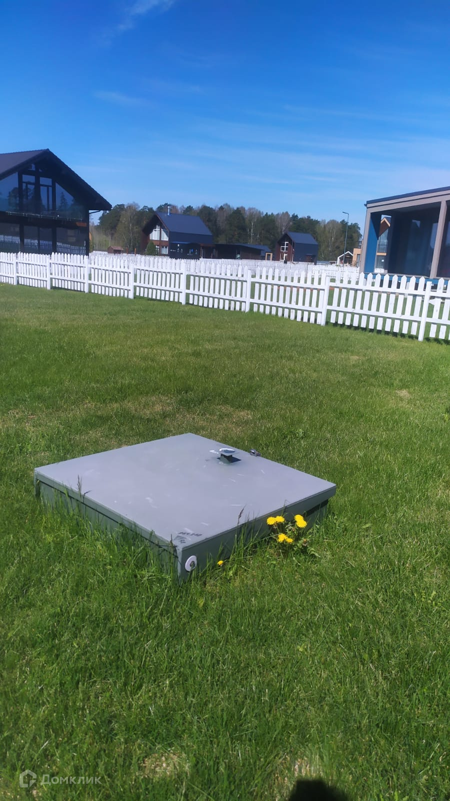 Благоустройство: рулонный газон, ограждение из штакетника; вымощенная брусчаткой парковка перед домом на 2 машино-места. Въезд в КП через шлагбаум.