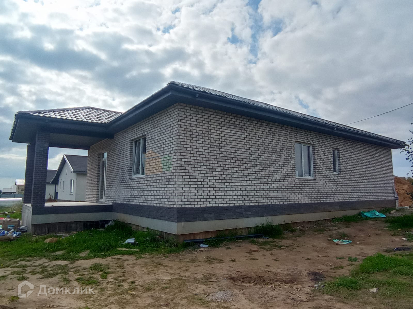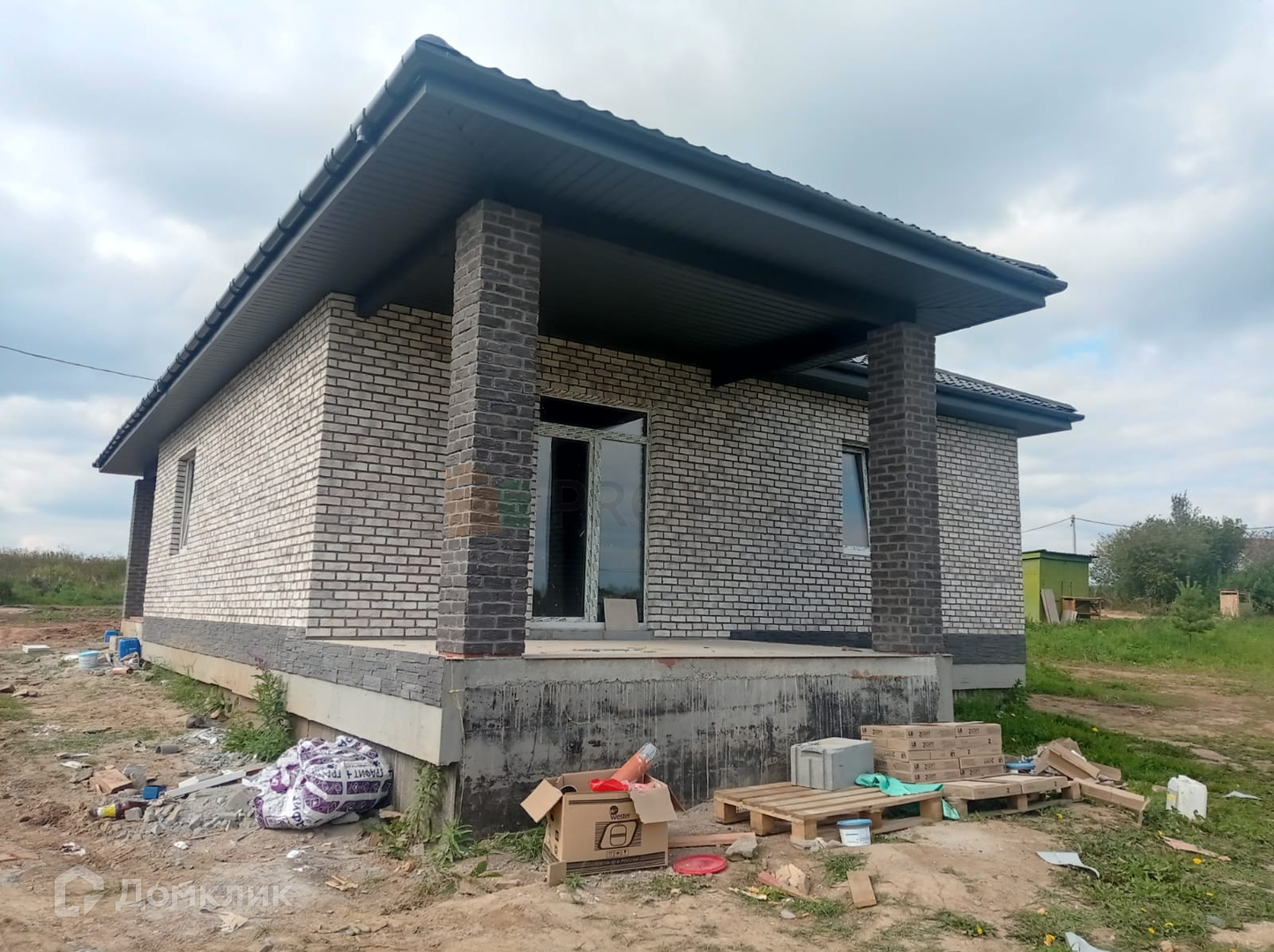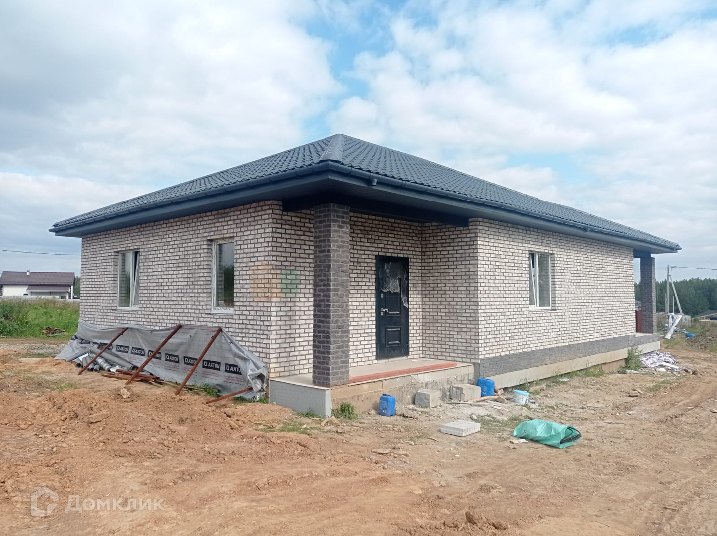 Газоблок на 300 мм. Утепление: стены - 100 мм. базальтовая плита. Фасад: кирпич. Кровля: металлочерепица премиум-класса. Окна: 5-камерный профиль и фурнитура премиум-класса. Входная дверь: морозостойкая. ОТДЕЛКА: «ПОД КЛЮЧ»: