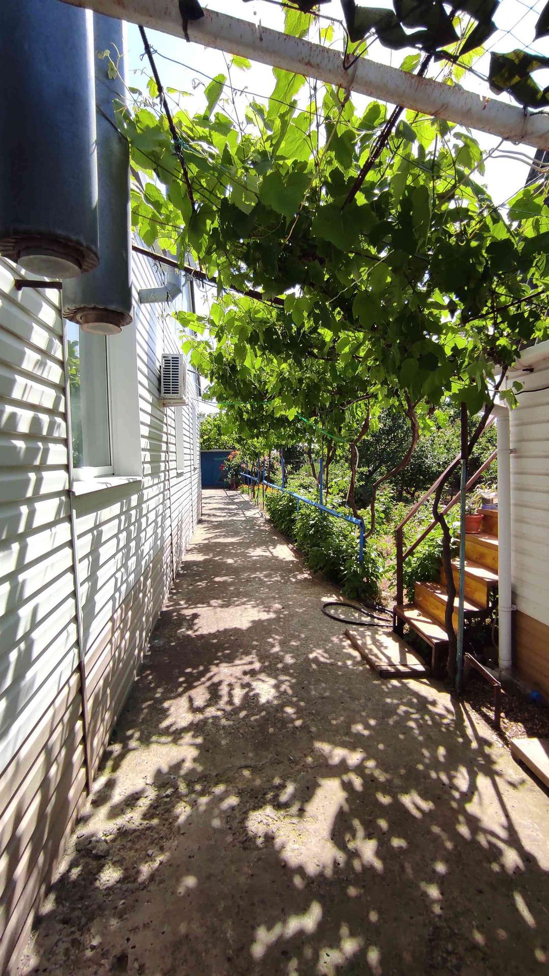 Во дворе два гаража,  над одним (обшит сайдингом) расположены две жилые летние комнаты. Сухой глубокий подвал во втором гараже для хранения консервации и овощей. Под навесом баня, летний санузел и душ. Двор заасфальтирован, очень много цветов.  Есть хозпостройки для содержания животных и домашней птицы, уличный туалет. В огороде плодовые деревья, виноград. Всё ухожено - заходи и живи! Посёлок расположен между двух морей: залив Чёрного моря в шаговой доступности,  до Азовского моря 5 минут на машине (10 км).