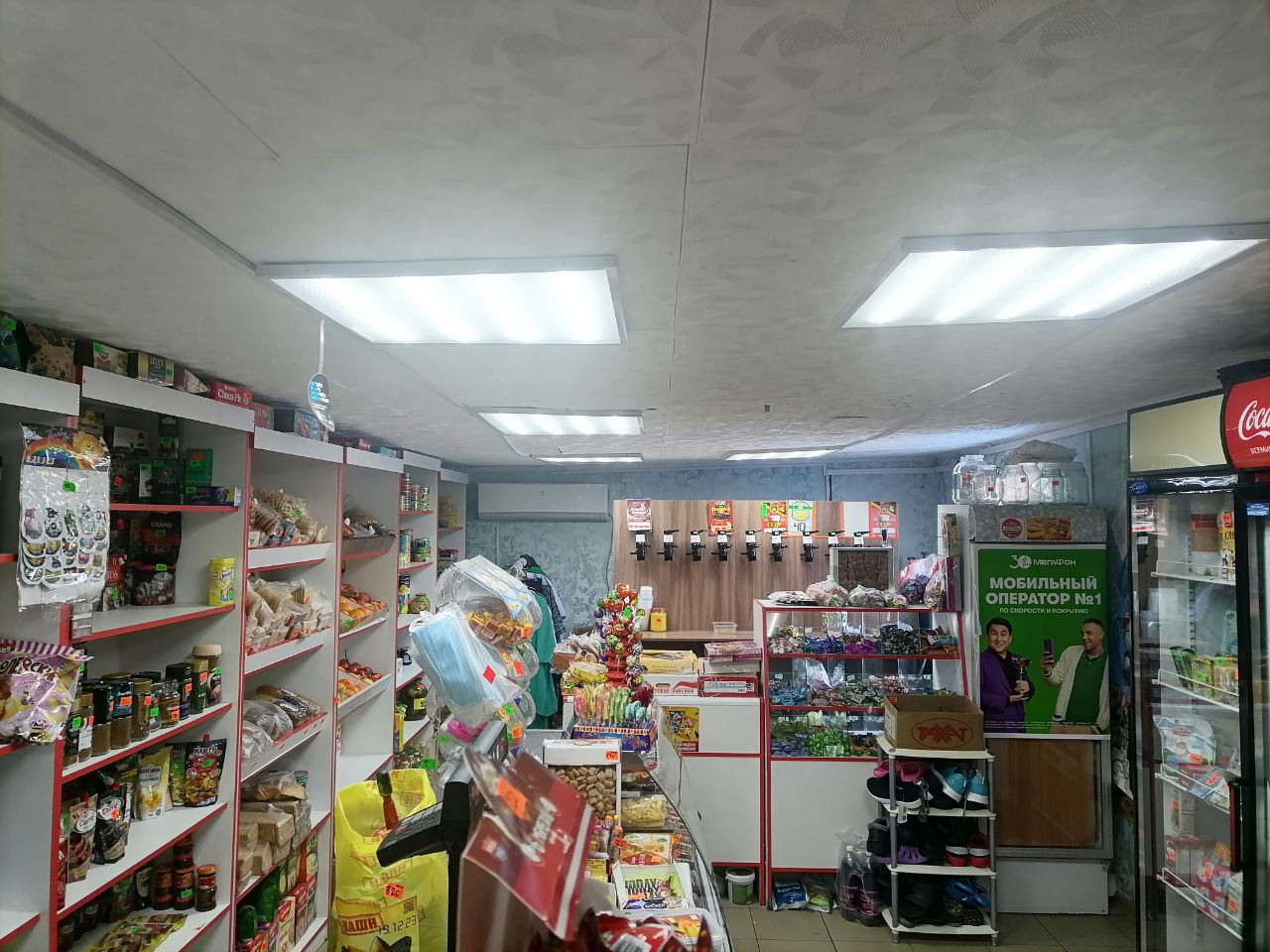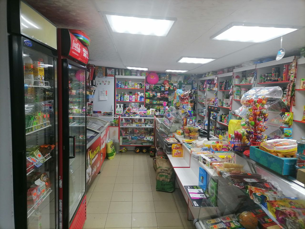 Магазин  40кв.м. работает каждый день.Есть стеллажи,витрины,холодильники,кондиционеры.