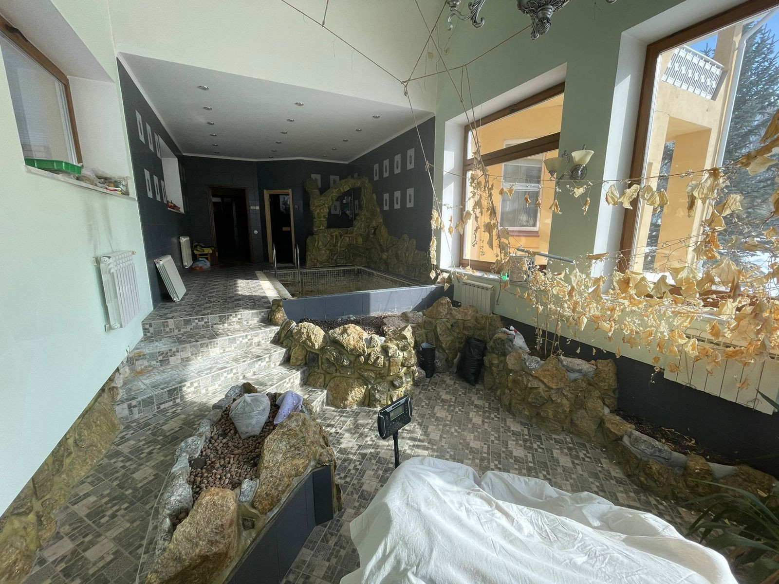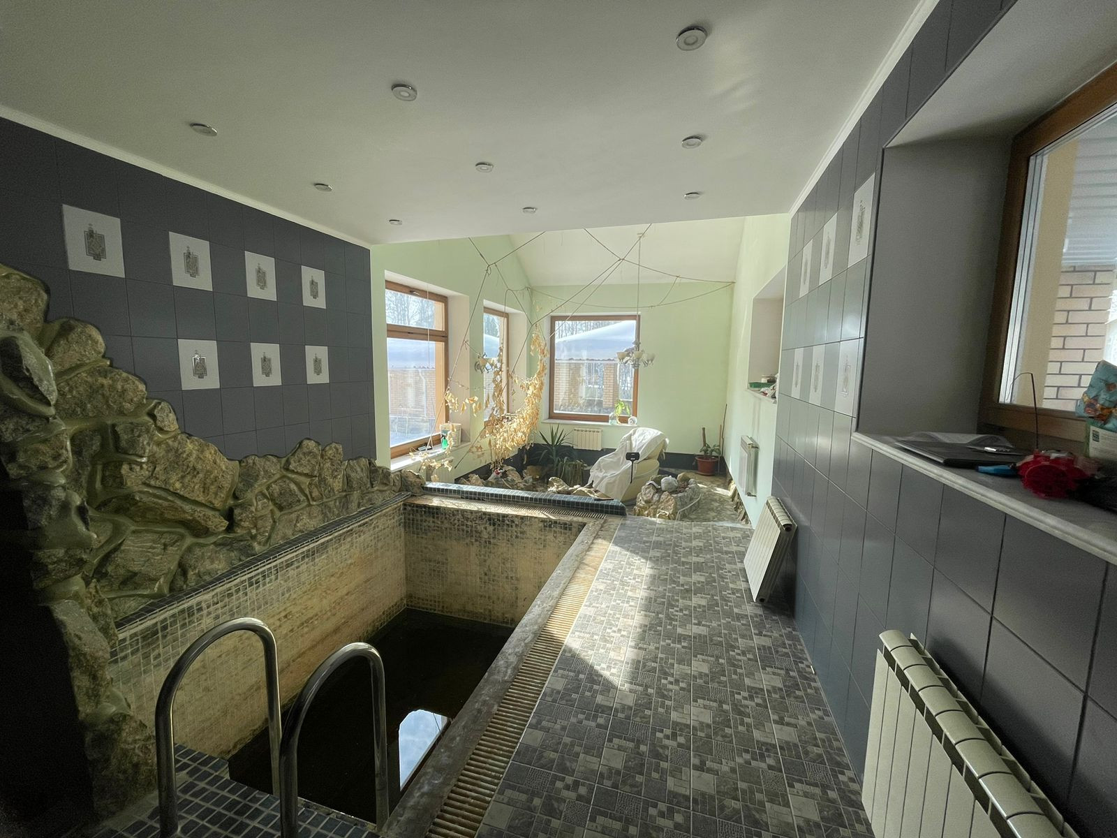 Площадь – 50 м2 . Комната отдыха, парилка, помывочная зона, выход к уличному бассейну (площадь бассейна – 64 м2 , глубина 2 метра).