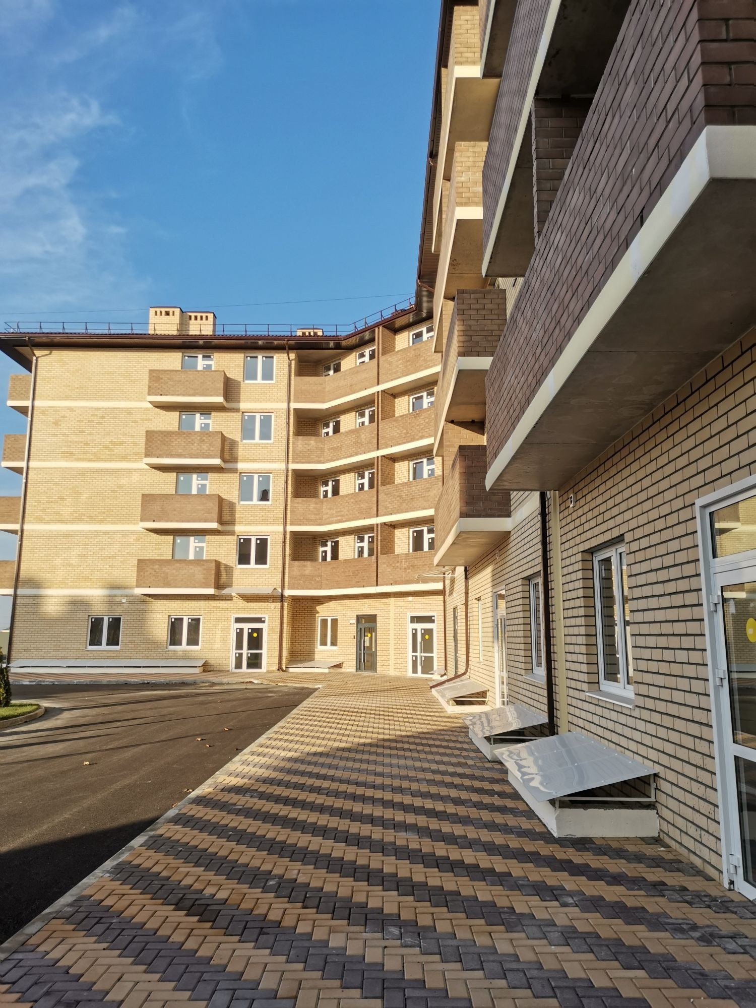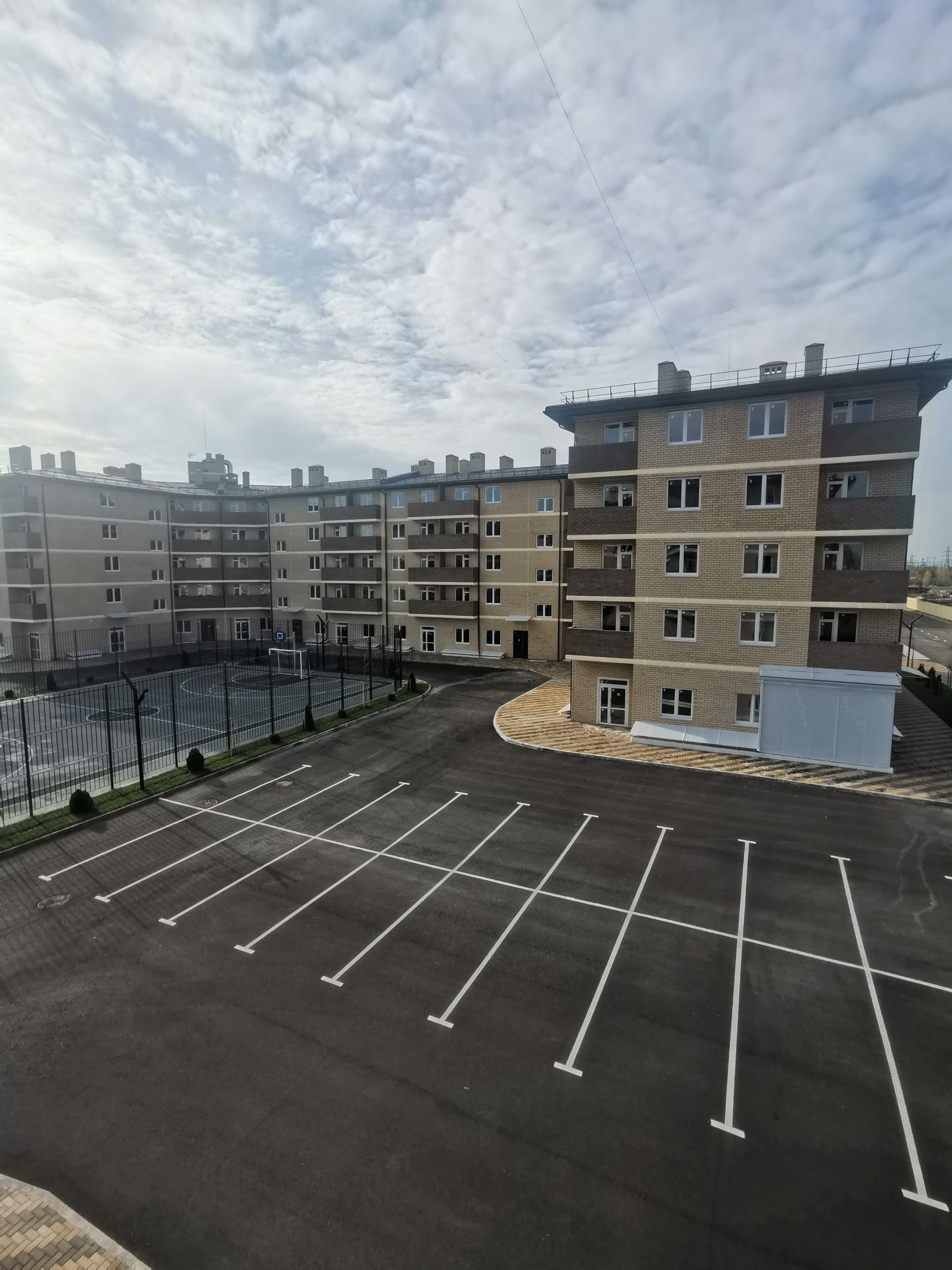 Благоустроенная территория комплекса с множеством парковочных мест.