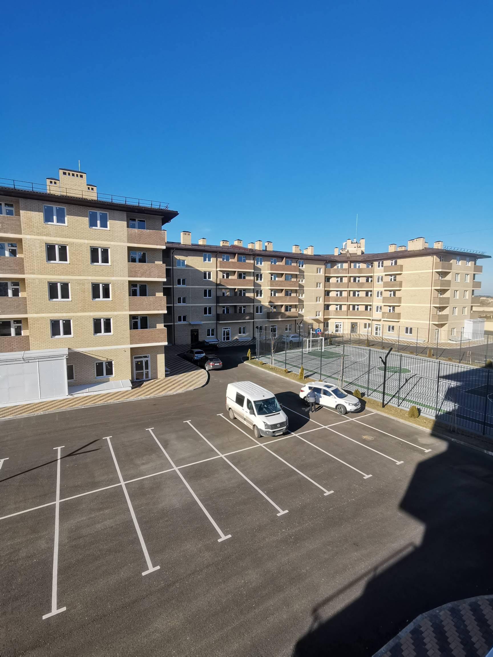 Благоустроенная территория комплекса с множеством парковочных мест.