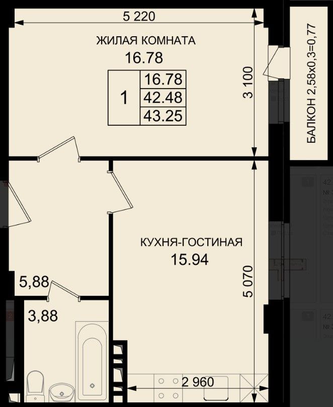 Общая площадь 43.25 м2
