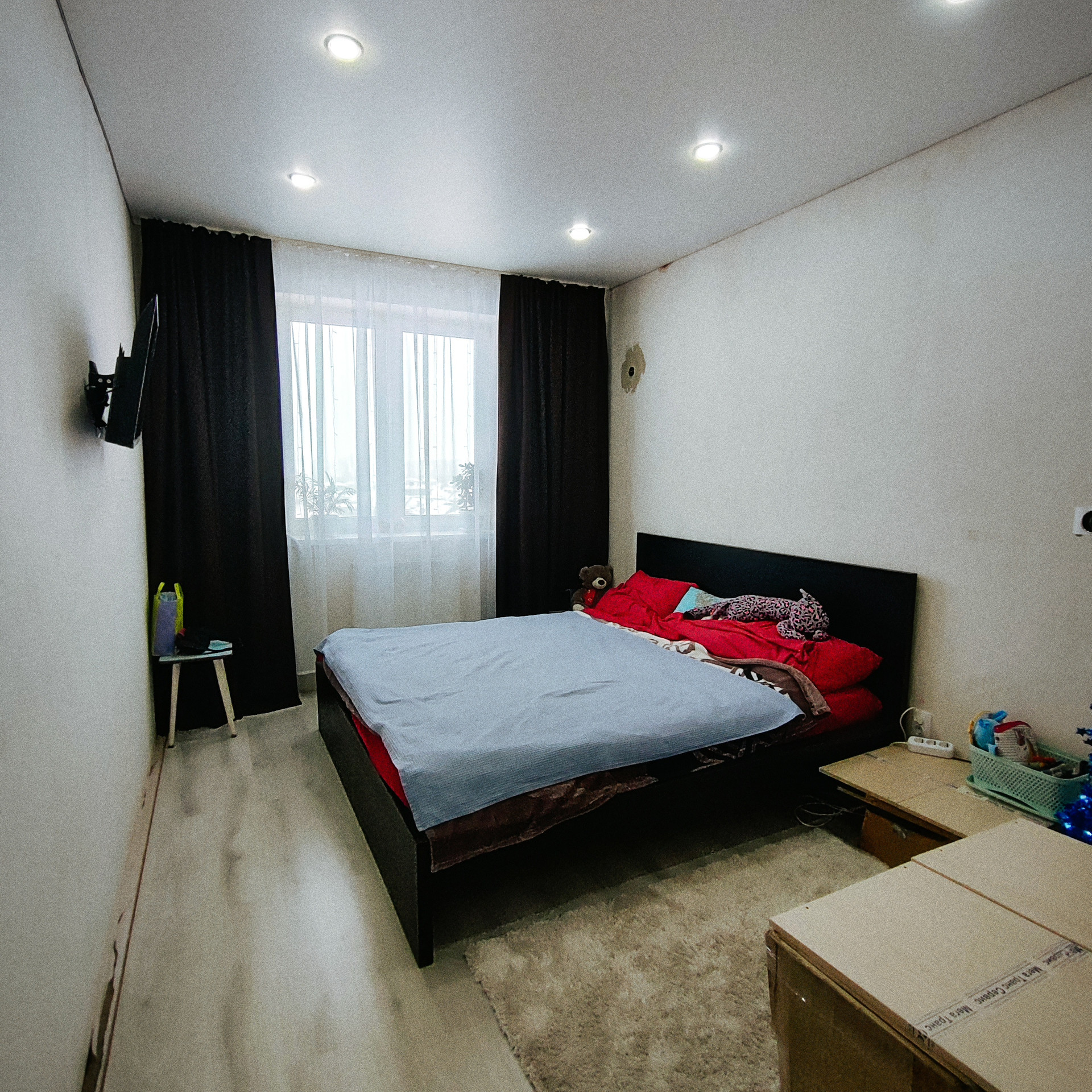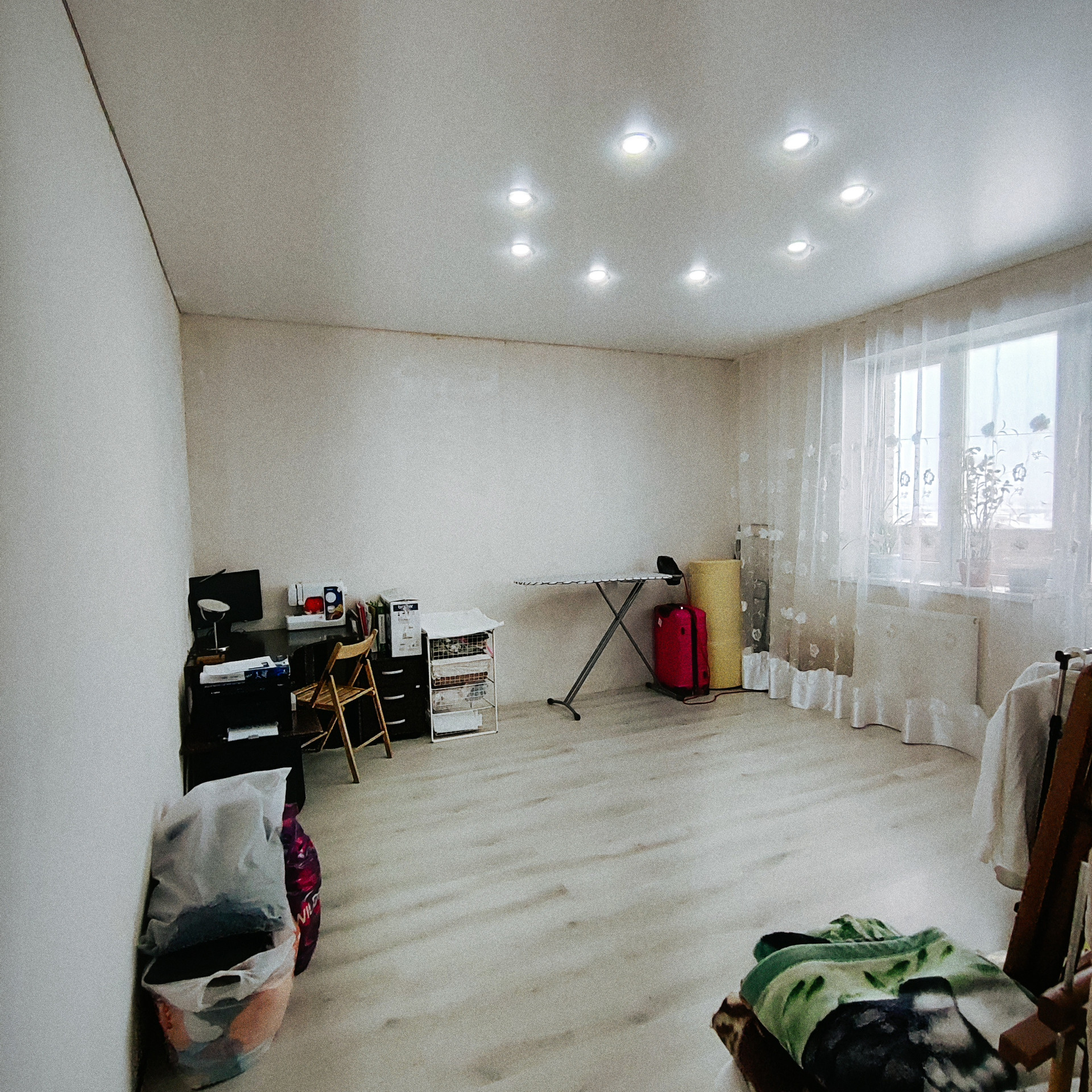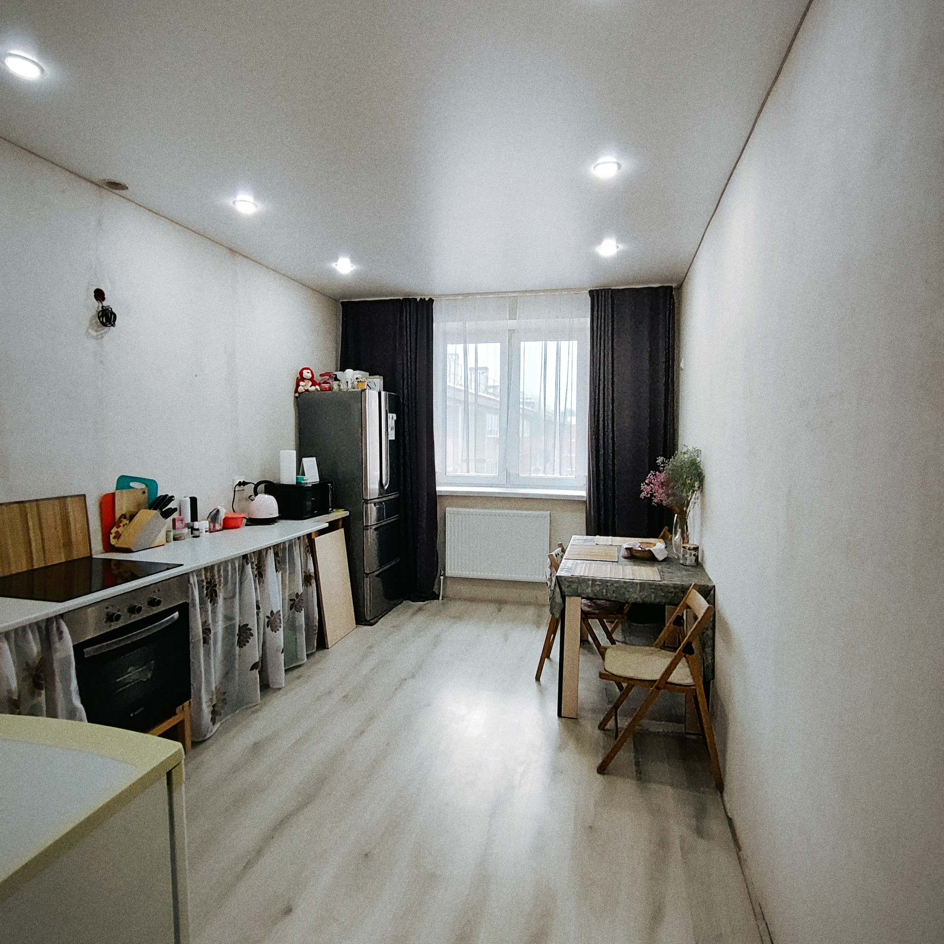 Планировка "бабочка" одно окно выходит во двор на детскую площадку, два окна на поле за окном.