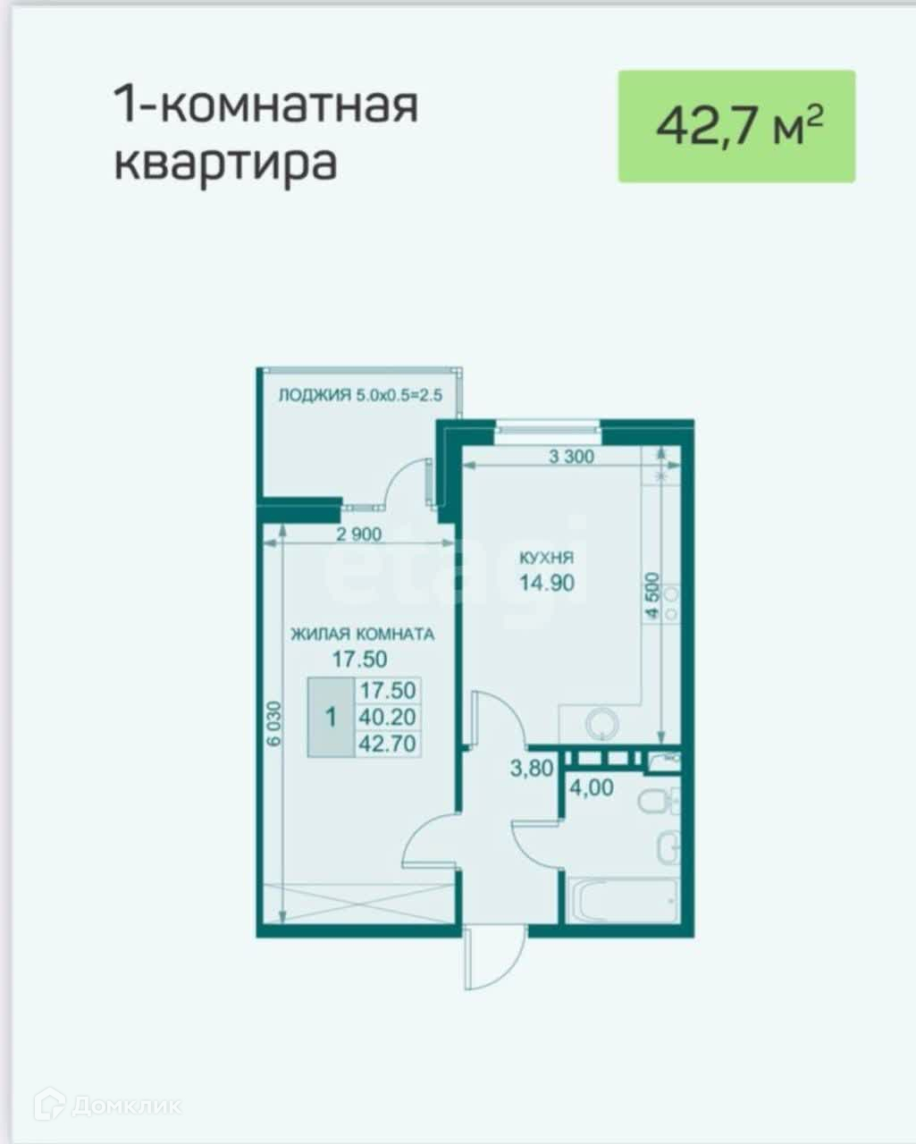Общая площадь 42.7 м2