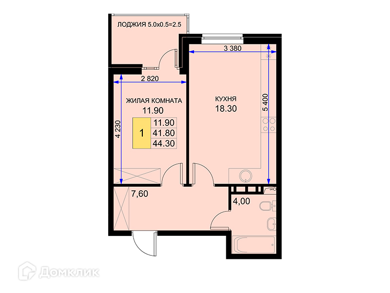 Общая площадь 44.3 м2