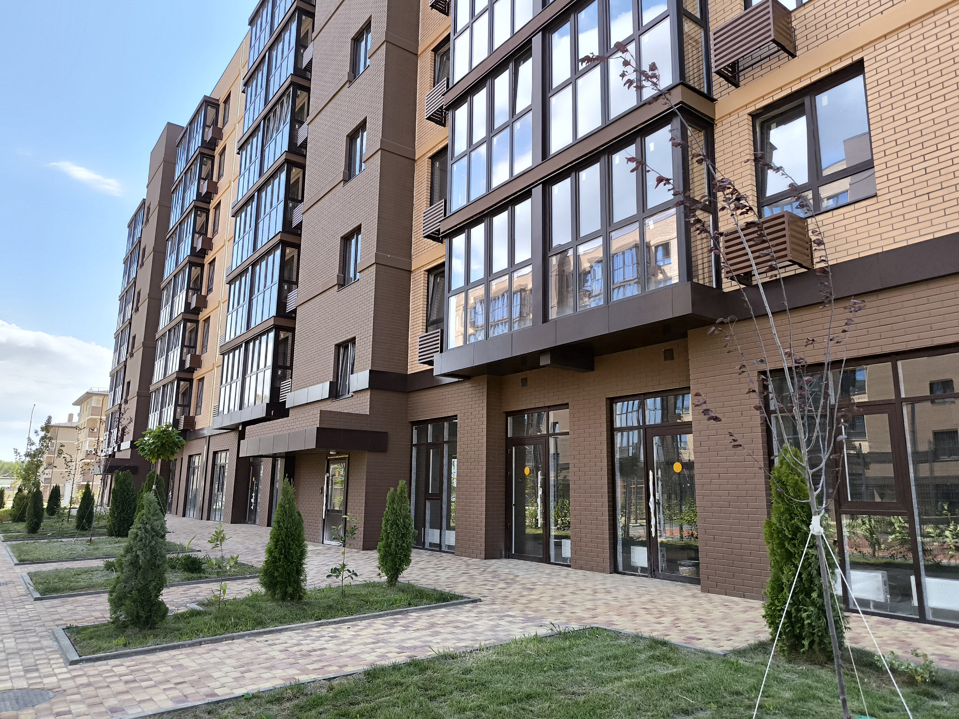 Просторные придомовые территории, рядом новый детский сад.