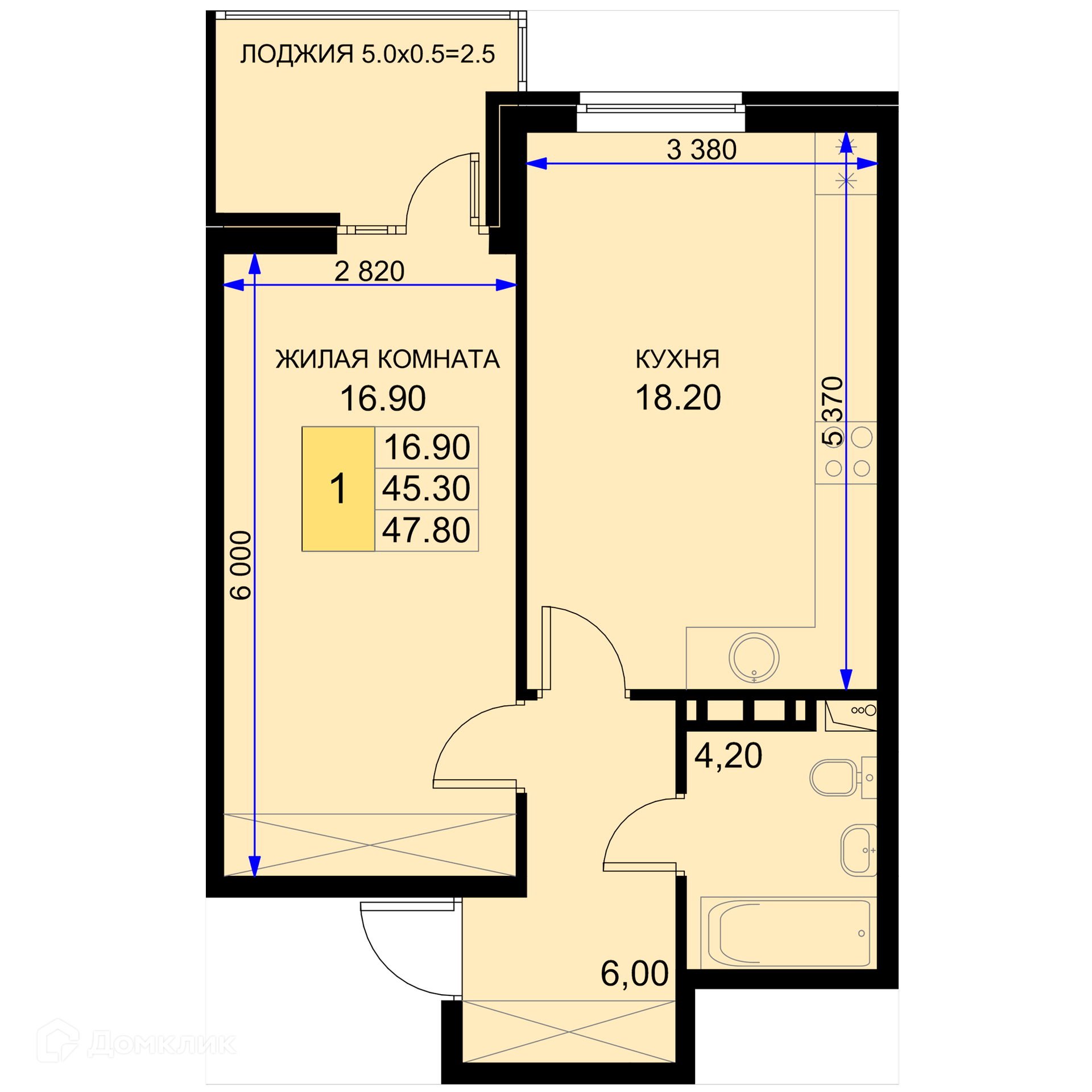 Общая площадь 47.8 м2