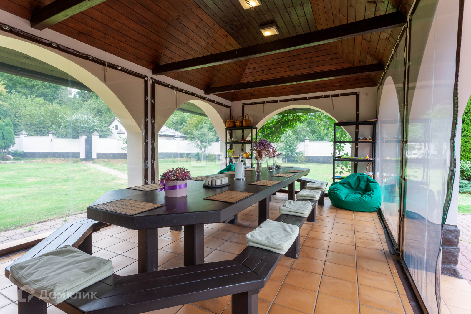 На территории расположена летняя кухня с террасой, также укомплектованная дорогой профессиональной техникой для приготовления изысканных блюд для Вашей семьи.