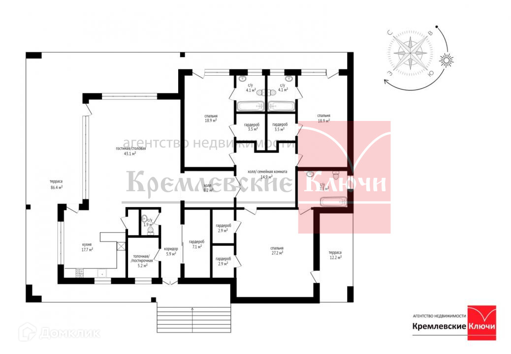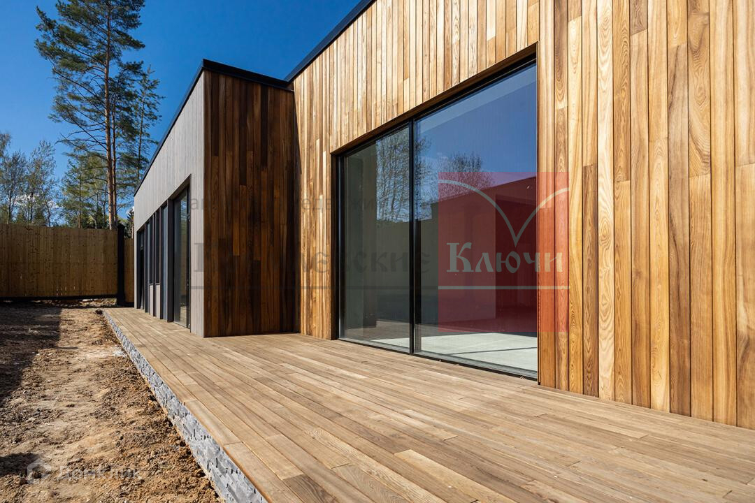 Общая площадь дома 310.3 м2 включает 2 террасы общей площадью 98.6 м2, кухню 17.7 м2, гостиную 43.3 м2, 3 мастер-спальни 27.2 м2, 18.9 м2, 18.9 м2, семейную гостиную, гостевой санузел, 2 гардеробных, топочную-постирочную, высота потолков 3.62, 3.46 м. Фундамент монолитный ж/б ростверк по ж/б сваям с монолитной плитой пола первого этажа и балочной клеткой под деревянный настил террас, стены полнотелый керамический кирпич, утеплитель 100 мм плотностью 125 кг/м3, перекрытия многопустотные ж/б плиты заводского изготовления по ж/б балкам шириной 300мм, кровля утепленная с двойным слоем гидроизоляции и внутренним водостоком с возможностью организации террасы. В дизайне экстерьера учтены самые актуальные тенденции строительной моды, фасад облицован термообработанной доской ясеня и сосны, настил террасы также выполнен из термообработанной доски ясеня, отделка парапетов фальцевой кровлей, цоколь облицован искусственным камнем, ограждение по периметру земельного участка выполнено из термообработанной сосны. Дом сдается с отделкой White box, предлагаем ряд вариантов дизайнерской отделки интерьера. Все коммуникации центральные. На участке над домом возвышаются красавицы-сосны. На участке забетонированная площадка на 2 машиноместа 72 м2.