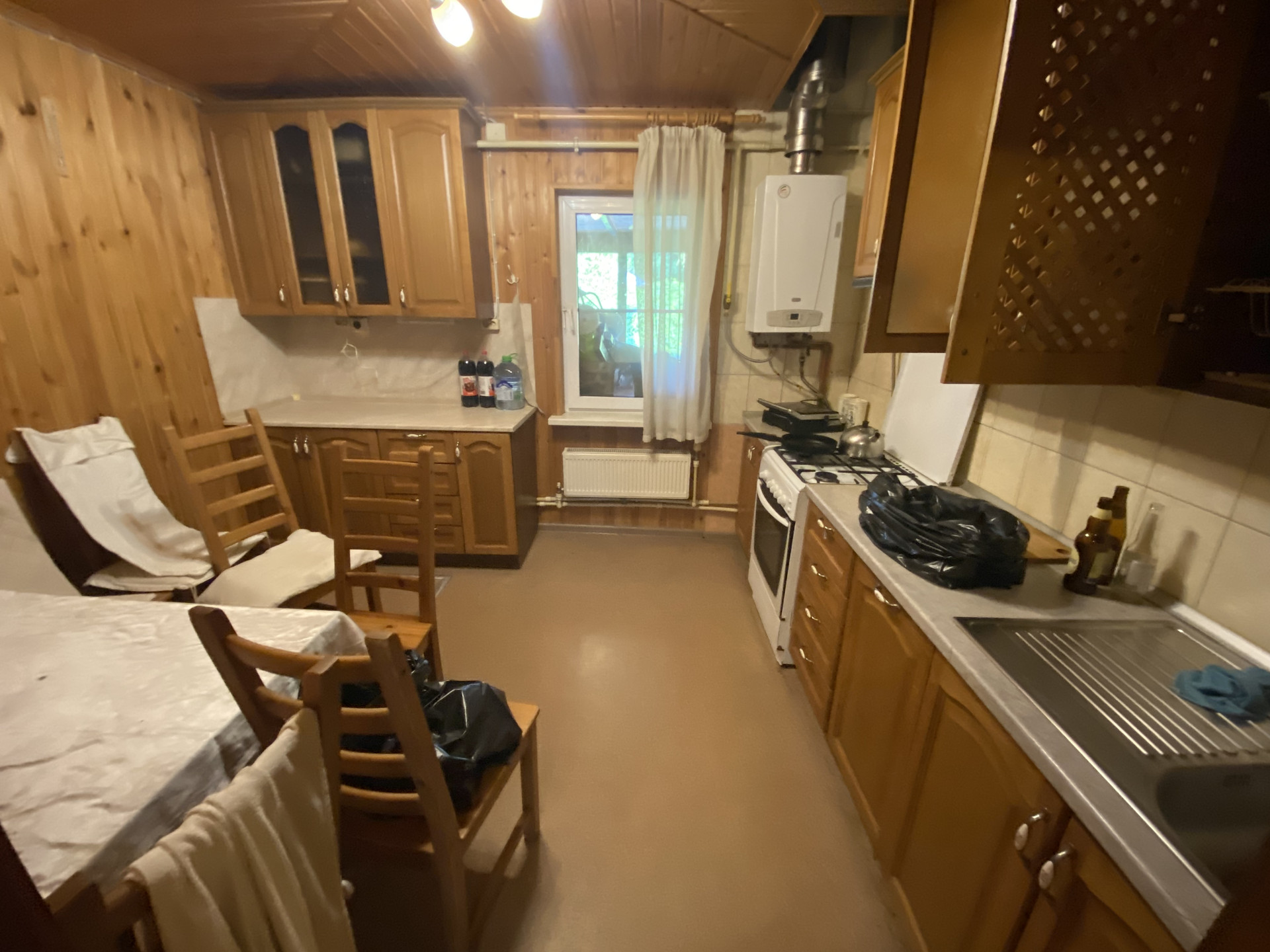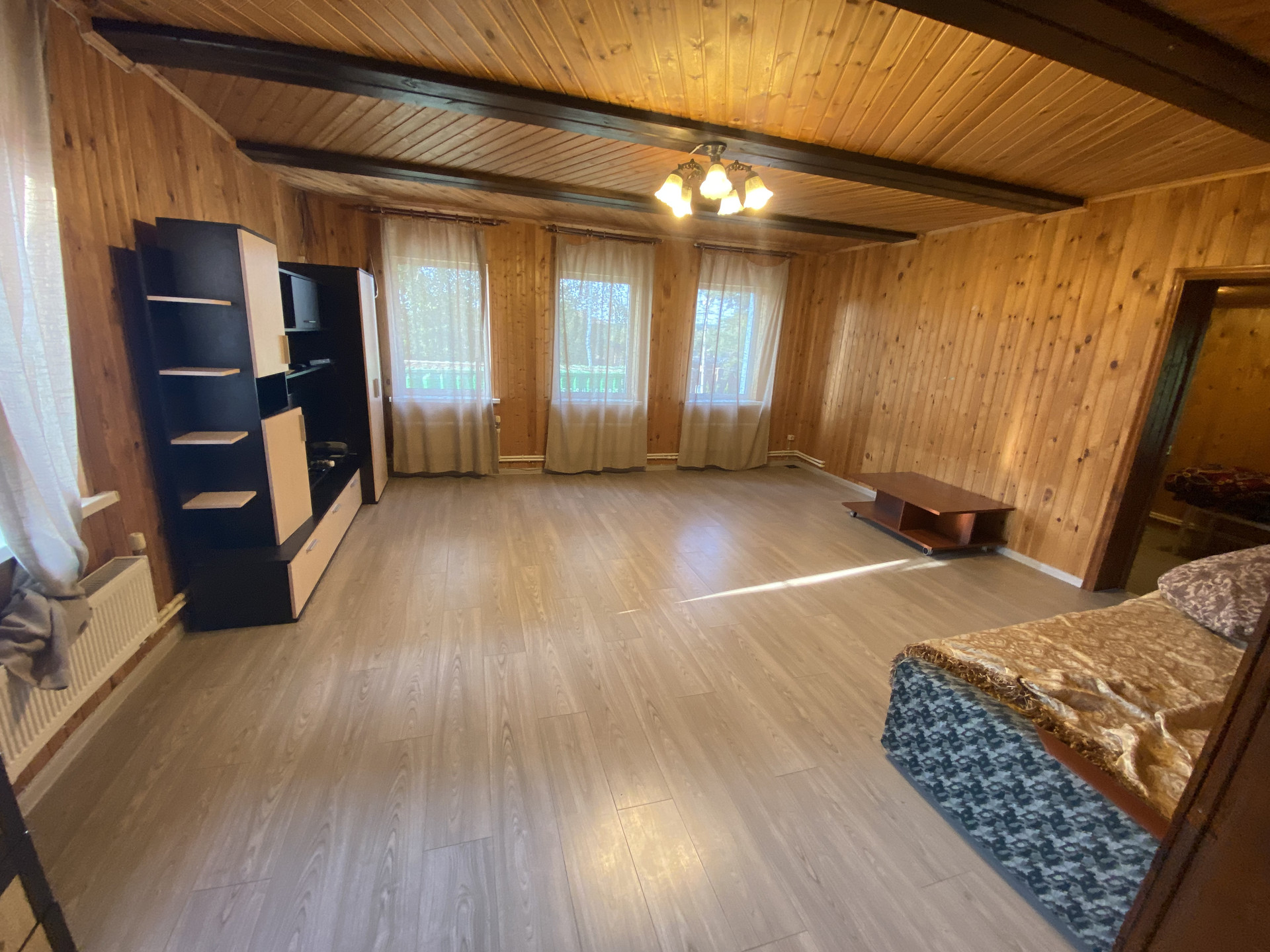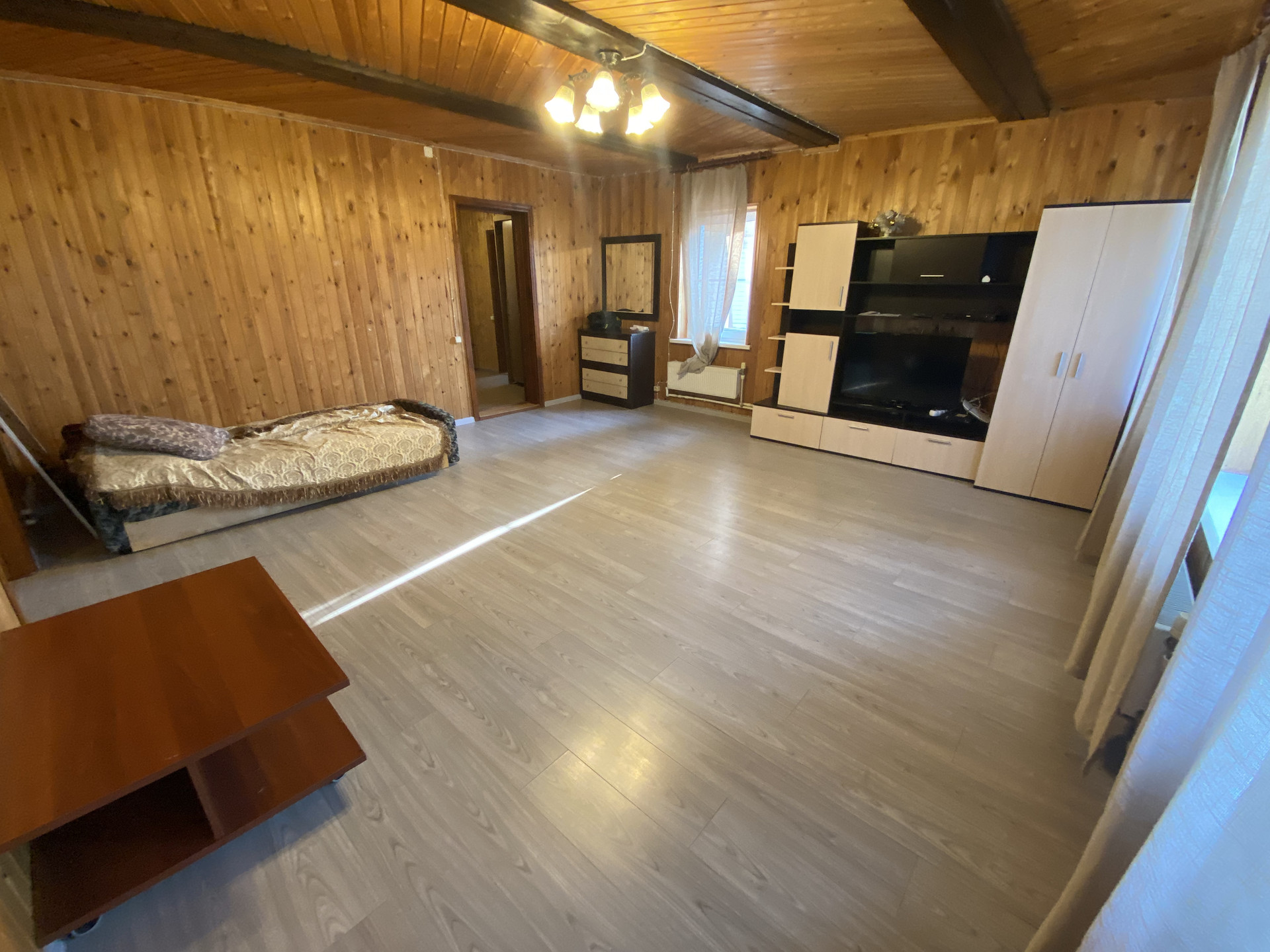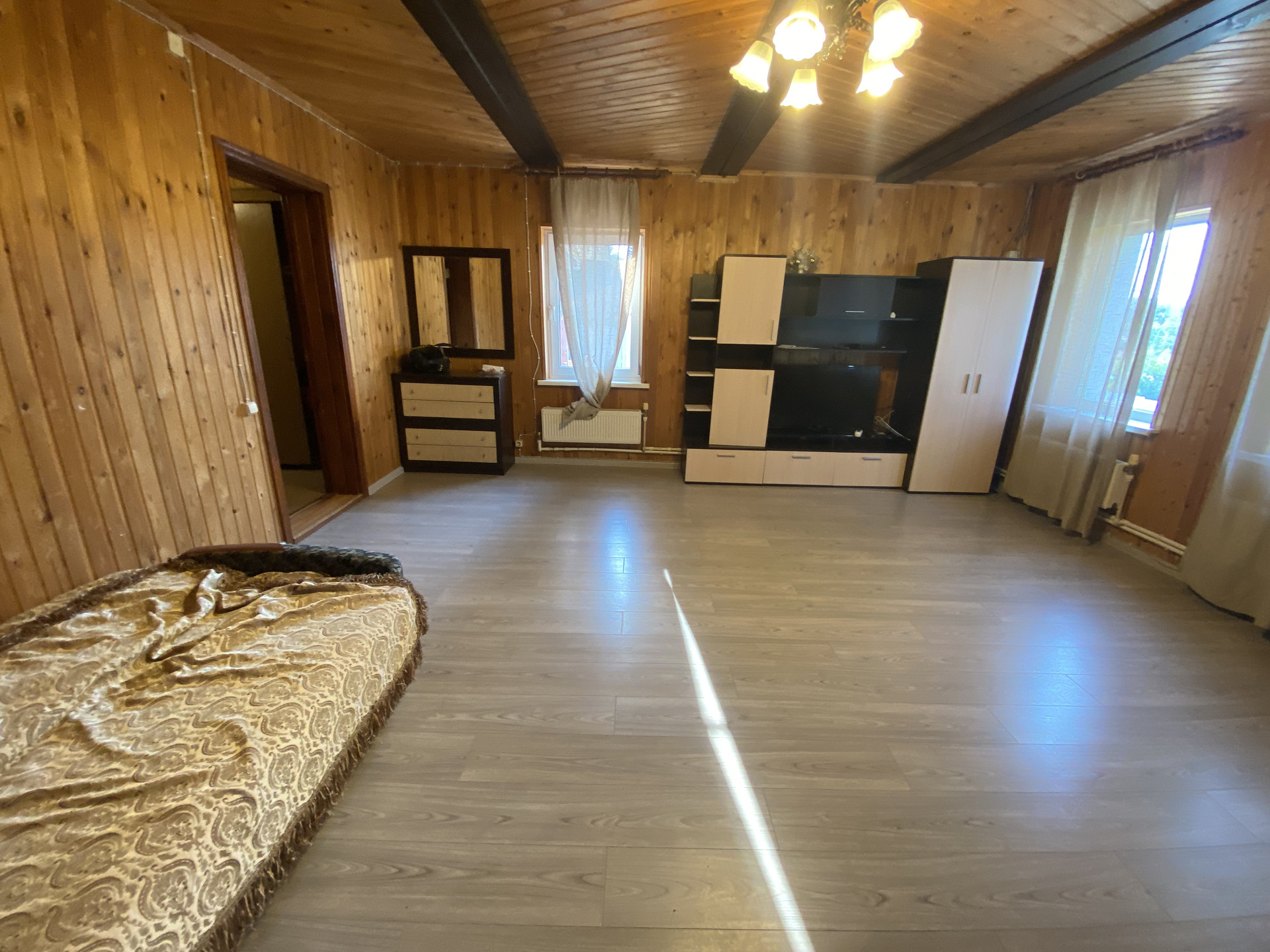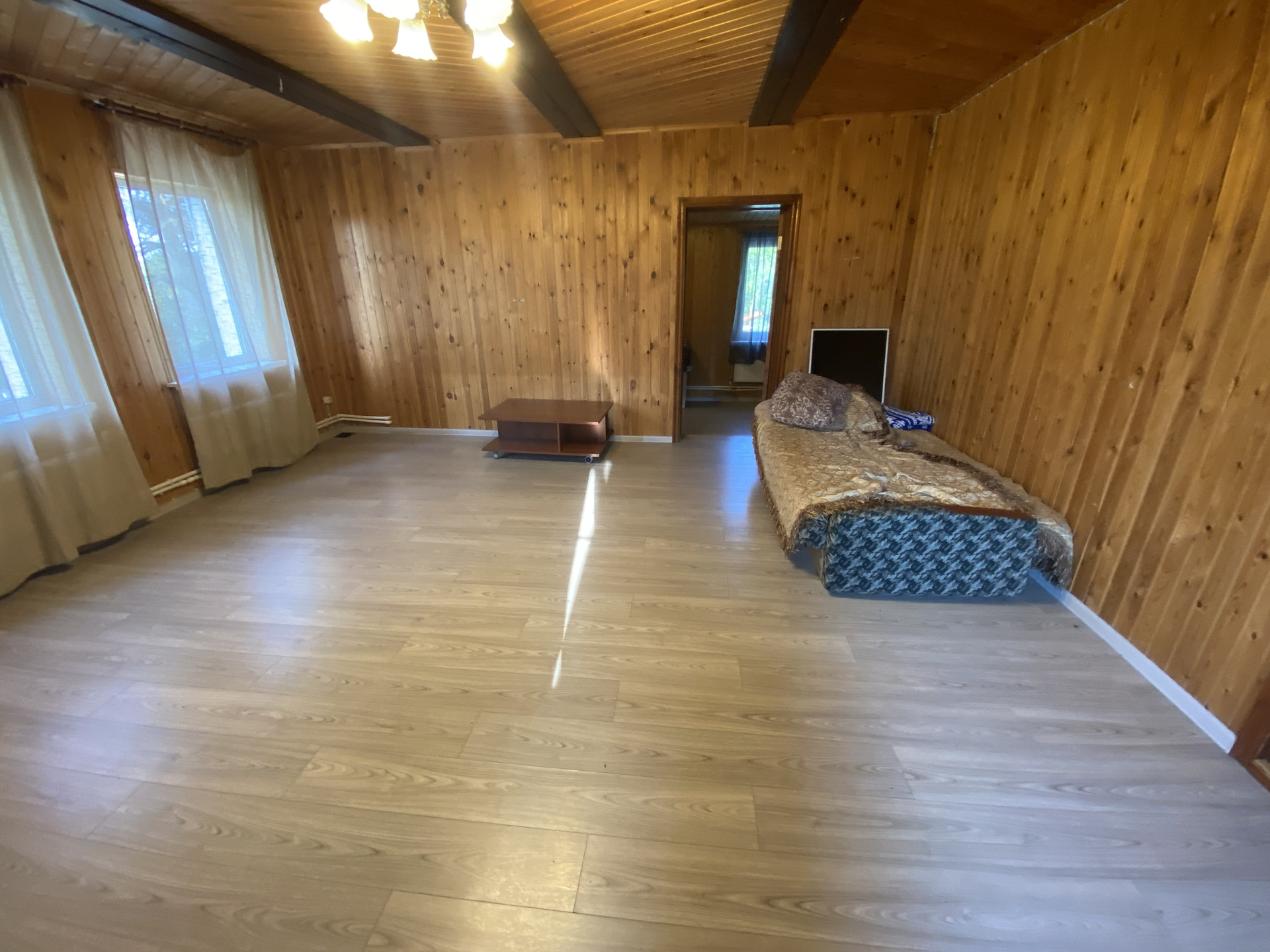 Деревянный дом 109,1м для круглогодичного проживания. Газ, вода колодец, канализация септик. 3 спальни, гостиная, кухня, совмещенный санузел, веранда на задний двор. Гостевой домик: спальня, кухня и санузел.