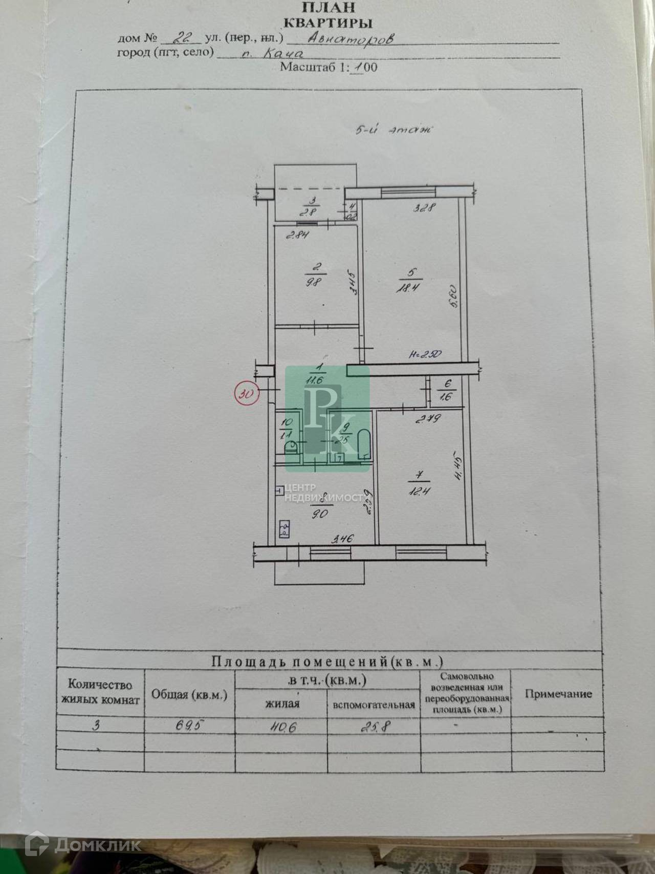 Трехкомнатная квартира 69,5 м2, на 5/5 этаже дома. Расположена в г. Севастополь, Нахимовский район, п. Кача, ул. Авиаторов, д. 22.
