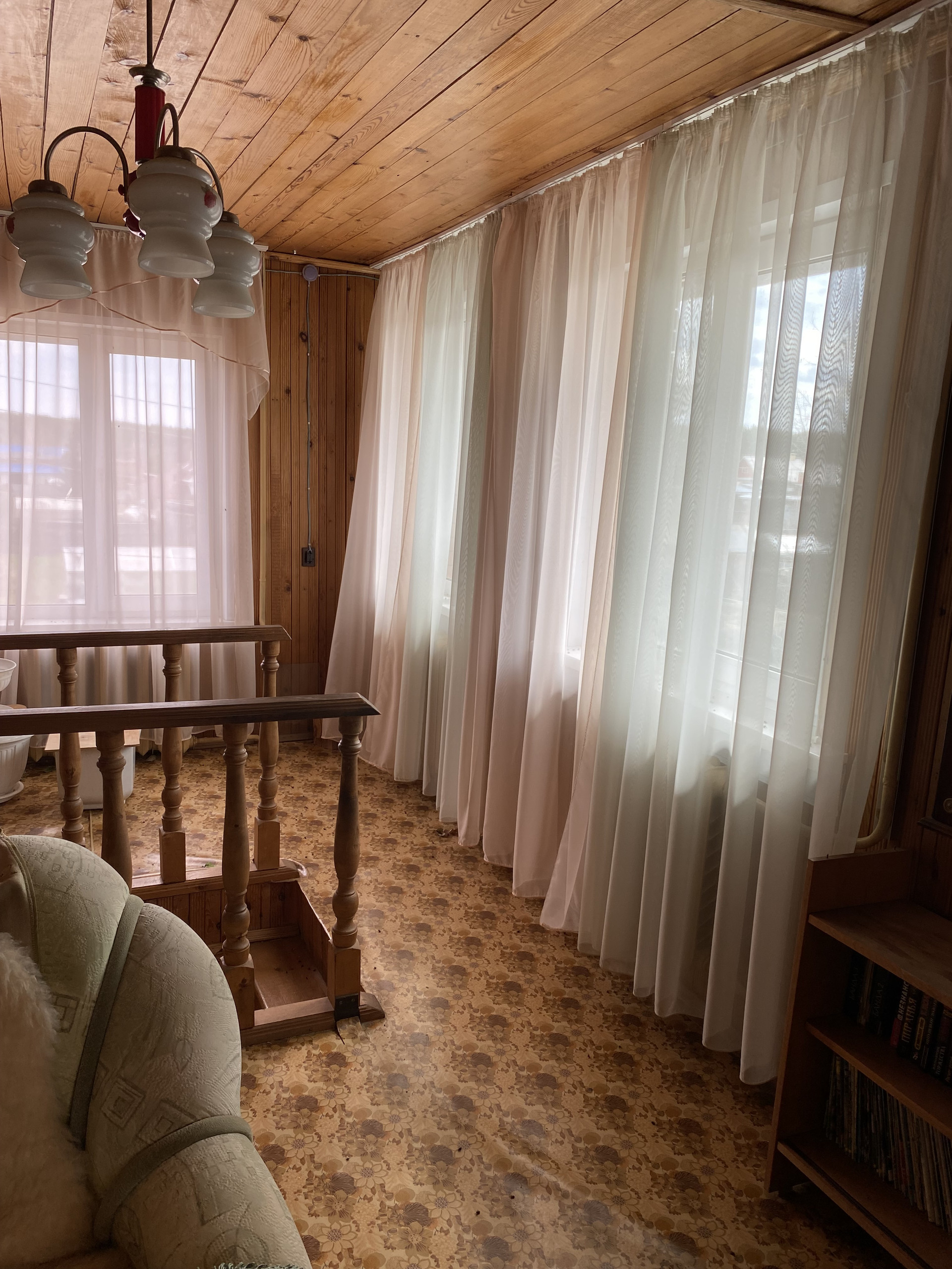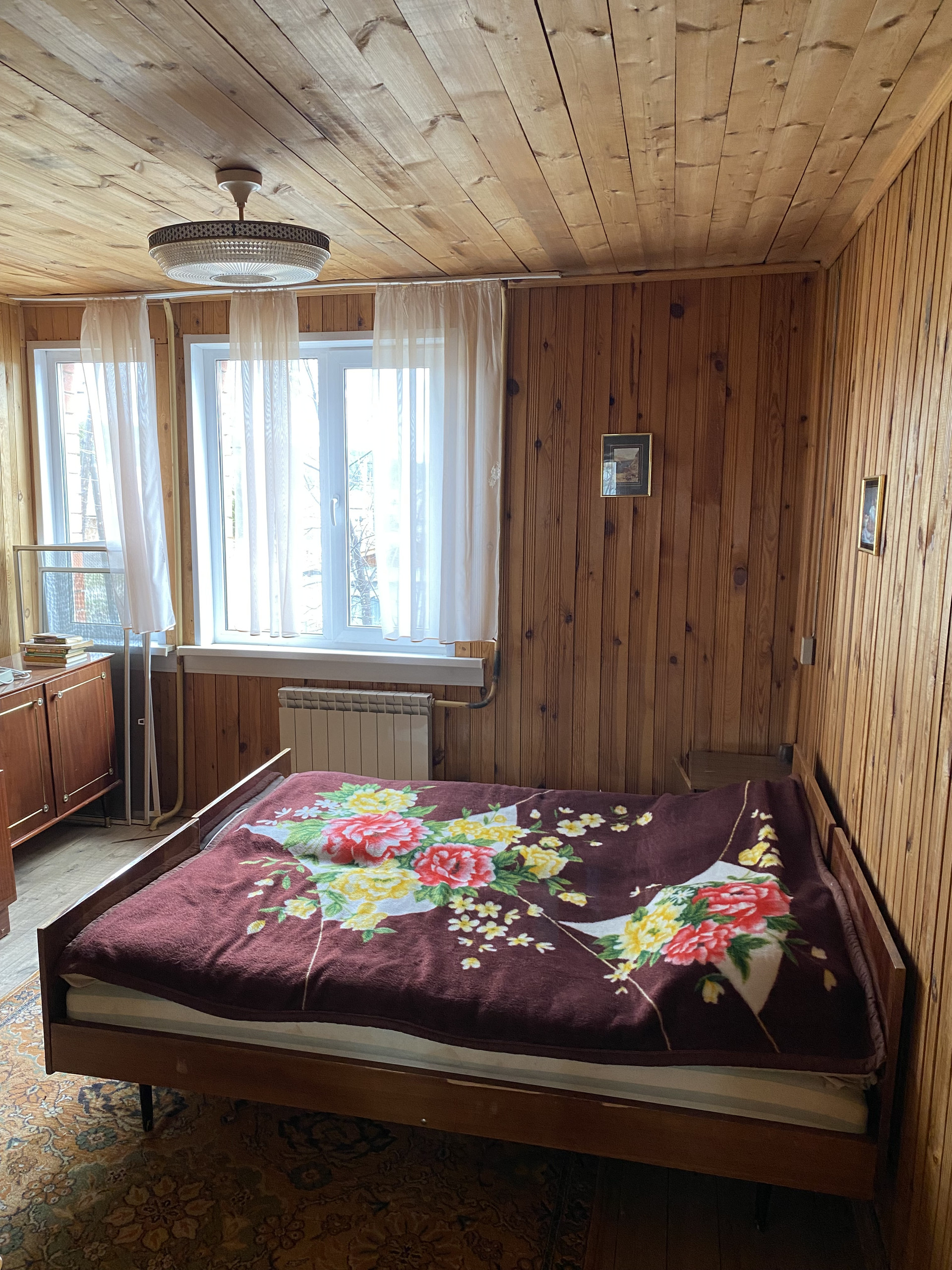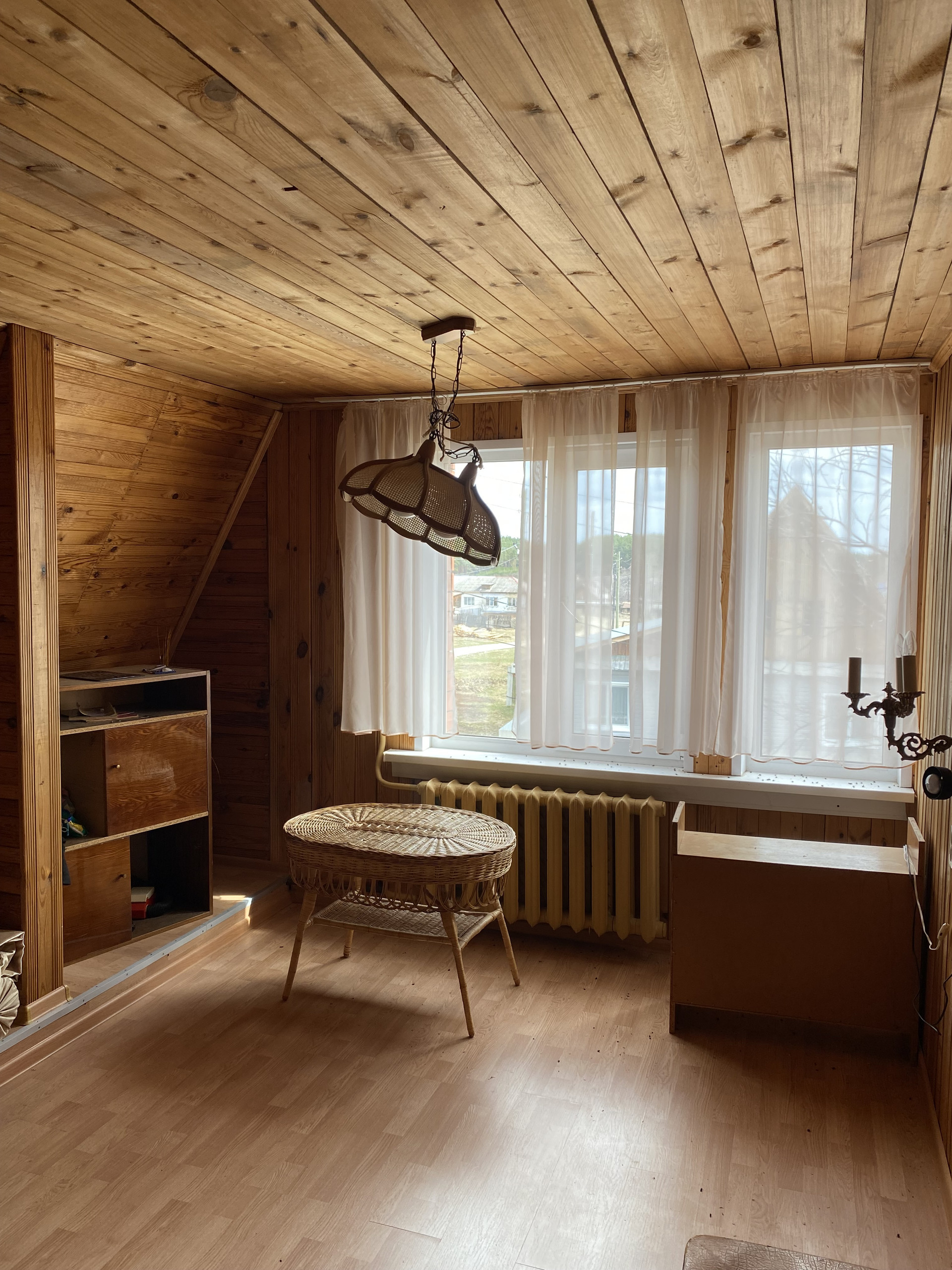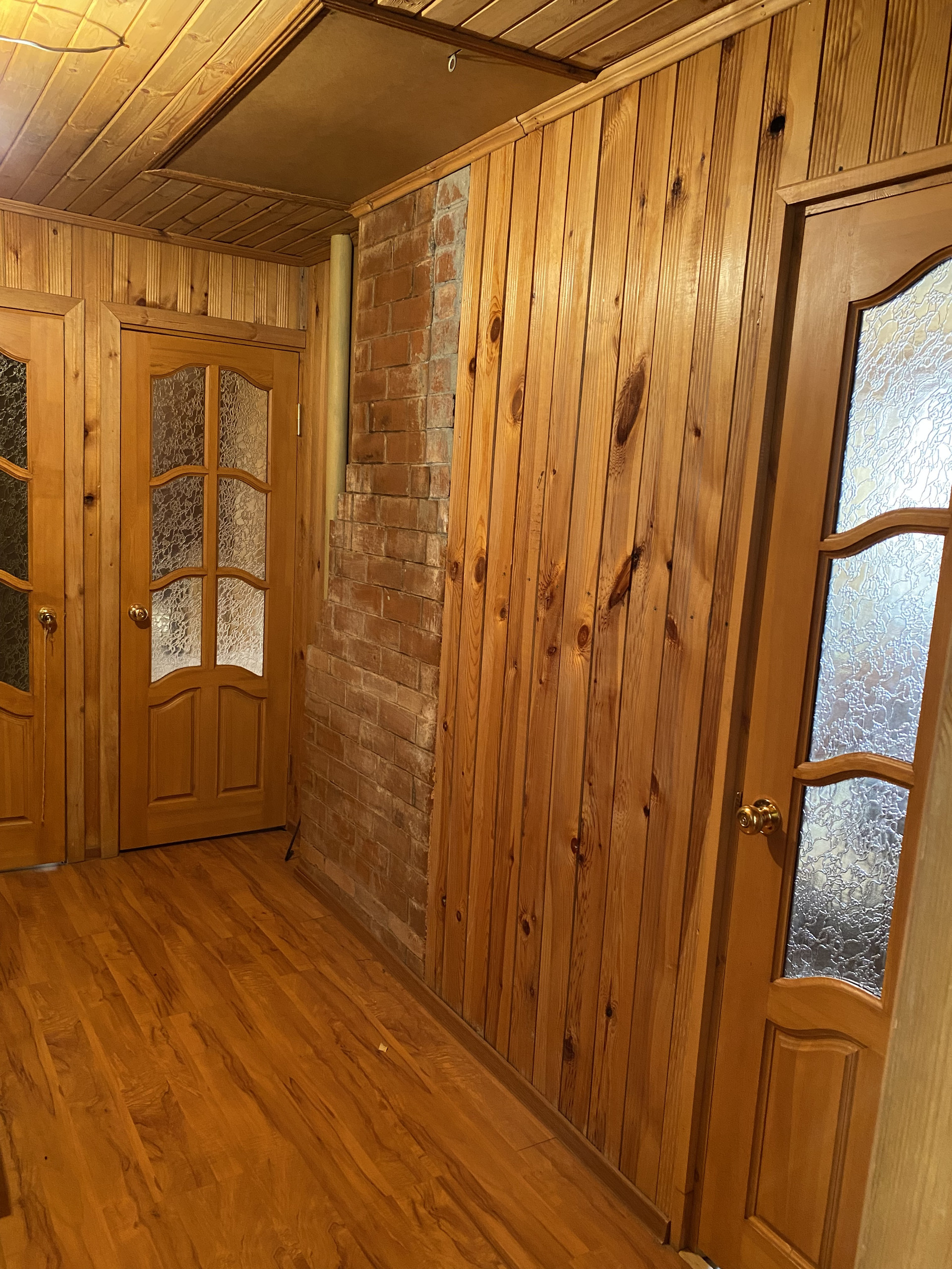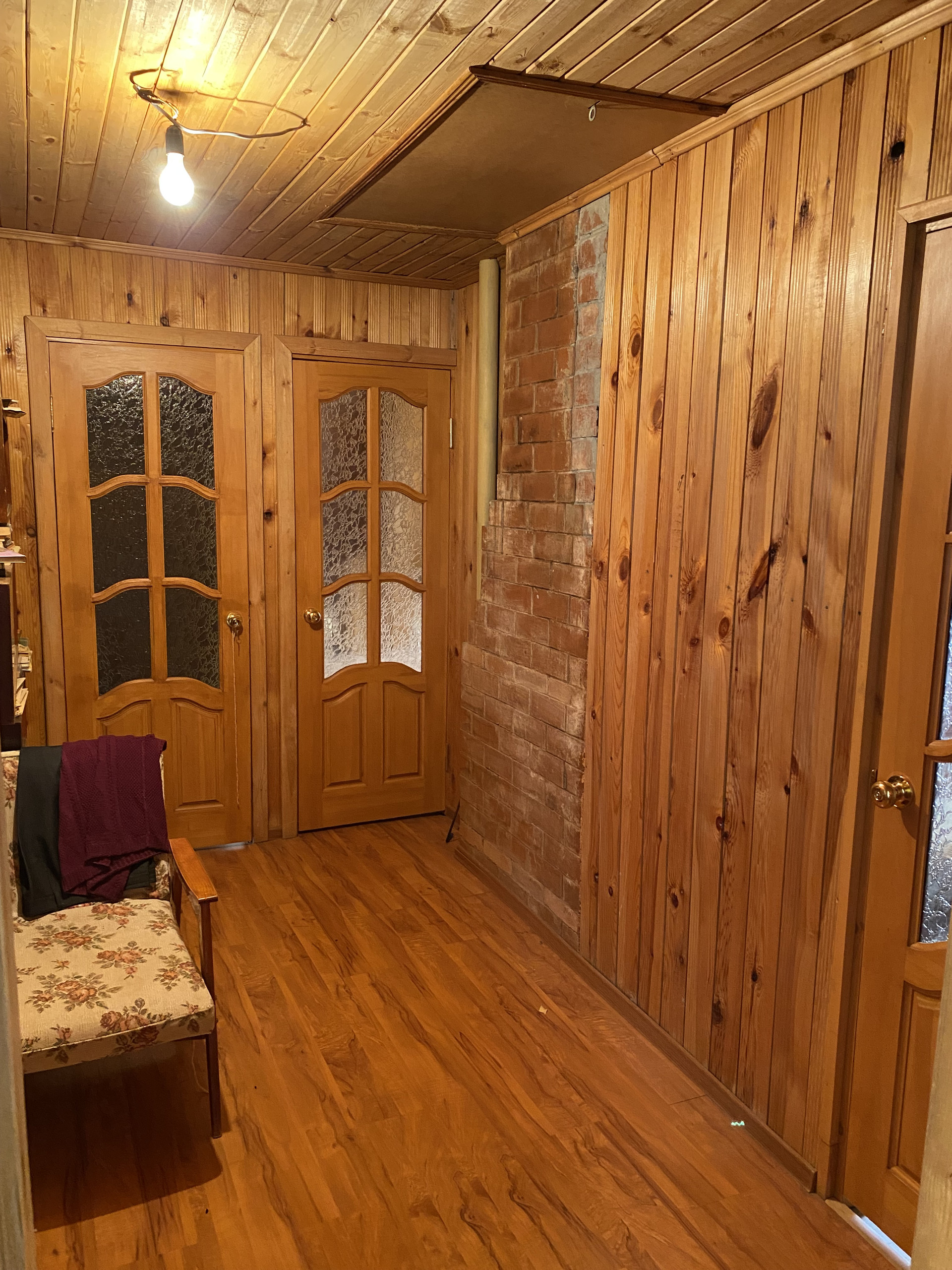 Дом изготовлен из бревна, второй этаж из коркаса, облицован кирпичем, внутри отделан вагонкой, окна – пластиковые стеклопакеты.