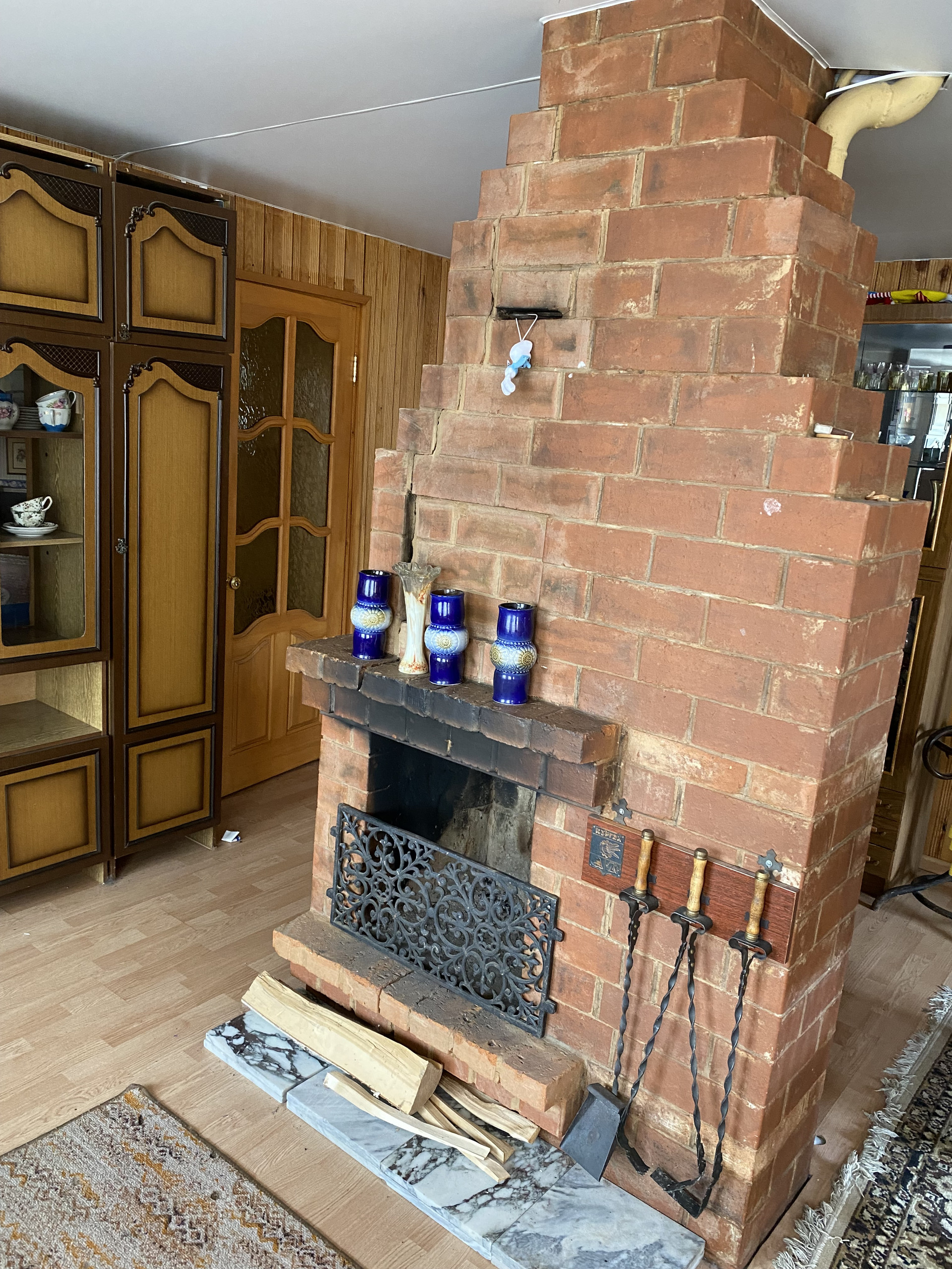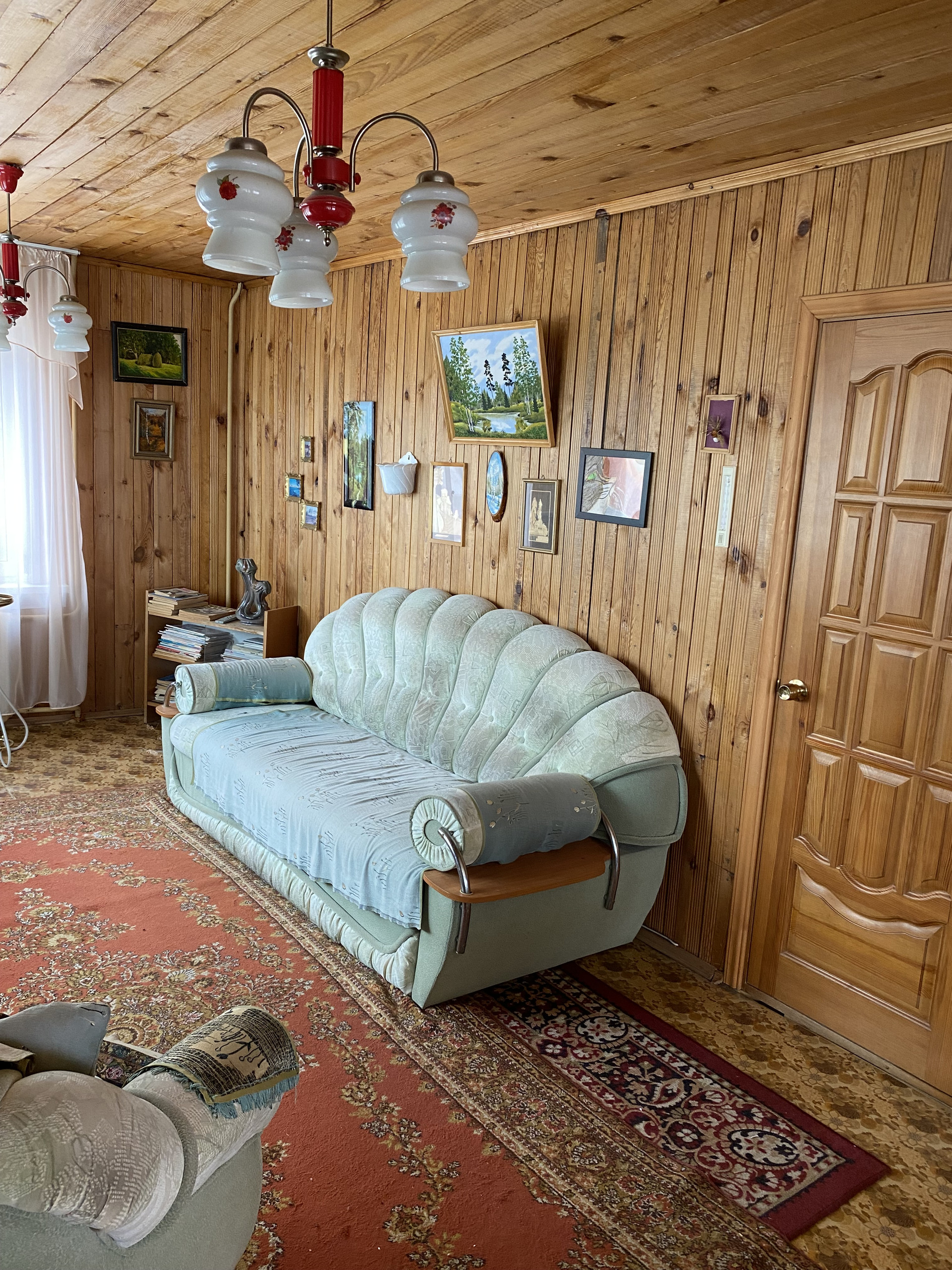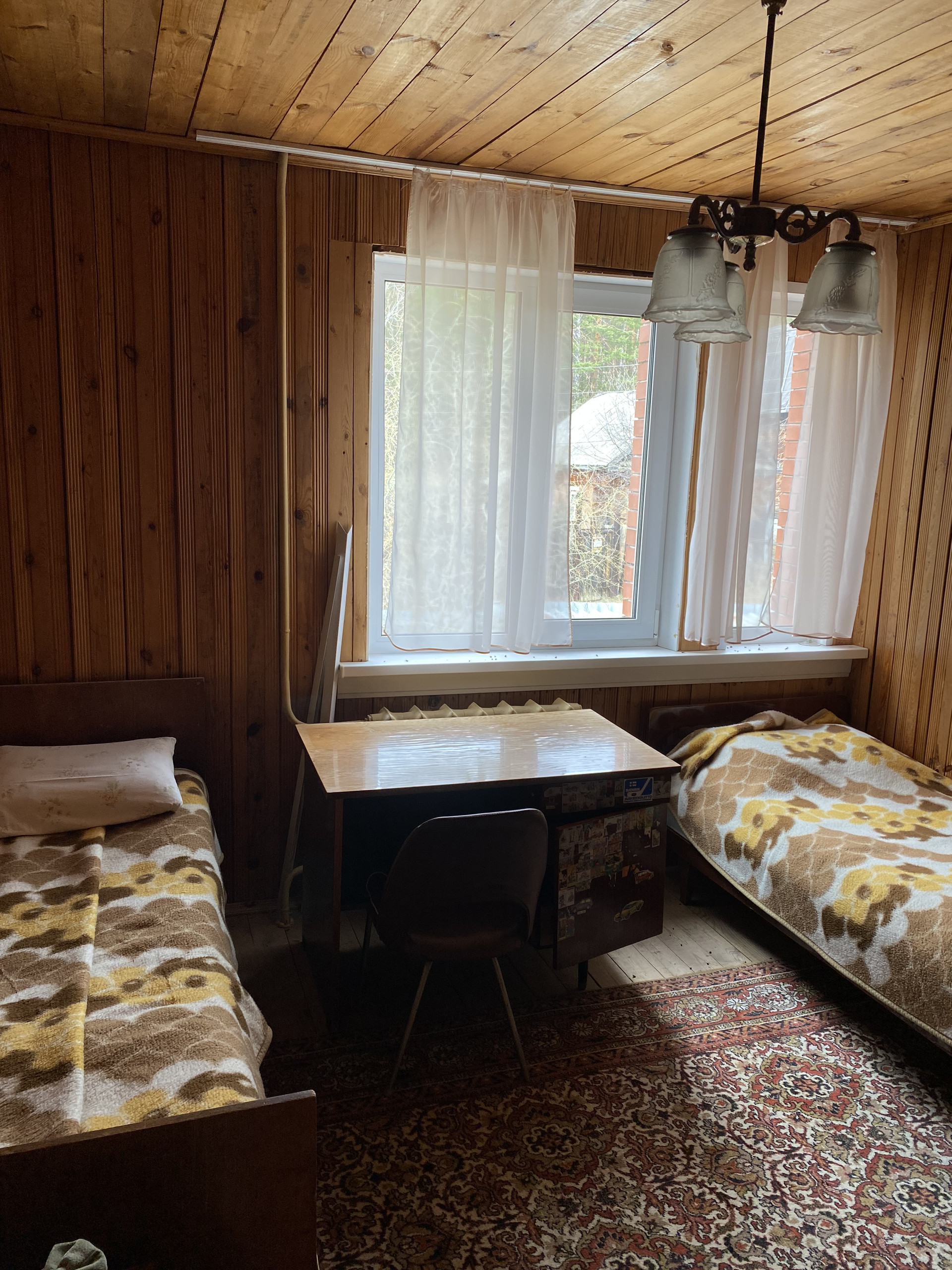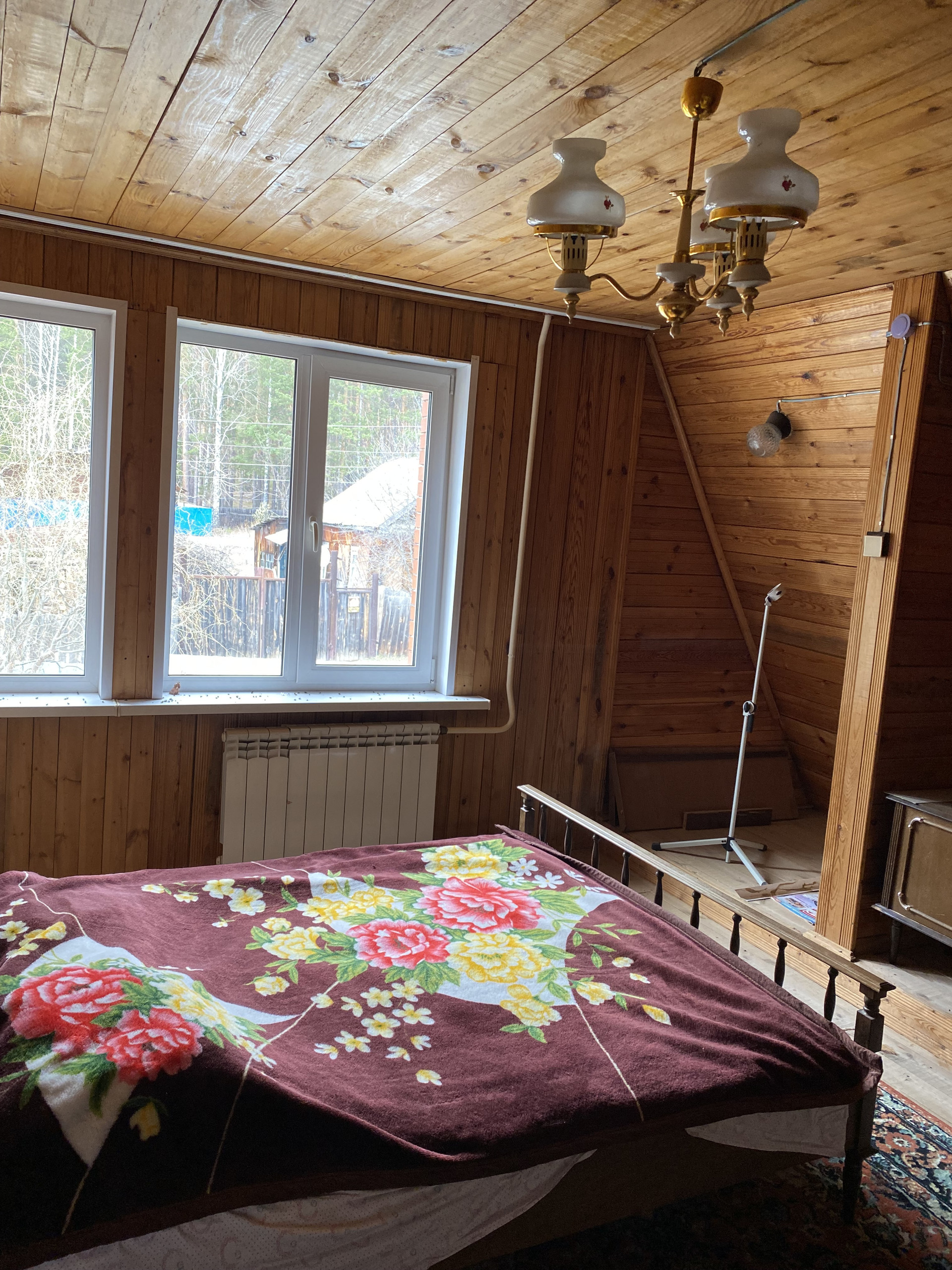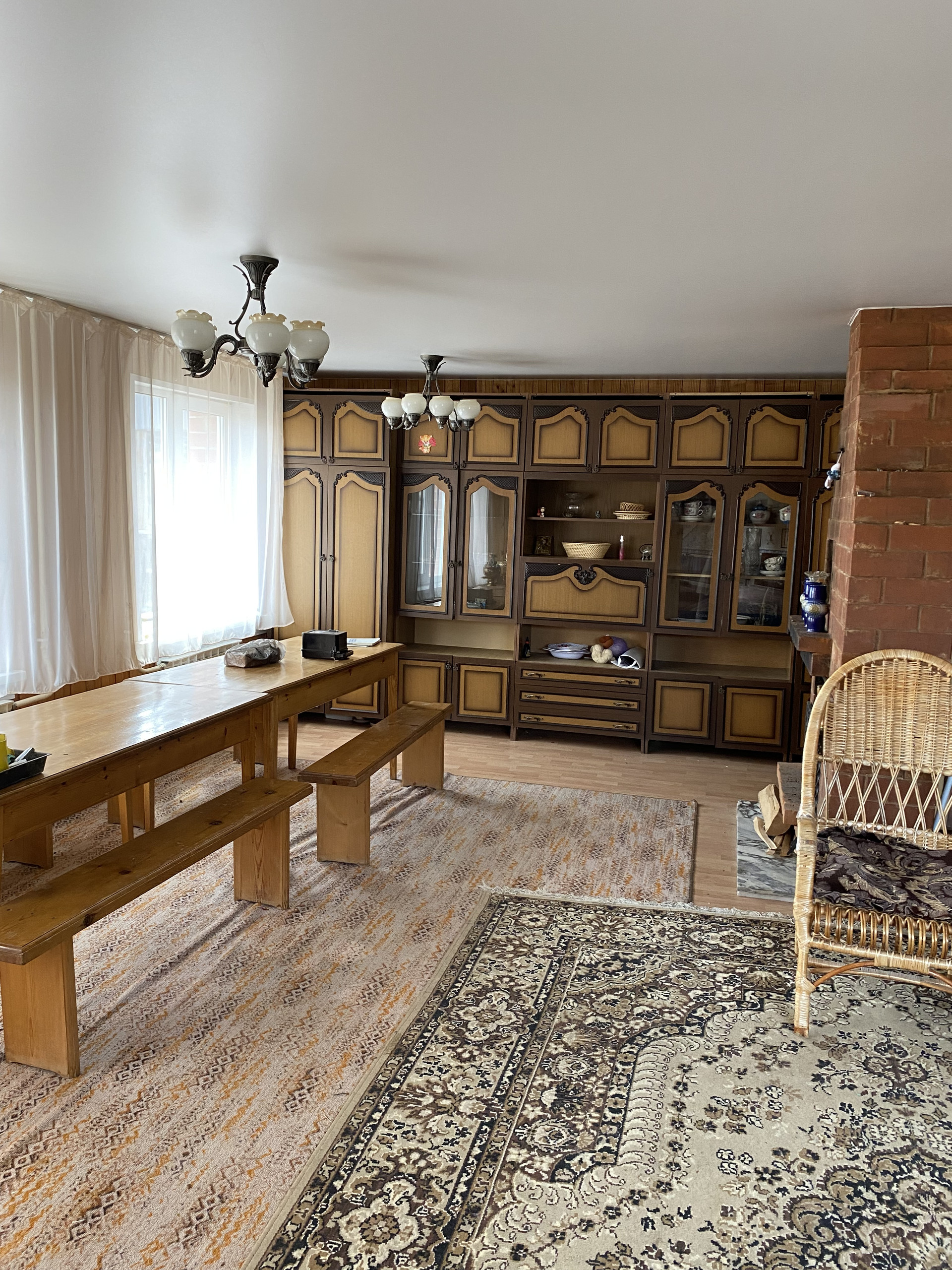 Дом изготовлен из бревна, второй этаж из коркаса, облицован кирпичем, внутри отделан вагонкой, окна – пластиковые стеклопакеты.