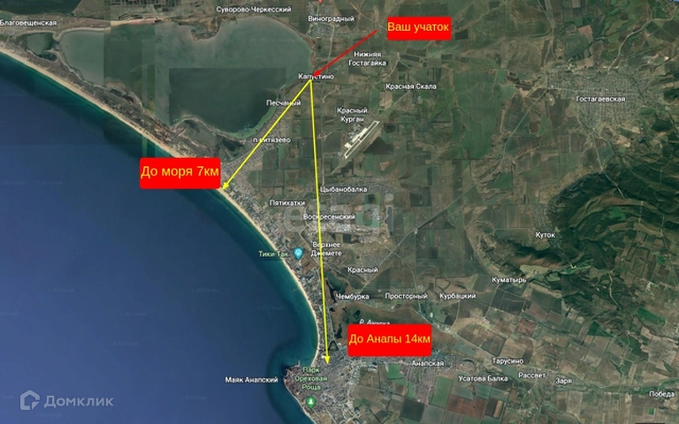 в 14 км от г-к Анапа находится земельный участок общей площадью 10,39 соток. Фасад участка 30 метров, глубина 36 метров. Назначение ИЖС. Свет, вода по меже. Участок разработан, ухожен. Правильной формы. На участке имеется одноэтажное строение в черновой отделке, которое можно использовать под жилой дом. Много плодовых деревьев и кустарников: смородина, ежевика, малина, яблоня, инжир, персик, черешня, виноград.