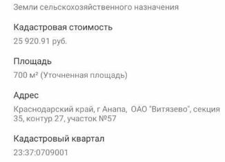 Продается участок в пригороде Анапы, хуторе Капустино . Участок площадью 7,5 соток, правильной прямоугольной формы. Фасад составляет 20 м, глубина 38 м. Коммуникации: свет проходит по границе участка, газ и вода в перспективе. Местоположение очень тихое и спокойное, свежий воздух, плодородные земли, удобные подъездные пути.Участок граничит с Витязевски... |