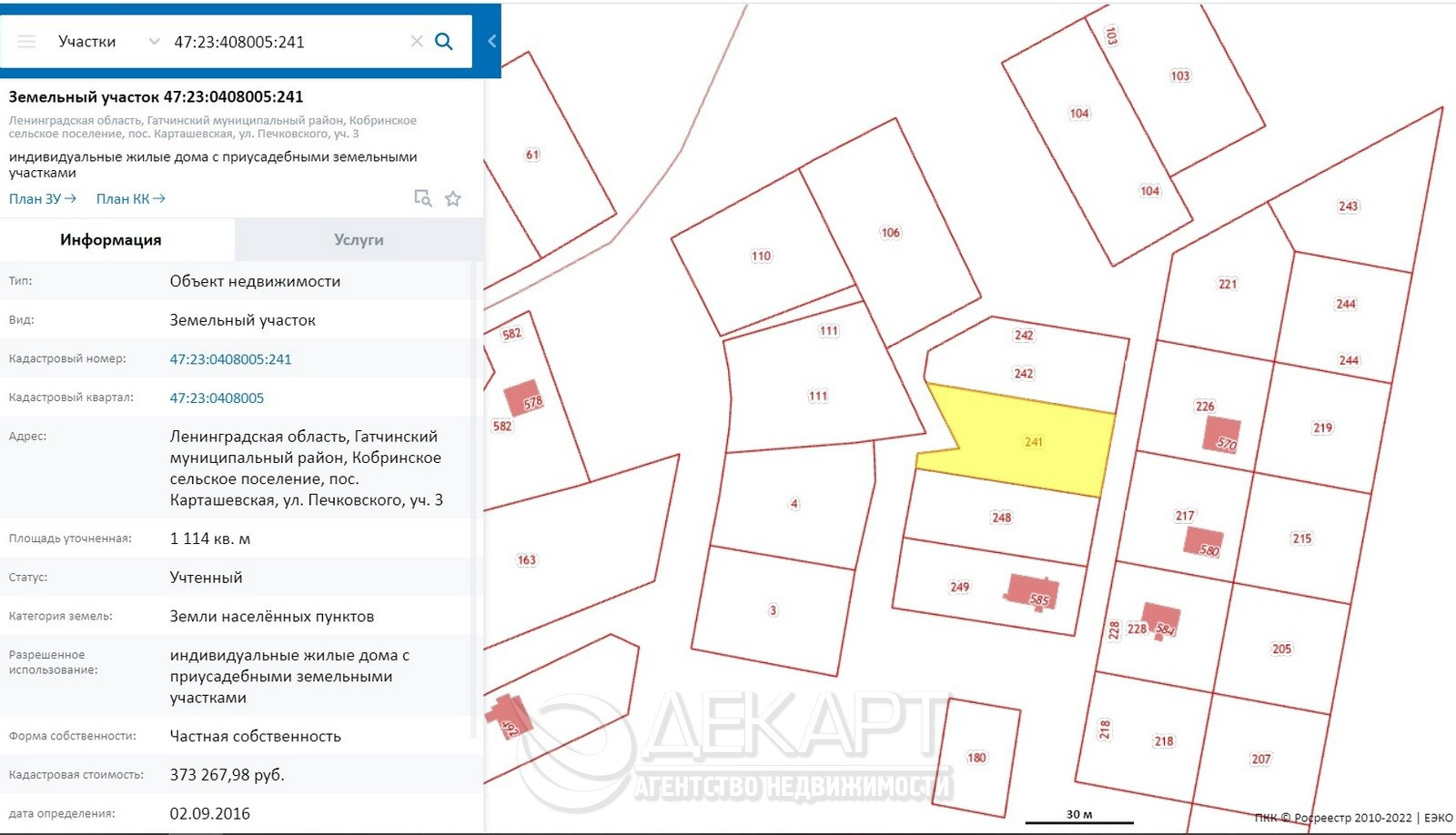 Участок находится в обжитом посёлке «Карташевская», площадью 11 соток. Подведена линия электроснабжения 15кВт, можно подключаться (соседи подключены), возможность подключения ГАЗа в ближайшее время, в поселке провели магистральный газопровод, идёт ввод объекта в эксплуатацию и будет возможно подключение, отсыпан подъезд из щебенки с фронтальной стороны, многие соседи уже построились, осталось три участка. Живописное место, лес в 300 метрах, маленькое лесное озеро 1км пешком, где можно купаться, в которое впадает река «Кобринка», в поселке есть магазин продуктов, супермаркеты Пятерочка, Магнит, детский сад и школа в поселке «Кобрино» в 5 км езды, ж/д станция «Карташевская» в 1км, Успенская церковь 4км.