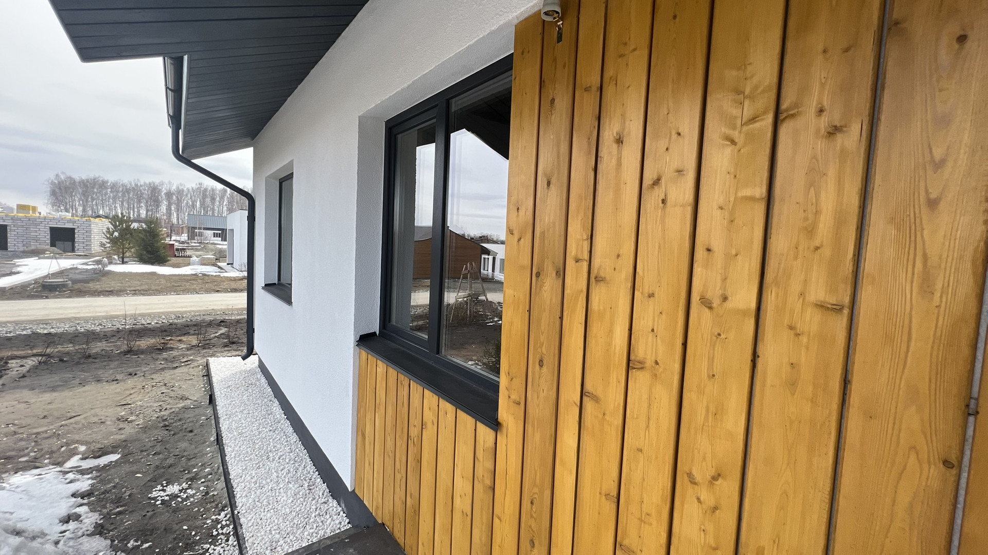 * Внешняя отделка фасадов и карнизов: декоративная штукатурка и строганная доска