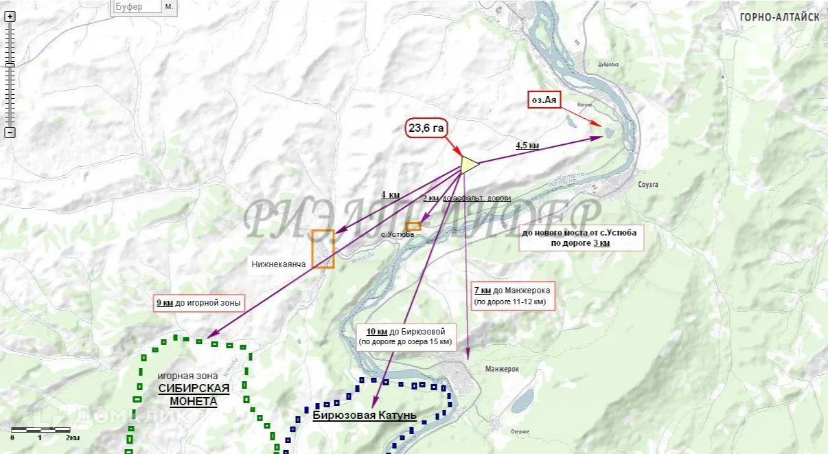 Земельный участок 24 га в логу между озером Ая и пос. Нижнекаянча ( по дороге на Бирюзовую Катунь). Земля в собственности. Отличный вид, как реку Катунь, гору "Чертов Палец", так и на озеро Ая. Ни для кого ни секрет, что Алтайский край является курортной зоной. Благодаря его здоровому климату, на Алтае развивается туризм, открываются все новые курорты . В 15 км от участка расположена игорная зона "Сибирская Монета" и развлекательный комплекс "Бирюзовая Катунь". Также рядом Манжерок. Участок подойдет для горнолыжного туризма с подъемником, как в Манжероке.