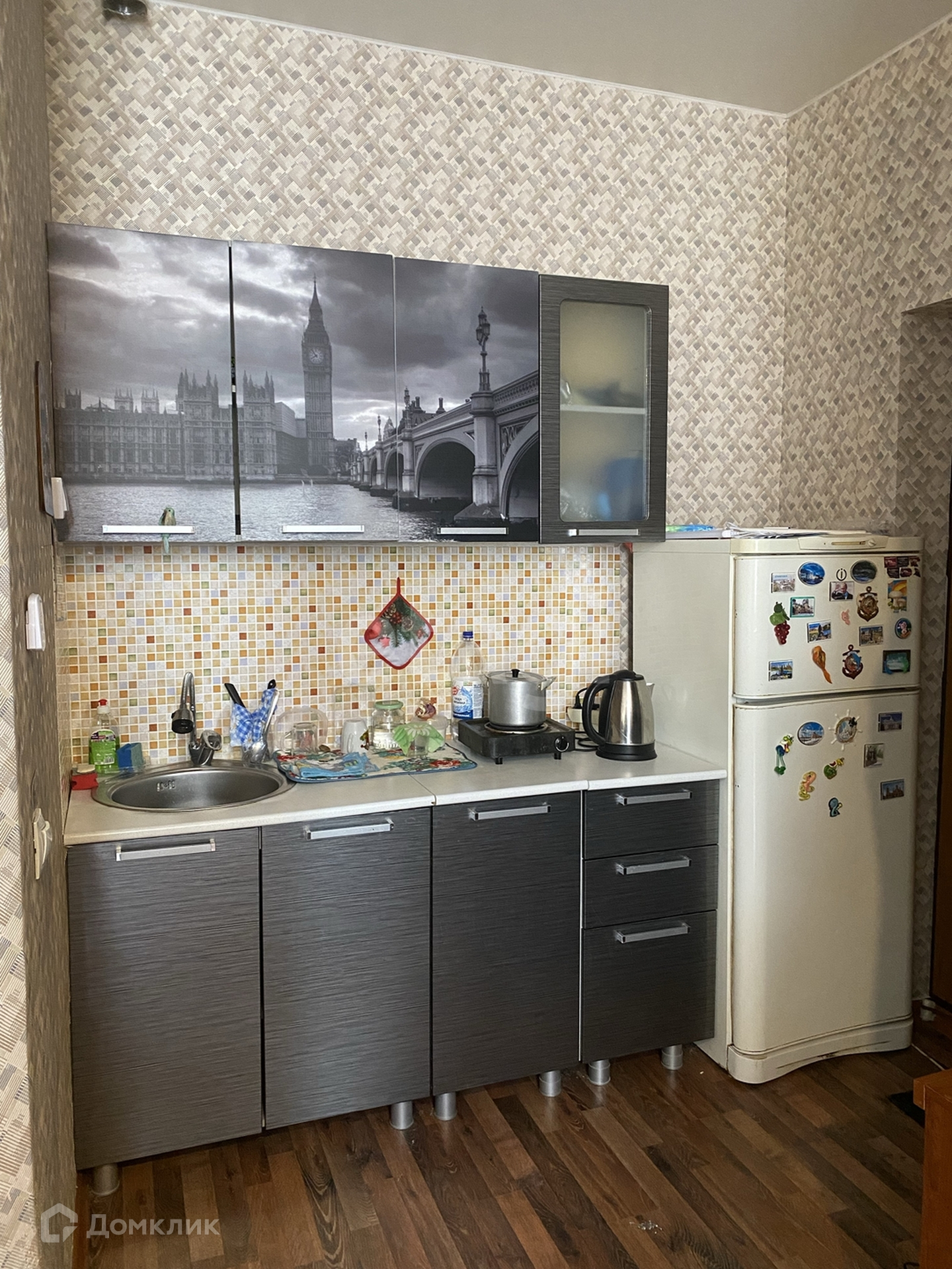 На кухне остается кухонный гарнитур.