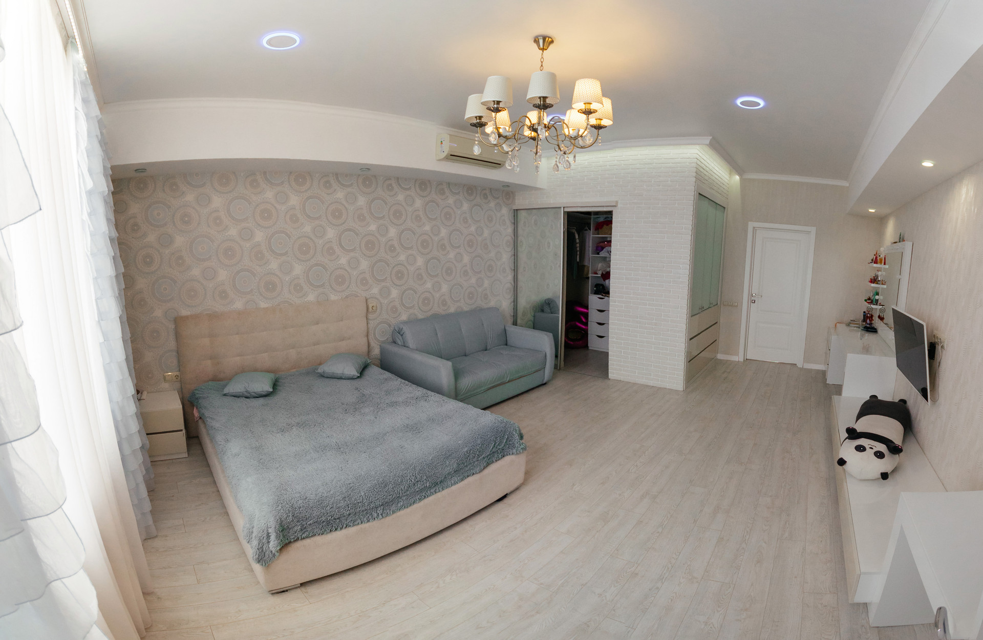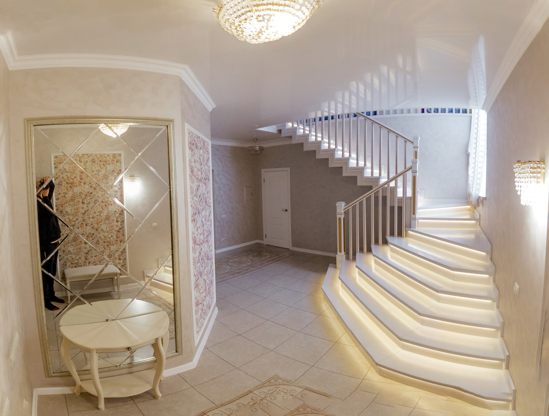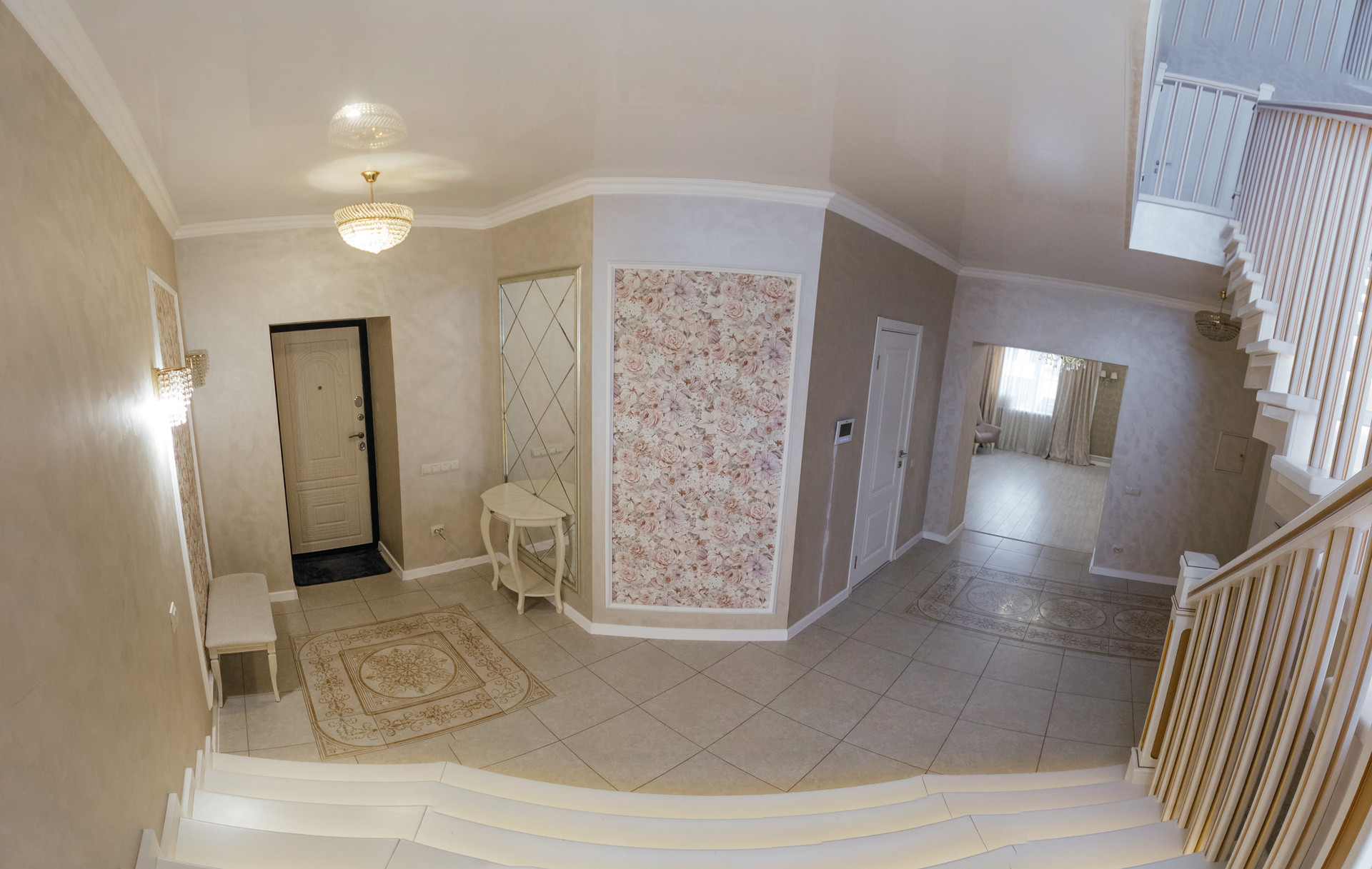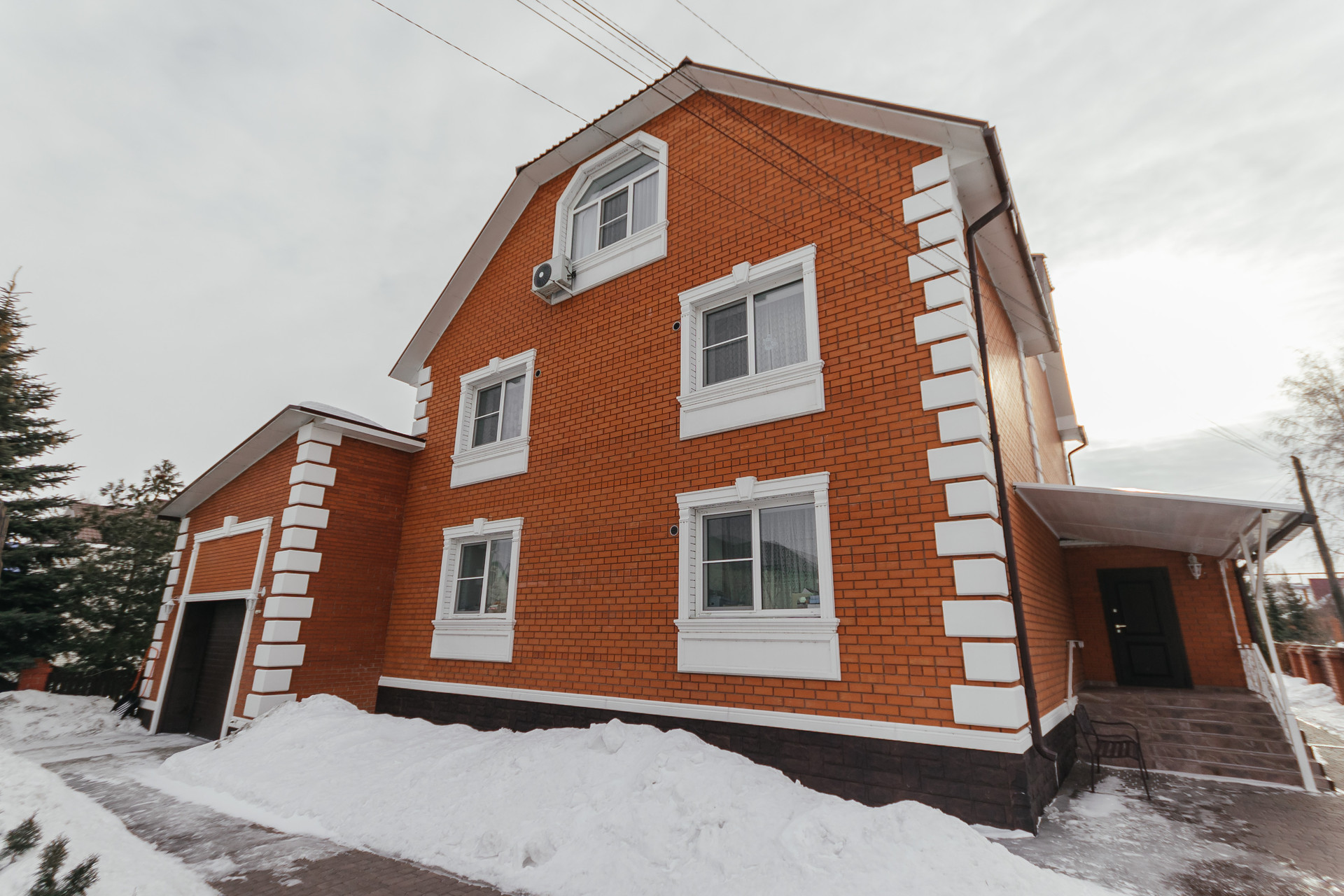 Вход в дом через шикарную веранду. На первом этаже выполнены теплые полы, декоративная штукатурка.