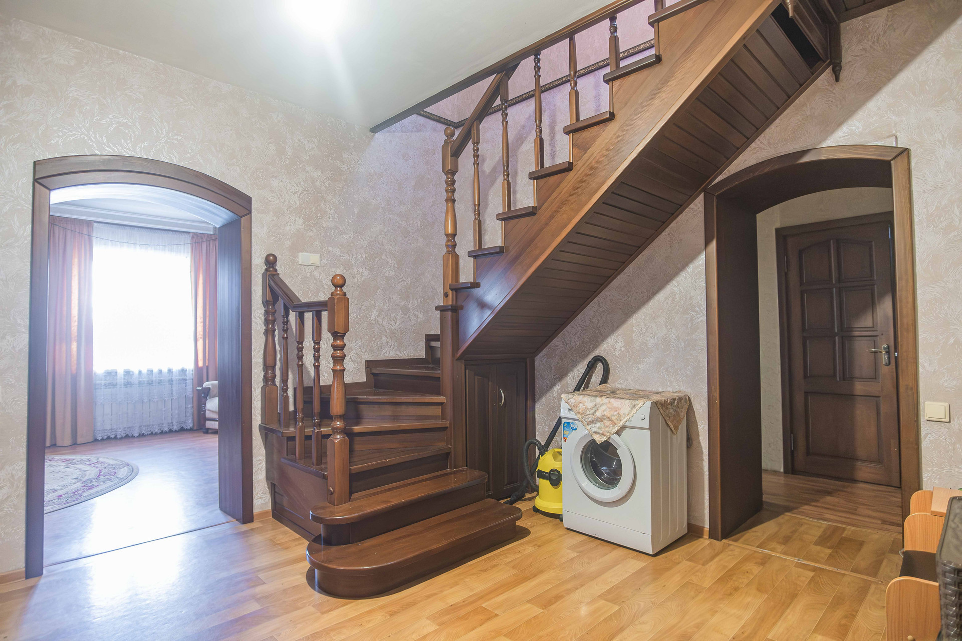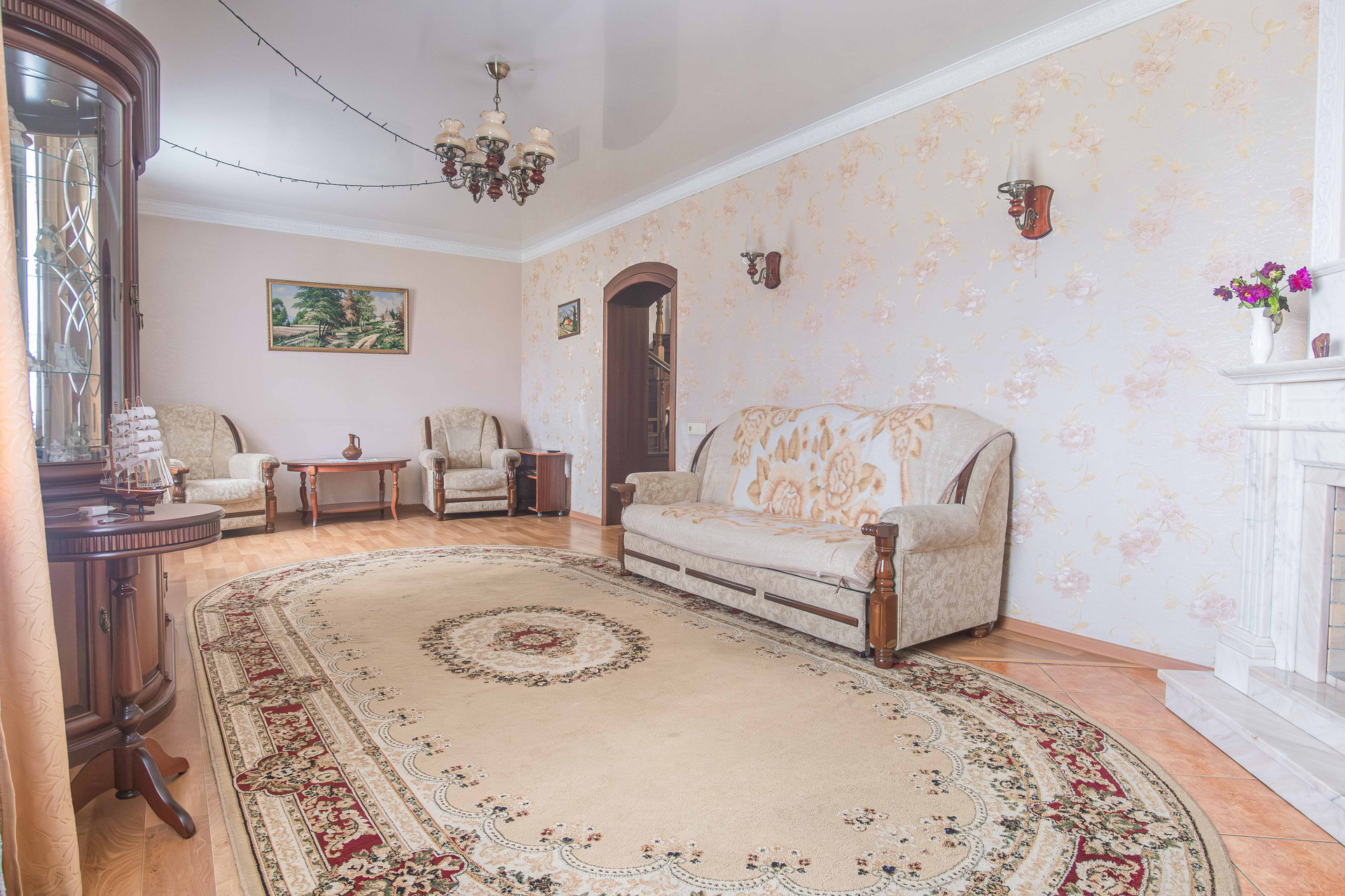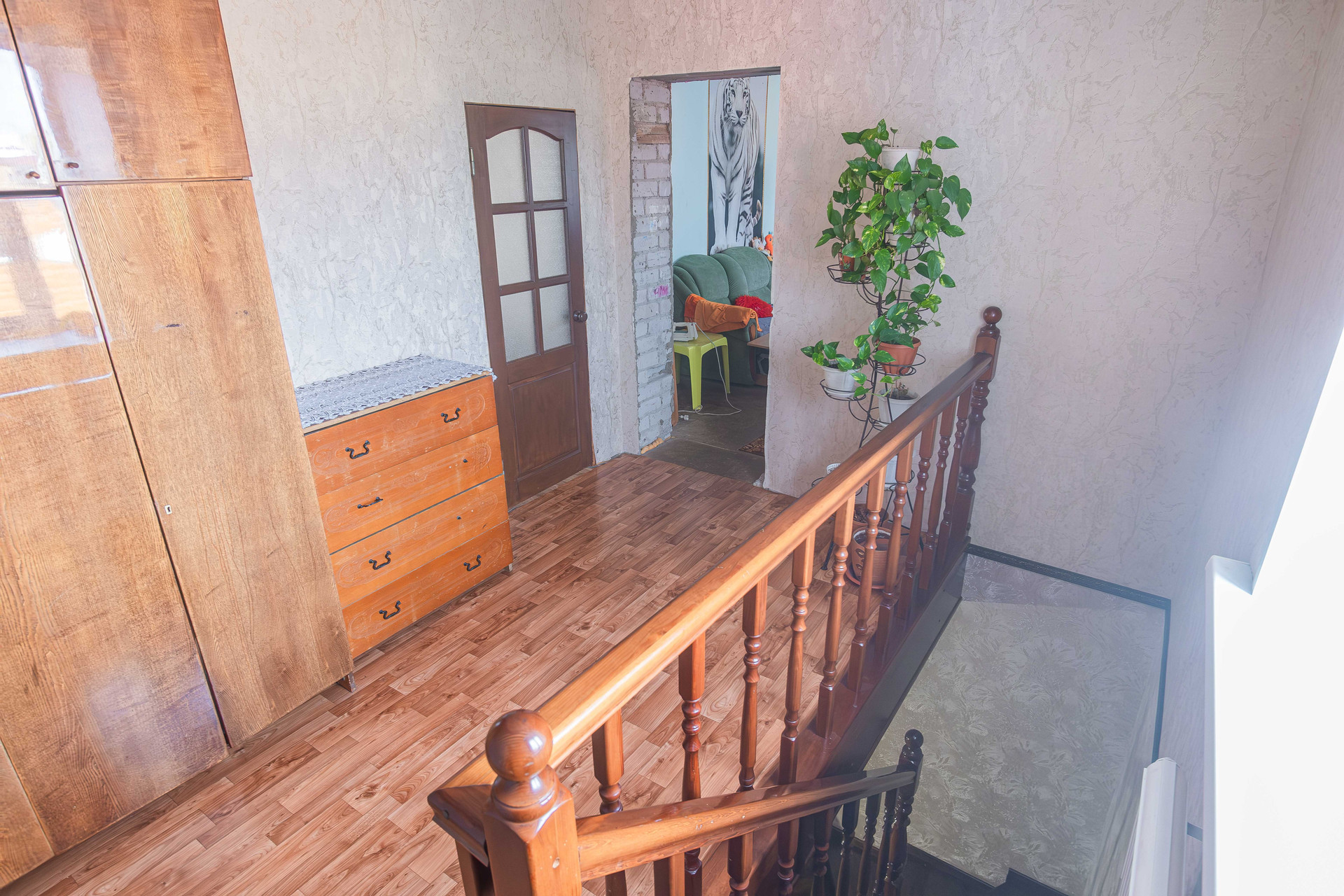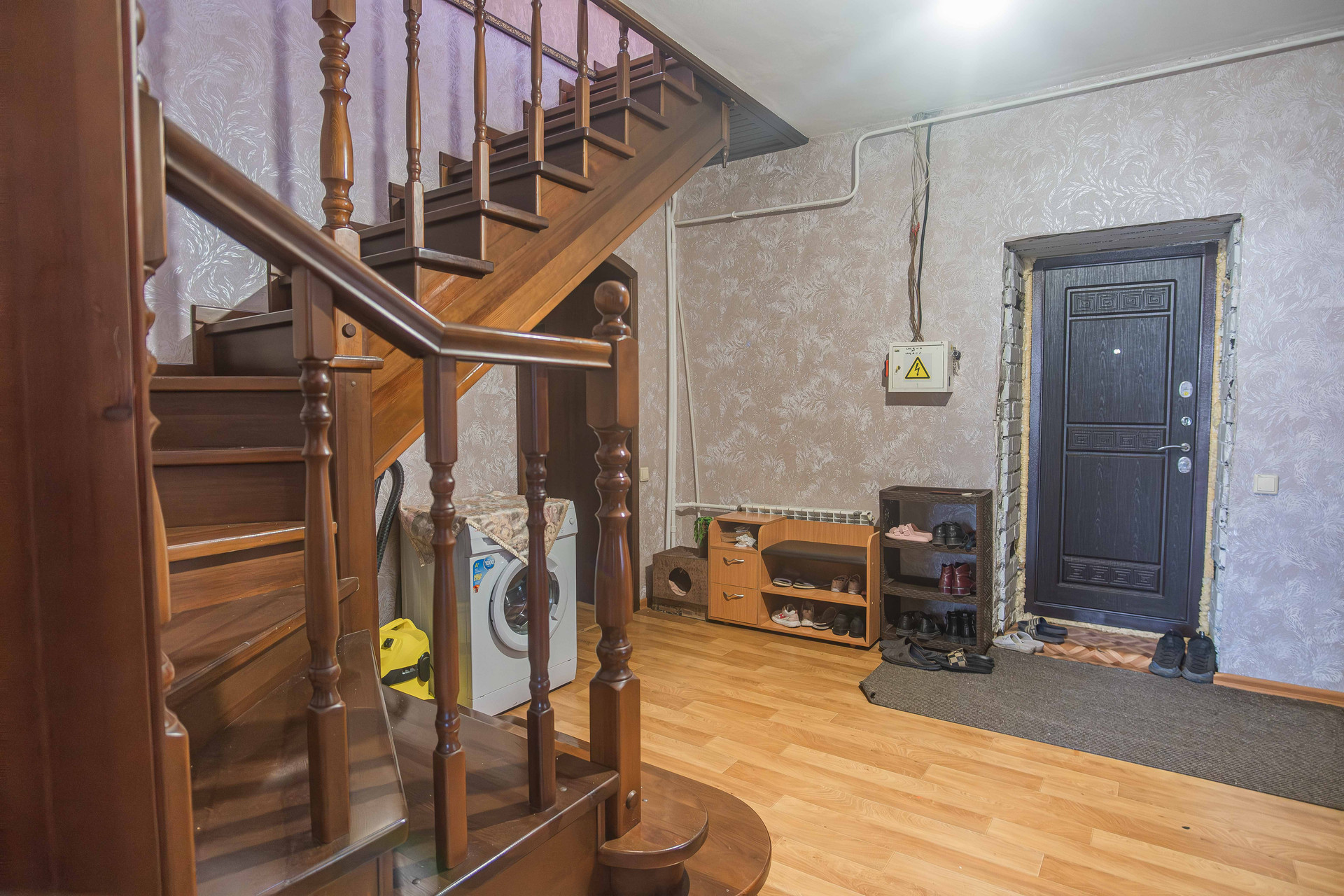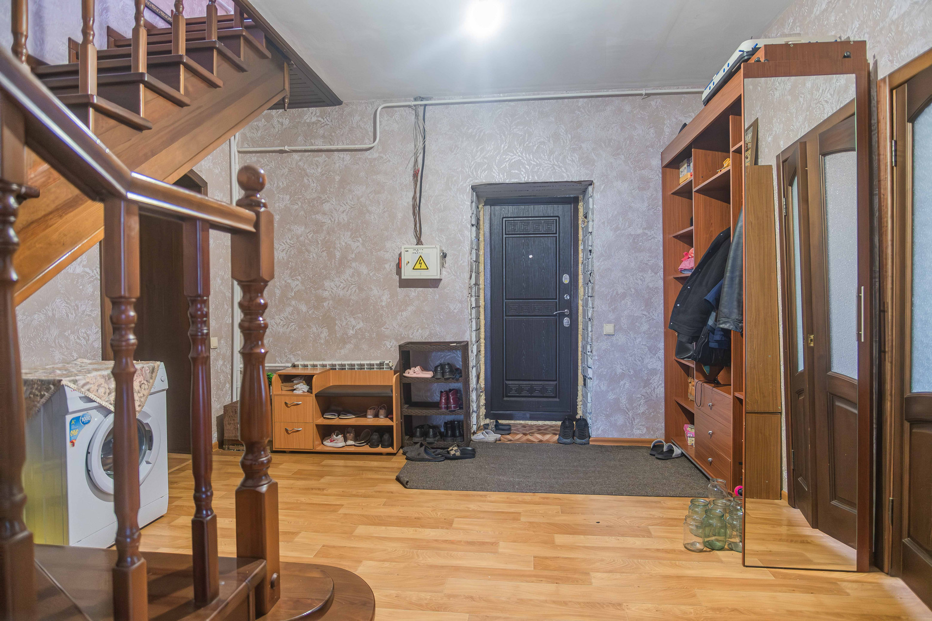 Конструктив дома: кирпич, обшит сайдингом. Канализация, газовое отопление, гараж с автоматическими воротами, баня, участок огорожен забором. Планирорвка позволяет проживать большой семье. Два входа в дом. На первом этаже расположены кухня, зал, рабочий кабинет, сан узел с душевой кабиной. На втором этаже три отдельные спальни.