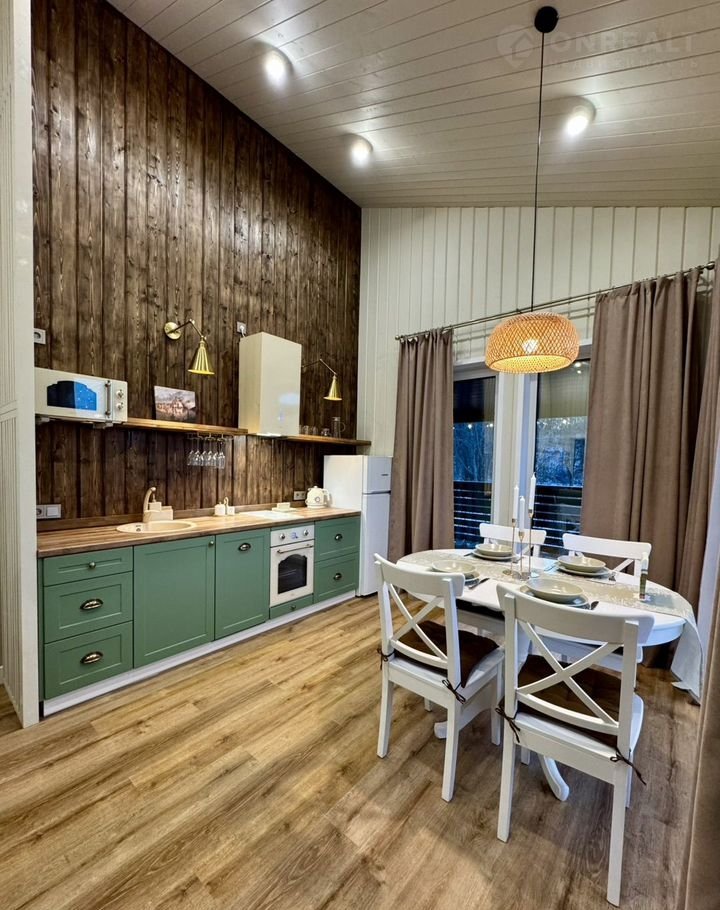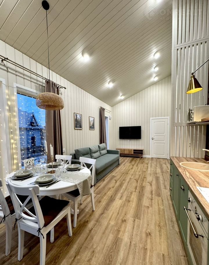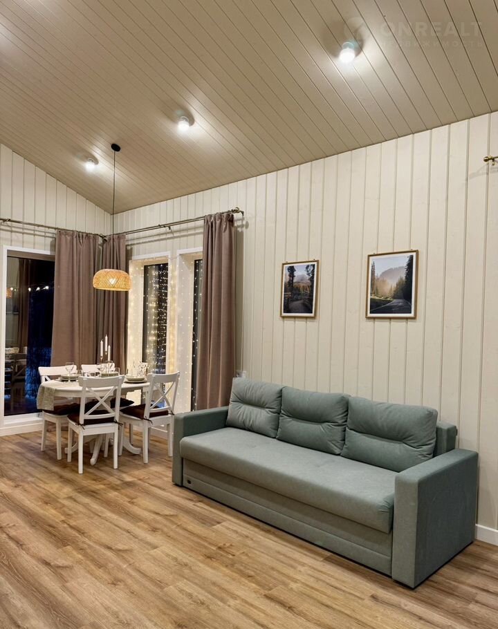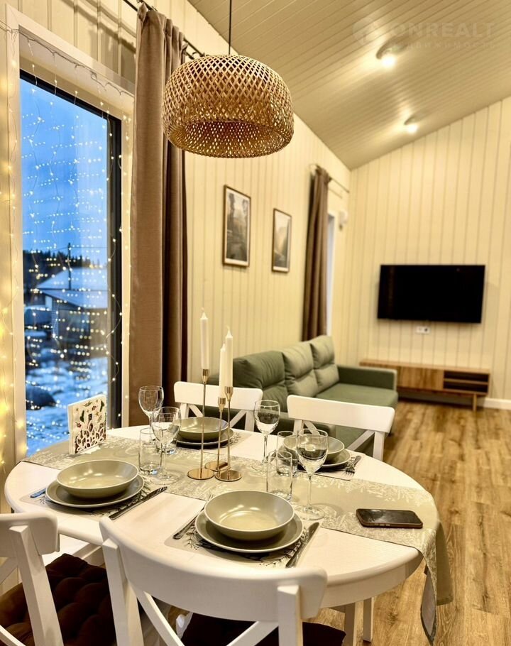 В доме просторная кухня- гостиная с большими панорамными окнами,полностью оборудованная кухня с посудомоечной машиной, так же в гостиной имеется раскладной диван со спальными местами. Отдельная спальня с большой двуспальной кроватью, комодом и прикованными тумбами для удобного хранения ваших вещей. Душевая комната с удобным хранением банных принадлежностей, а так же финская электросауна с обливным ведром.Отдельный санузел. Комфортная терраса с освещением.