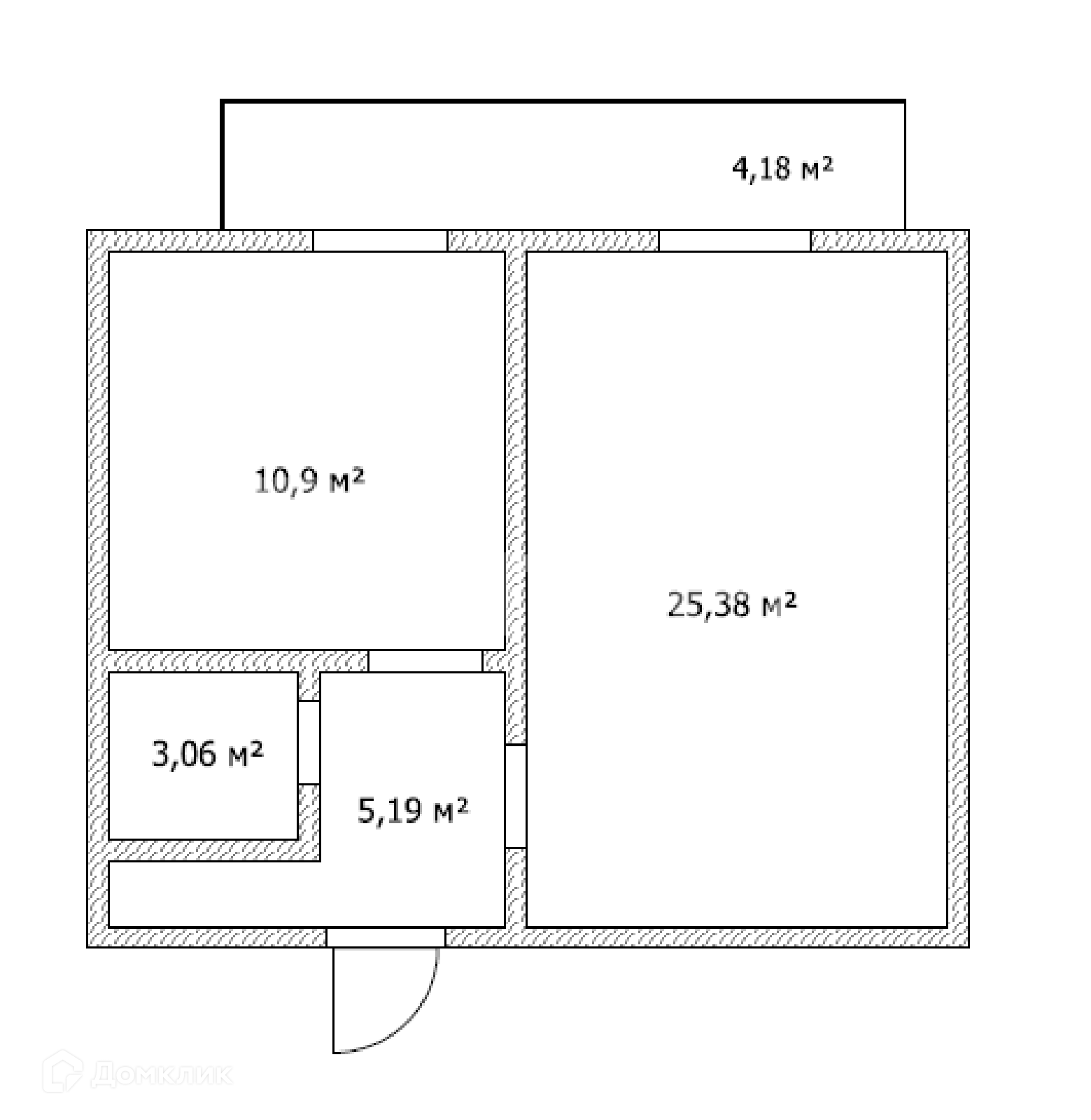 Просторная комната — 25,38 м². Кухня — 10,9 м². Коридор — 5,19 м². Санузел — 3,06 м². Балкон — 4,18 м², выход на балкон из кухни и комнаты