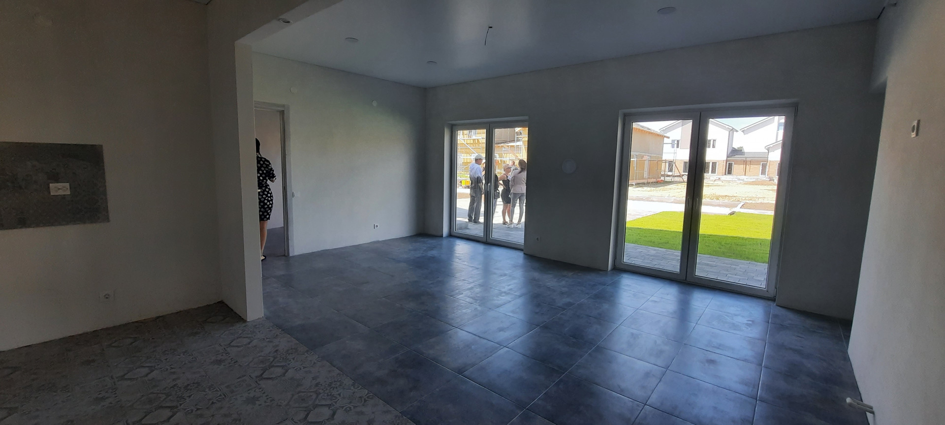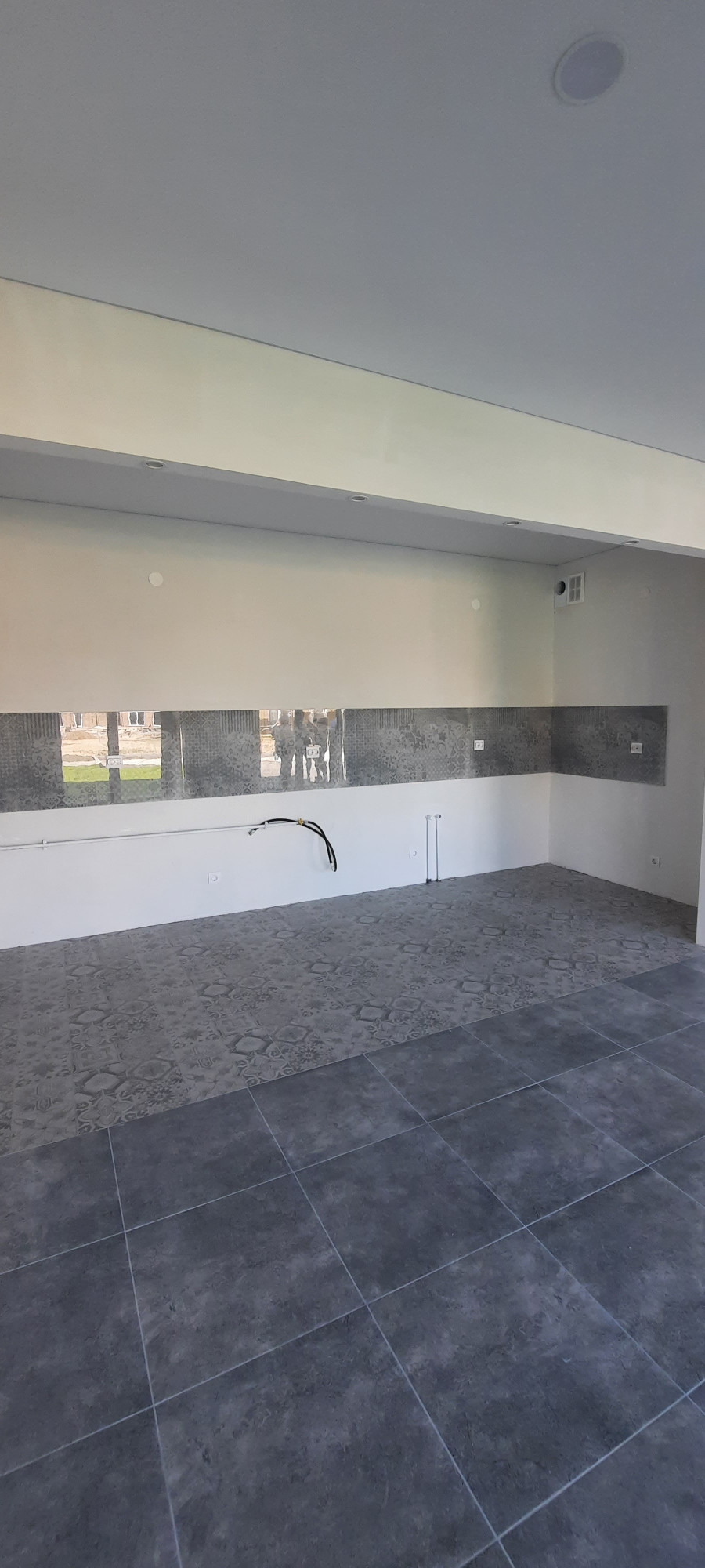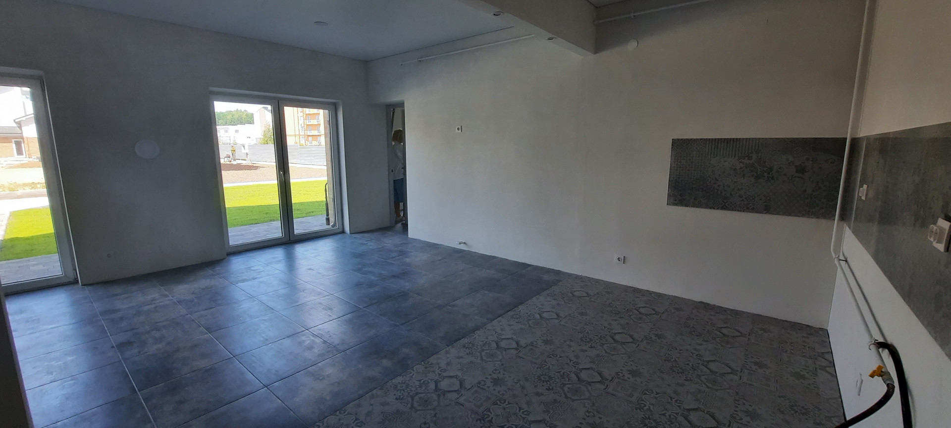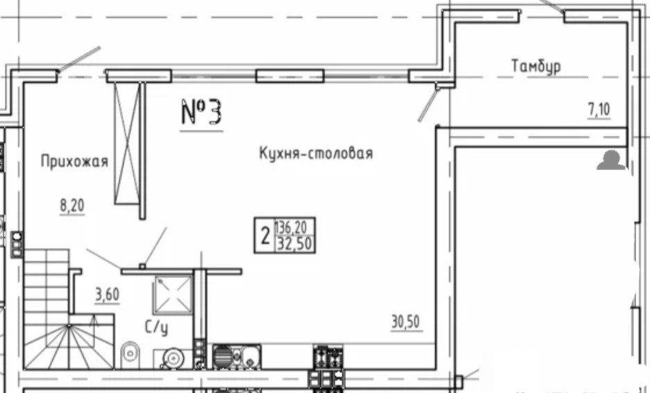 На первом этаже кухня-гостиная с панорамным остеклением 32,5 кв.м ; котельная -постирочная 7,1 , прихожая  и санузел.
