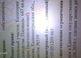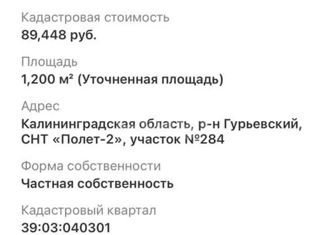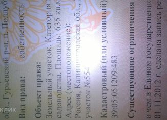 Продается земельный участок 617 кв.м., СНТ Полет, Гурьевский район, поселок Храброво |