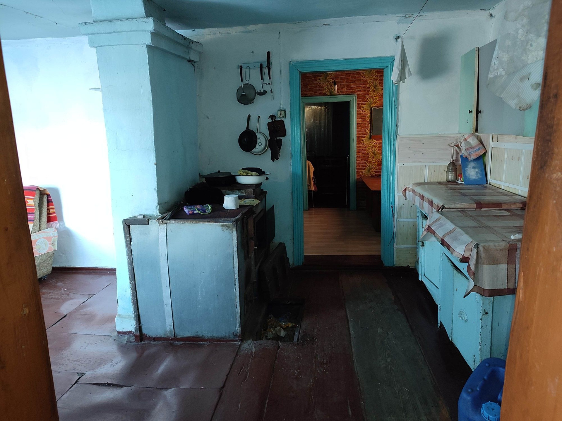 Отопление - печное, освещение - электрическое, водоснабжение - своя скважина на участке с огородом/колодец в конце улицы, санузел на улице, баня под одной крышей с домом, телевидение - спутниковое. Общая площадь дома, крытой веранды, летней кухни и кладовки под одной крышей около 100кв.м., так же имеется возможность расширить жил.площадь за счёт второго этажа над домом.