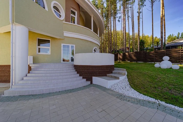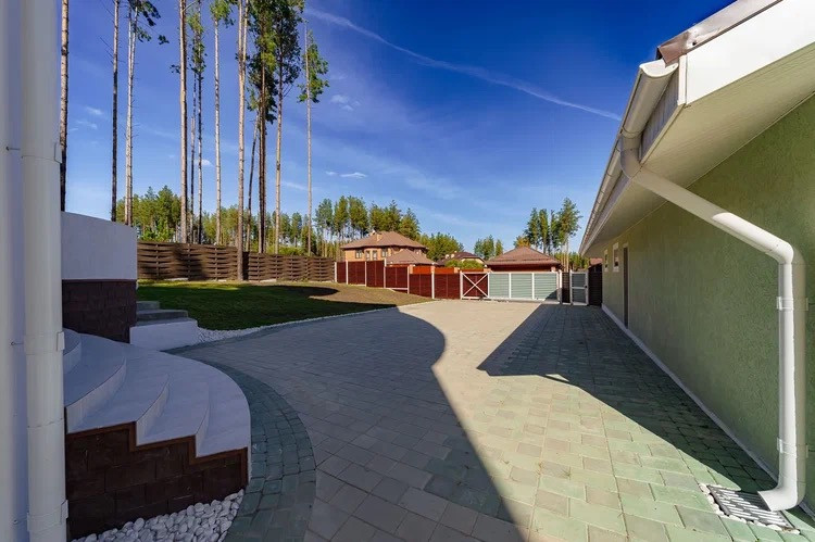 Участок предназначен для строительства жилого дома. Имеет правильную прямоугольную форму. На участке растут сосны и газонная трава. Уложена качественная тротуарная плитка (производство ООО «Берит»), толщиной 80 мм, и разных ландшафтных форм (классико, квадрат, прямоугольник). Цвета: светло-серый и зеленый. Для отведения дождевой воды предусмотрена дренажная труба и колодцы. Фасадный забор выполнен с применением ламелей двух цветов (белый и коричневый под структуру дерева), ворота автоматические, откатные с фотоэлементами. Заезд выполнен из асфальта и тротуарной плитки. Перед домом устроен газон с декоративными шарами.