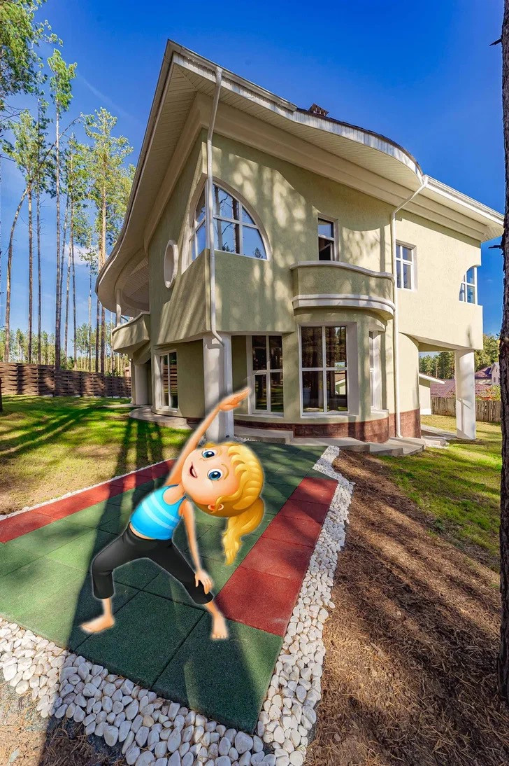 Не оставлен без внимания и здоровый образ жизни! Среди сосен устроена площадка для занятия спортом или йогой. Применено высококачественное травмобезопасное покрытие 45 мм, производство ООО «Ксил-Балтэкс» (г. Санкт-Петербург)