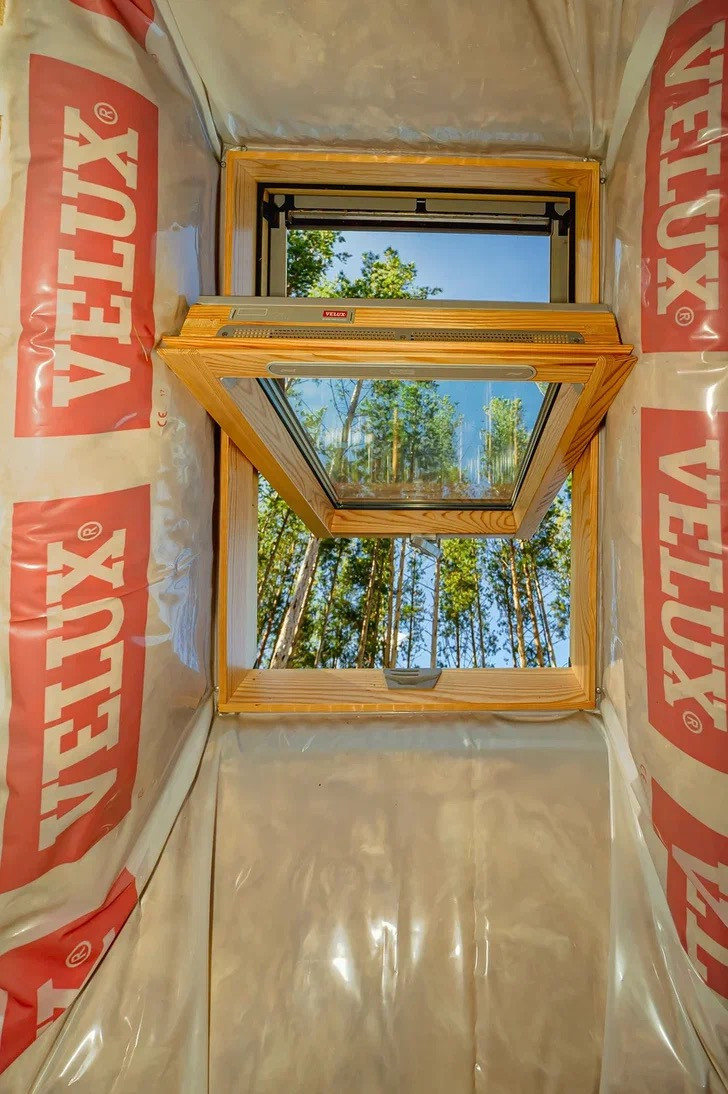 Над третьим этажом предусмотрено чердачное помещение крыши. Кровля крыши включает пароизоляцию, утеплитель Эковер базальтовый, кровельной пленку, контробрешетку, плита OSB (12 мм), подкладочный ковер и двухслойная гибкая черепица Технониколь «Зуб дракона», цвет Алабама, вентилируемые фасадные панели Döcke premium, цвет Пломбир и металлическую белую водосточную систему.