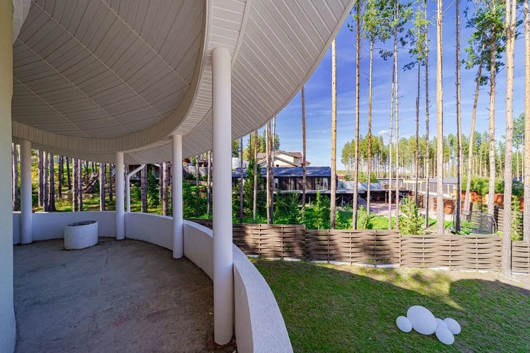 Первый этаж: представляет собой круглую планировку с панорамными окнами и возможностью выхода в сосновый бор, расположенный прям на участке. Высота потолков 3 м.
