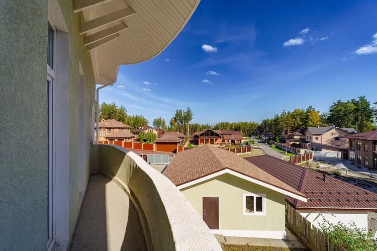 Второй этаж: представляет собой прямоугольную планировку с круглыми и прямоугольными окнами и с возможностью выхода на 3 балкона с высокими дверями. Высота потолков 3 м.