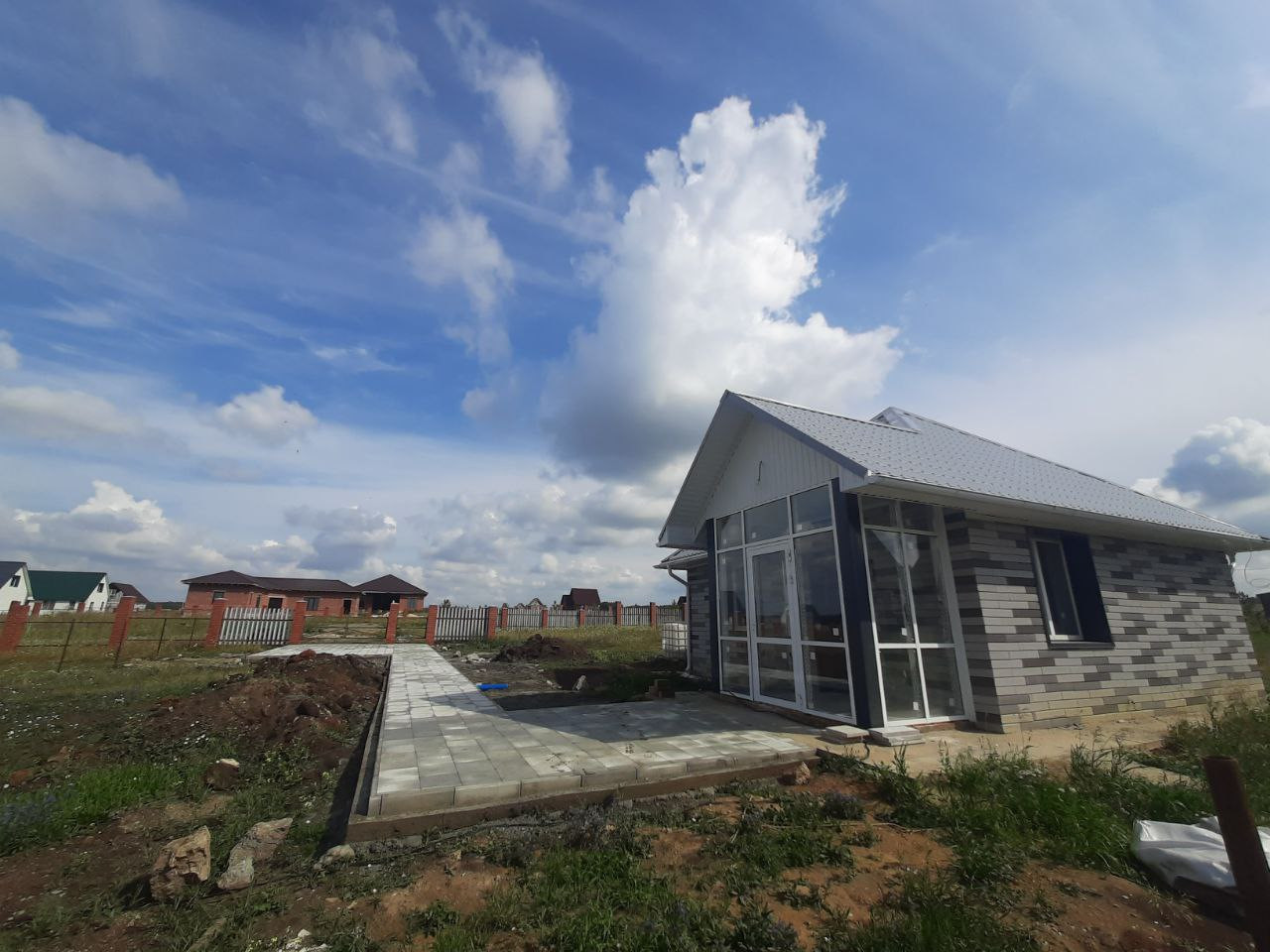 Благоустройство участка включает в себя: ограждение участка (евроштакетник, высота 1,5м), тротуарная плитка (дорожка к дому, парковочное место).