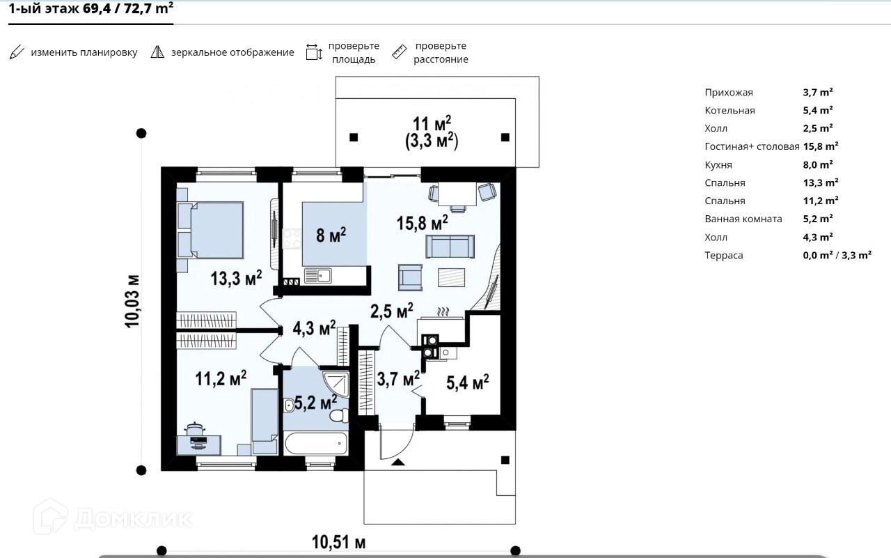 Общая площадь 69.4 м2