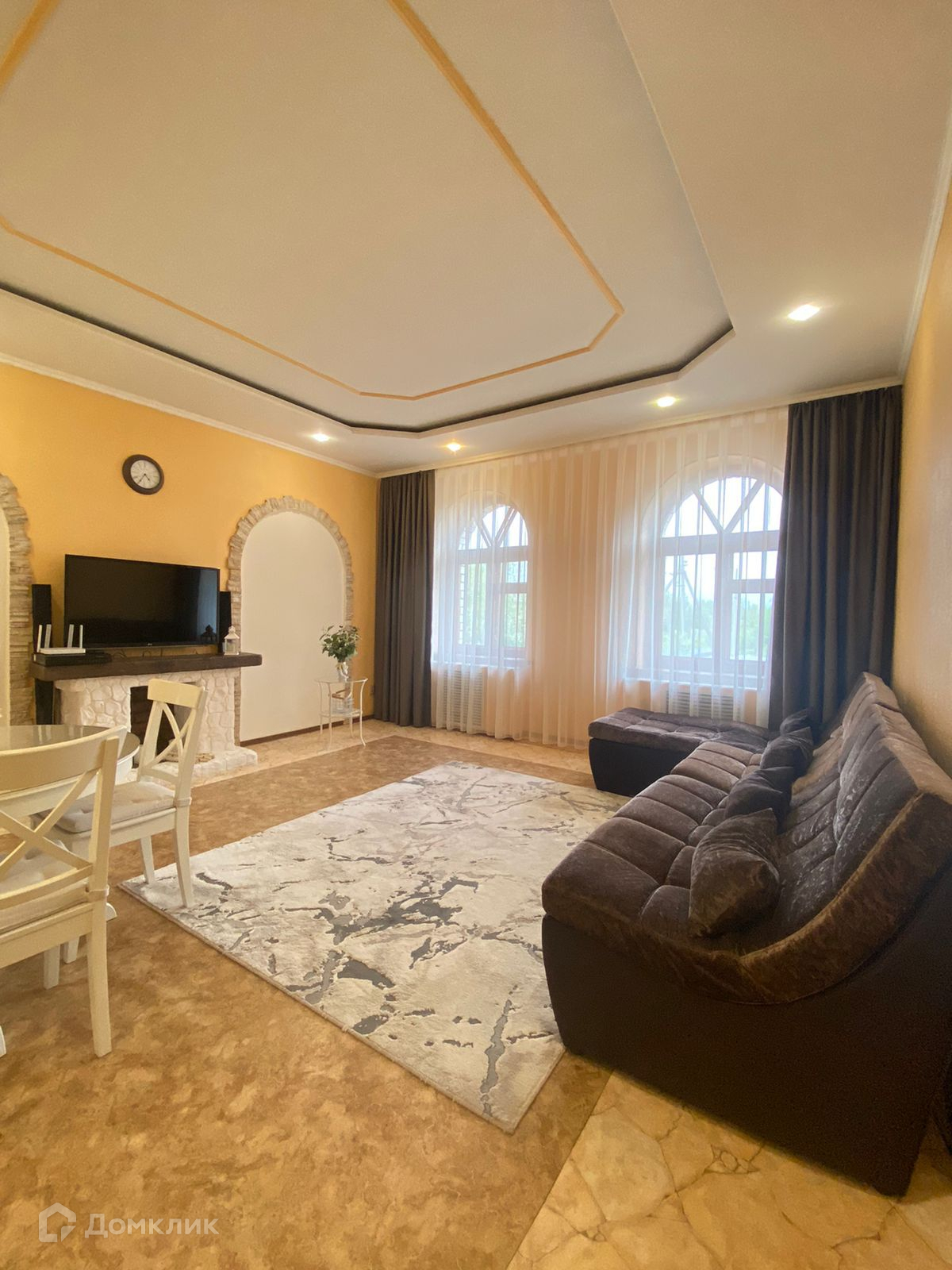 Кухонная зона меблирована встроенными духовым шкафом, газовой варочной поверхностью, вытяжкой, микроволновой печью и холодильником, есть выход на балкон и к беседке. В гостиной комнате стоит диван и столовая мебель. На первом этаже предусмотрена русская баня на дровах и помещение свободного назначения, из которого можно сделать вторую баню и увеличить прибыль. На втором этаже жилая зона, площадью 132,5 кв.м., комнаты меблированы гарнитуром и техникой. Санузел оборудован душевой.