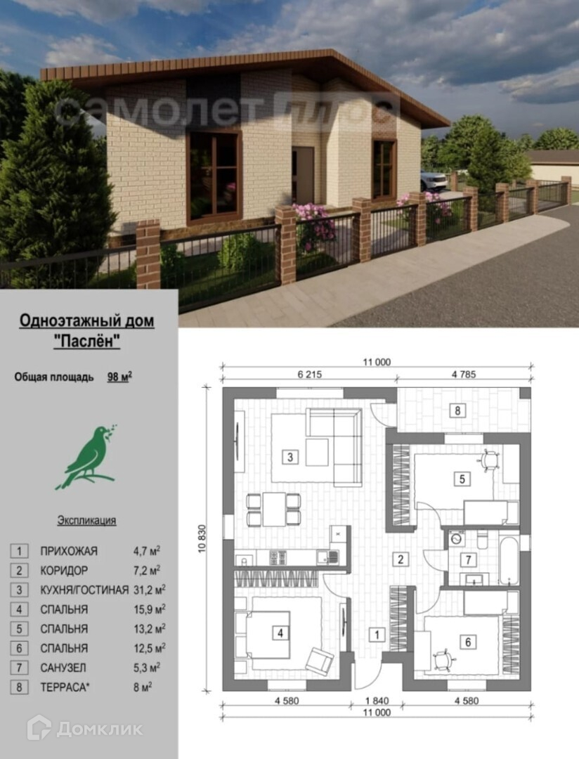 Жилой дом 98 м2, количество комнат - 3, имеется выход на террасу.