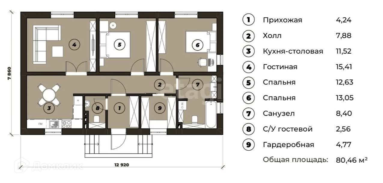 1. три спальные комнаты + кухня-гостиная