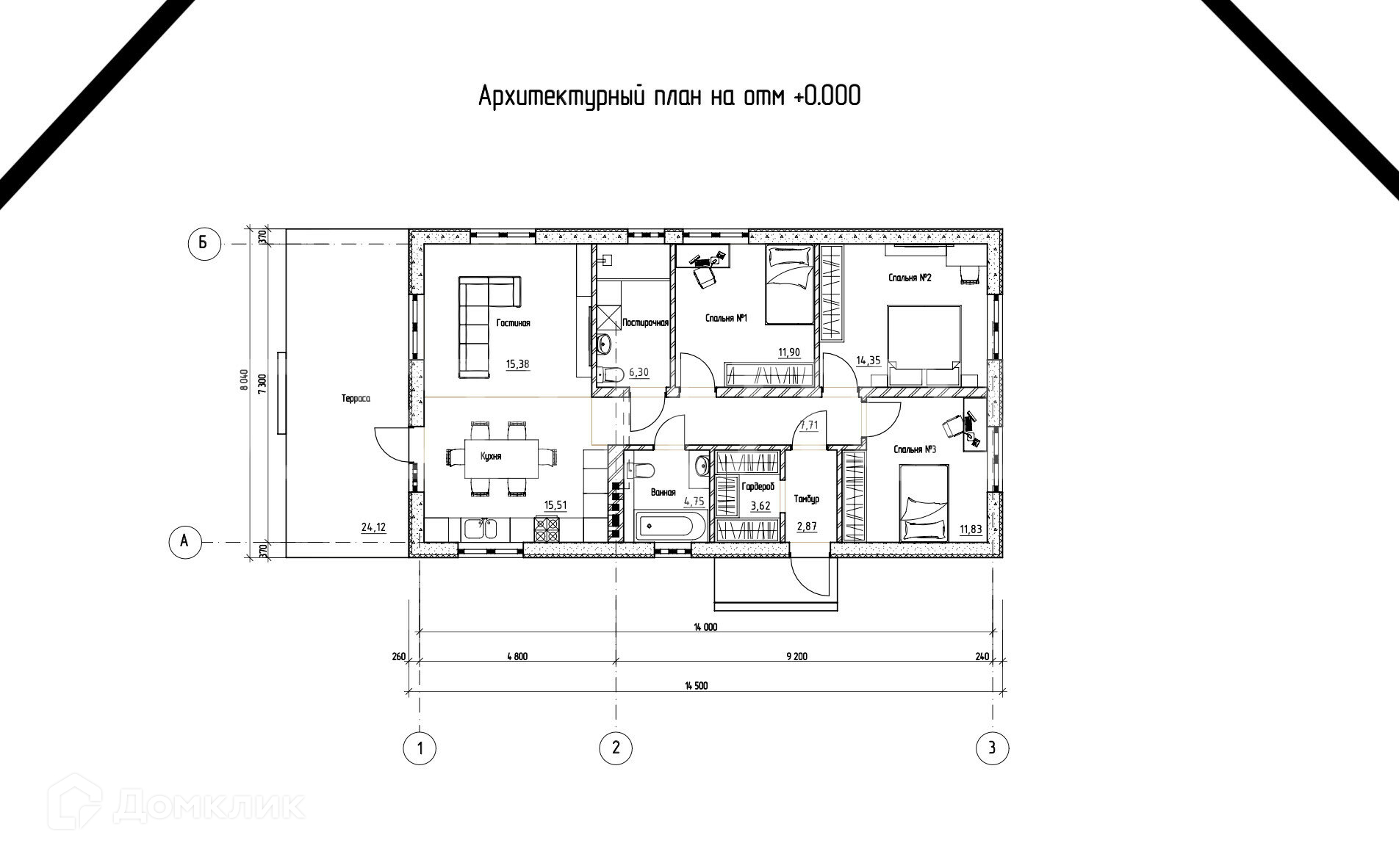3 спальни, кухня гостиная, гардеробная, сан-узел, прачечная, терасса.